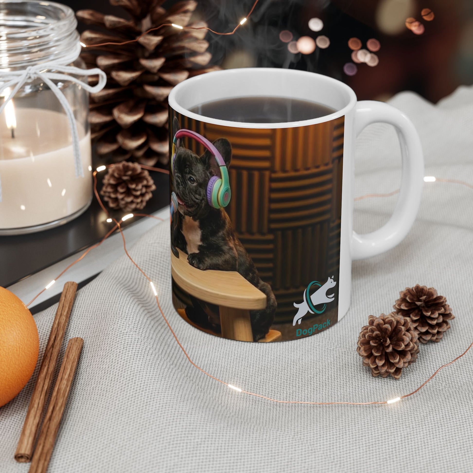 There’s something extra heart-melting about baby Goldie & Frenchie taking the mic — tiny paws perched on the table, oversized headphones slipping over fluffy ears, and two little voices ready for their very first “podcast.” This glossy ceramic mug captures that adorable moment in bright, crisp detail, wrapping your drink in pure puppy charm.