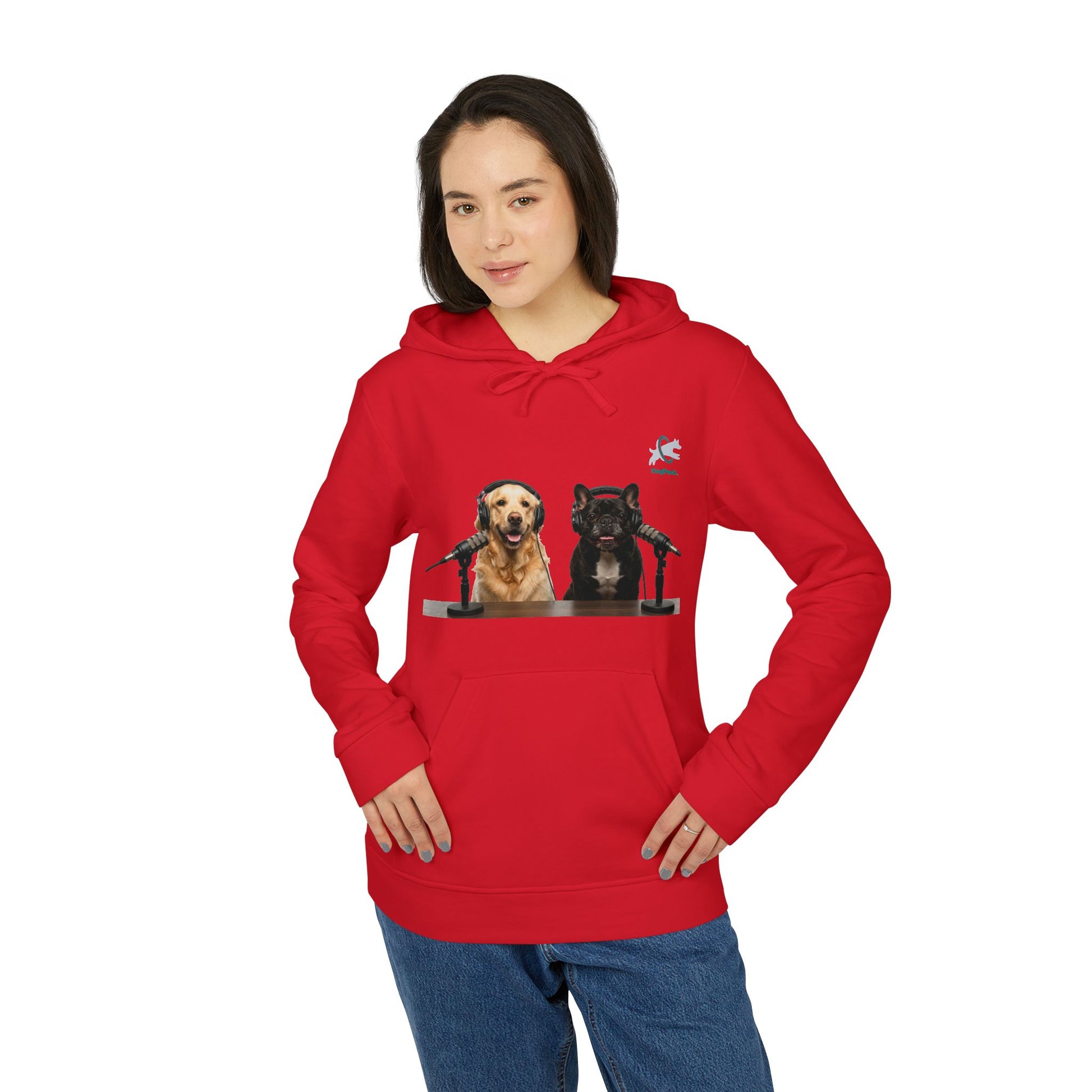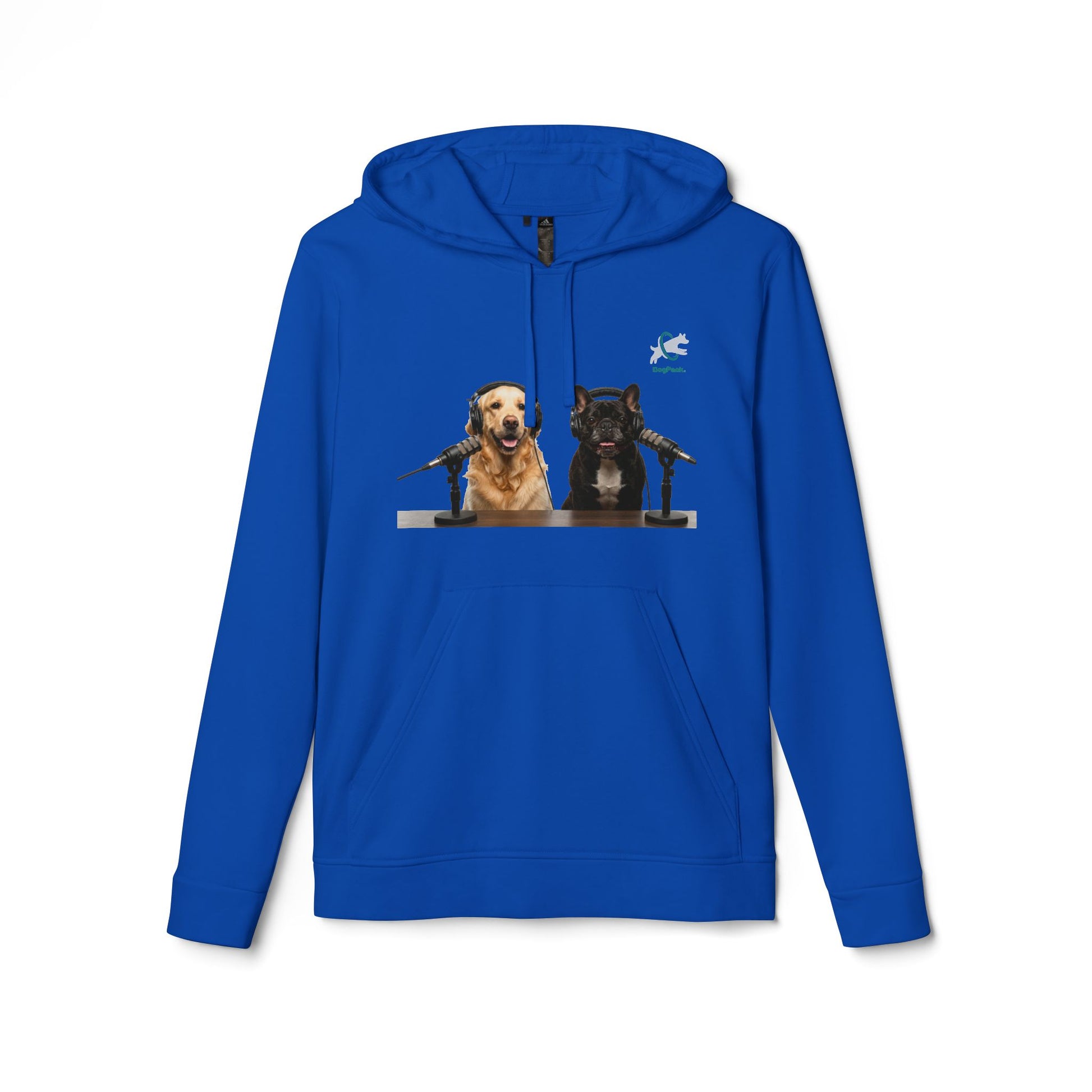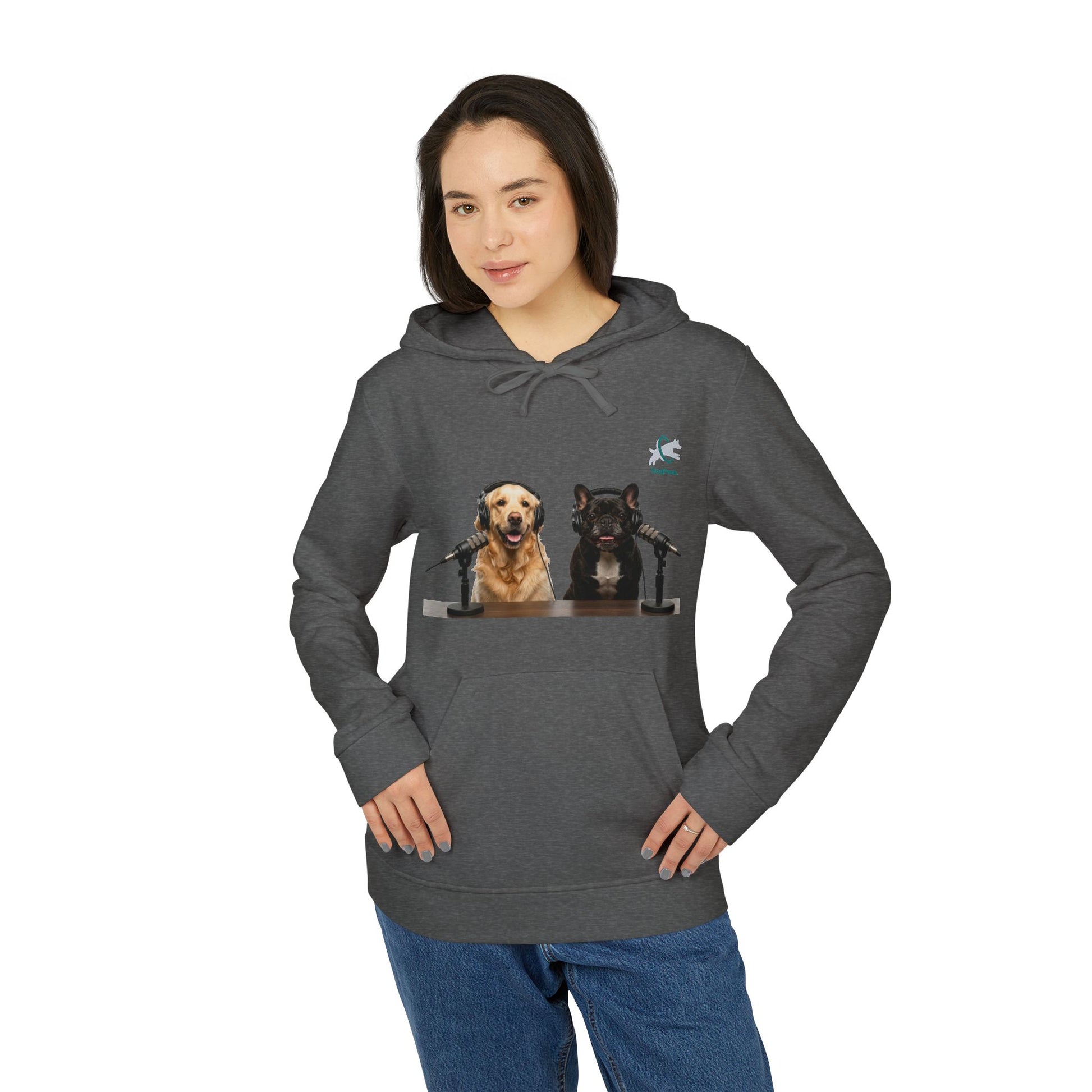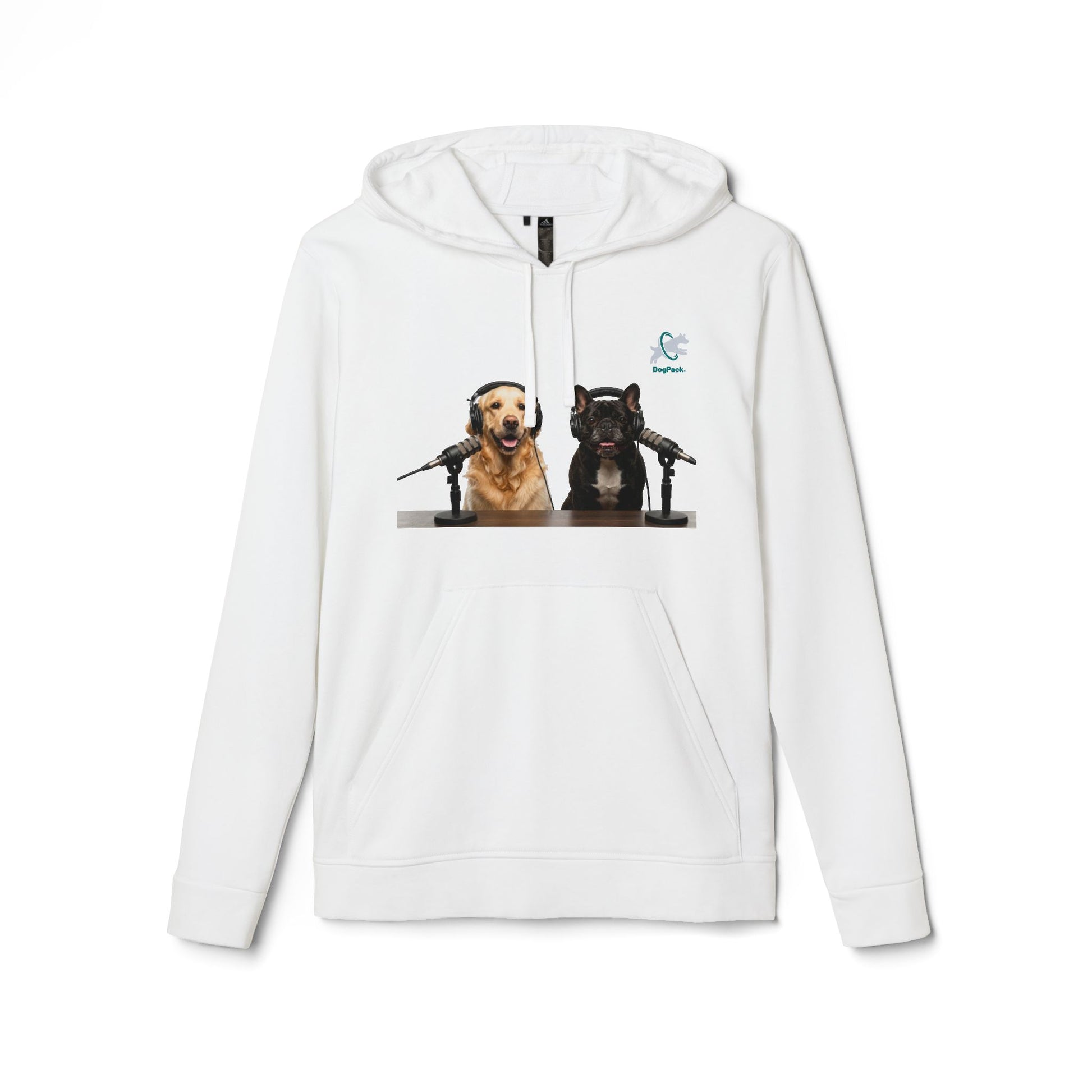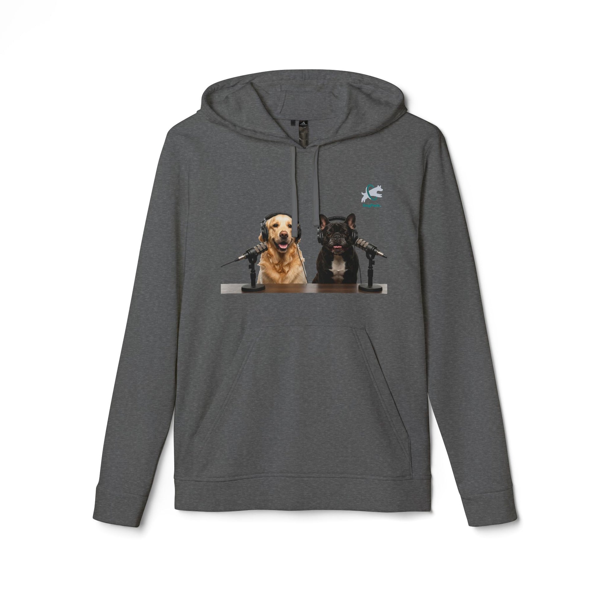 The front artwork features Goldie & Frenchie at the mic — two familiar co-hosts bringing lighthearted studio energy wherever you go. Subtle athletic details, including the contrast adidas logo on the sleeve and sewn-in labels, give the hoodie a clean, sporty finish while keeping the focus on the original artwork. Easy to layer and effortless to wear, this hoodie feels like a comfortable companion for dog walks, recording sessions, or winding down at home.