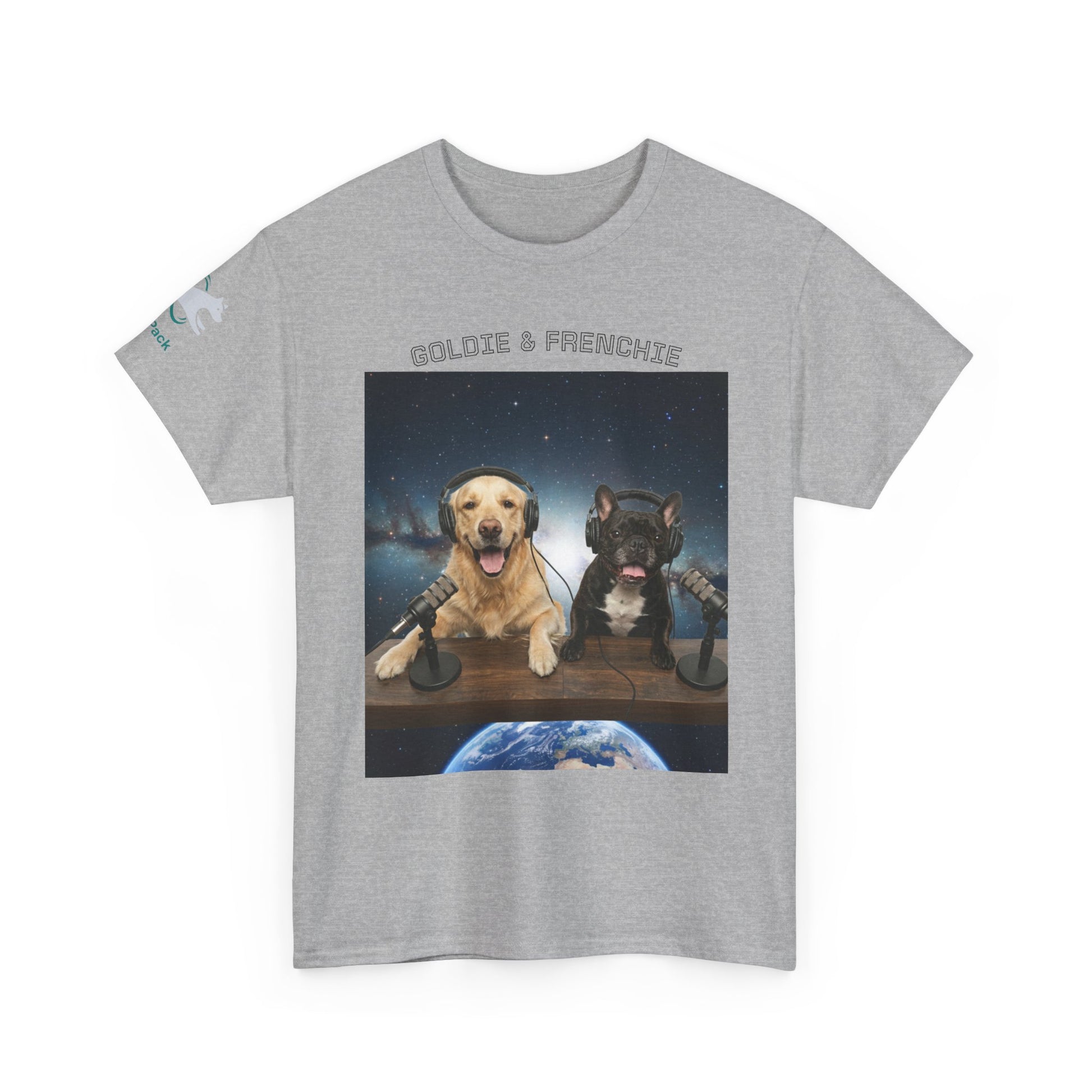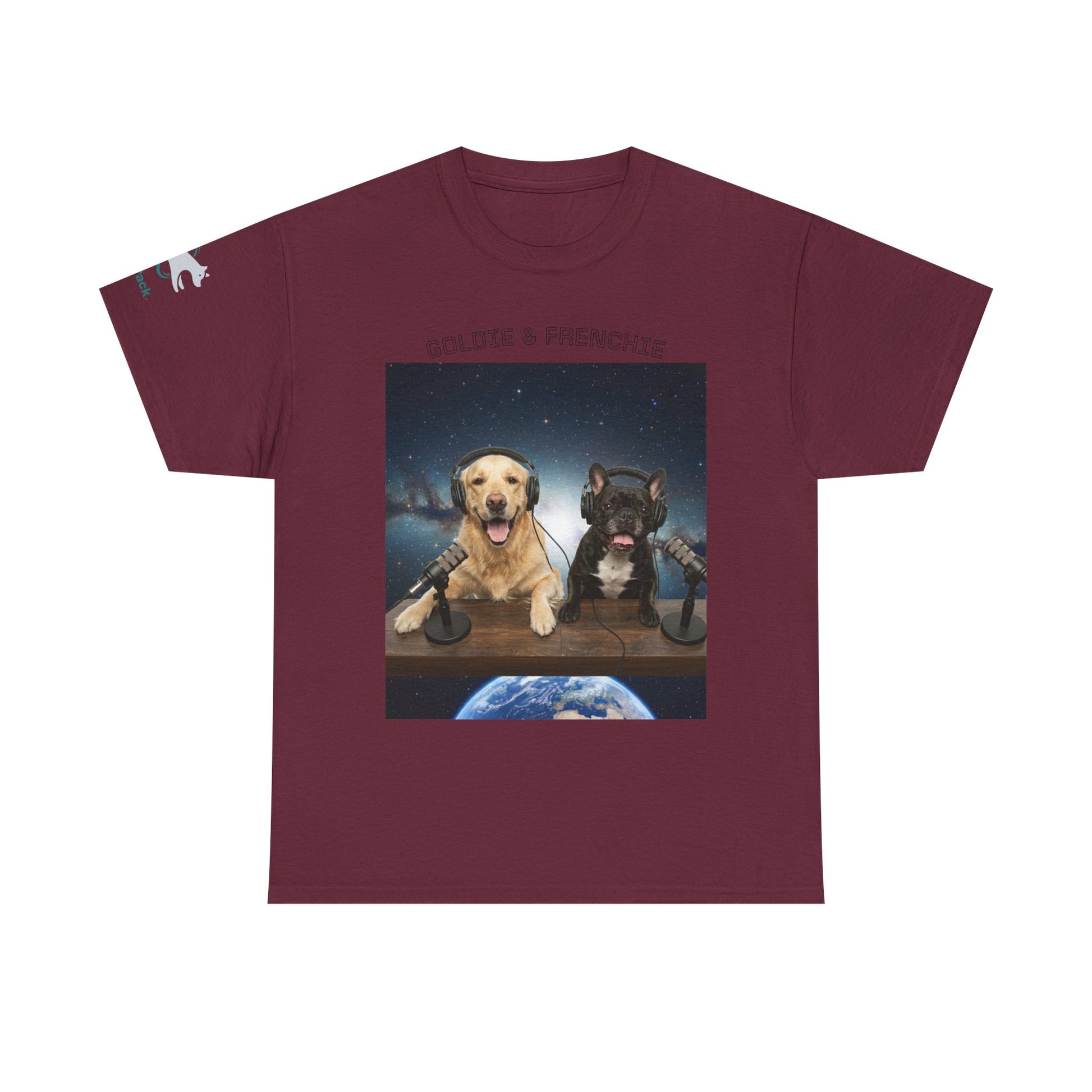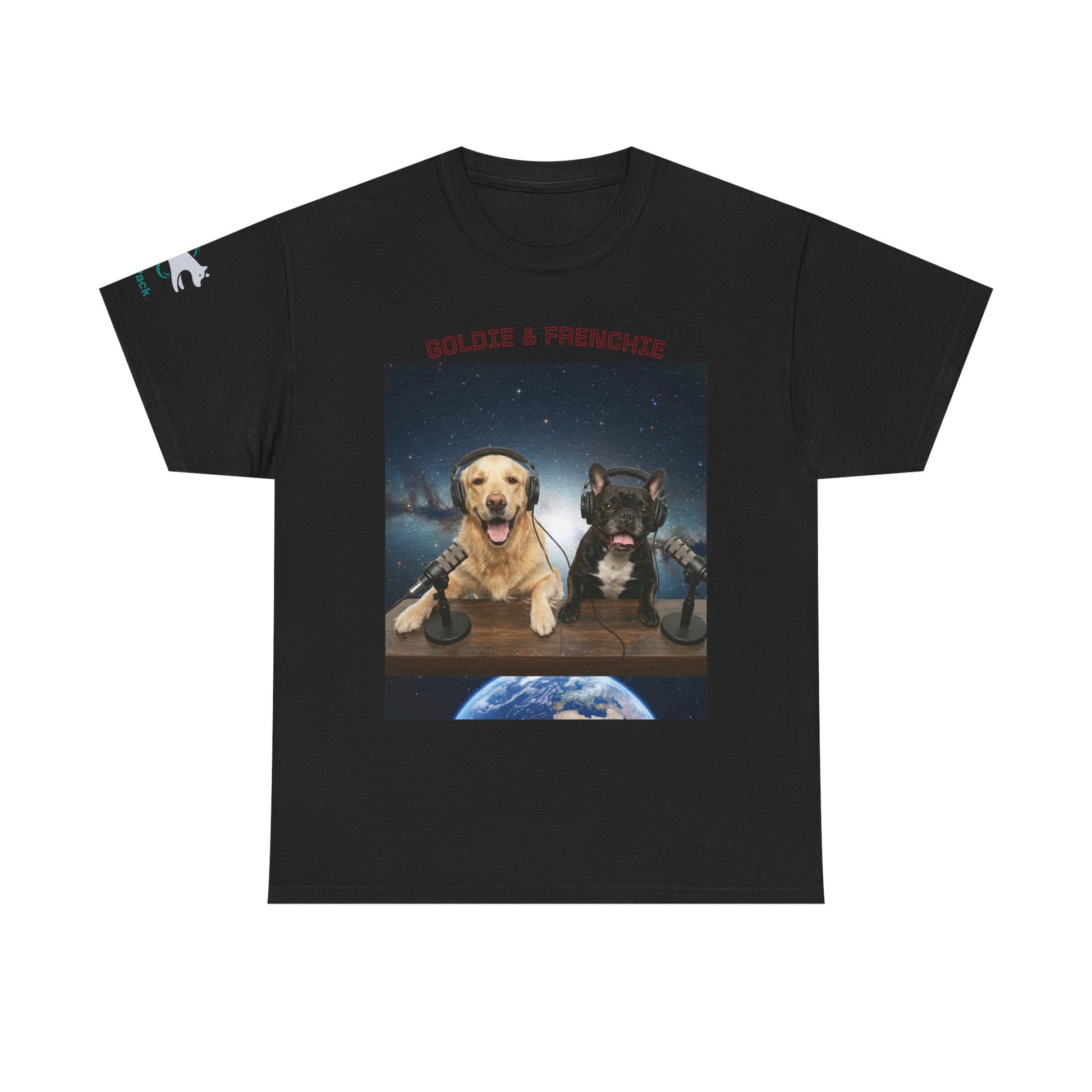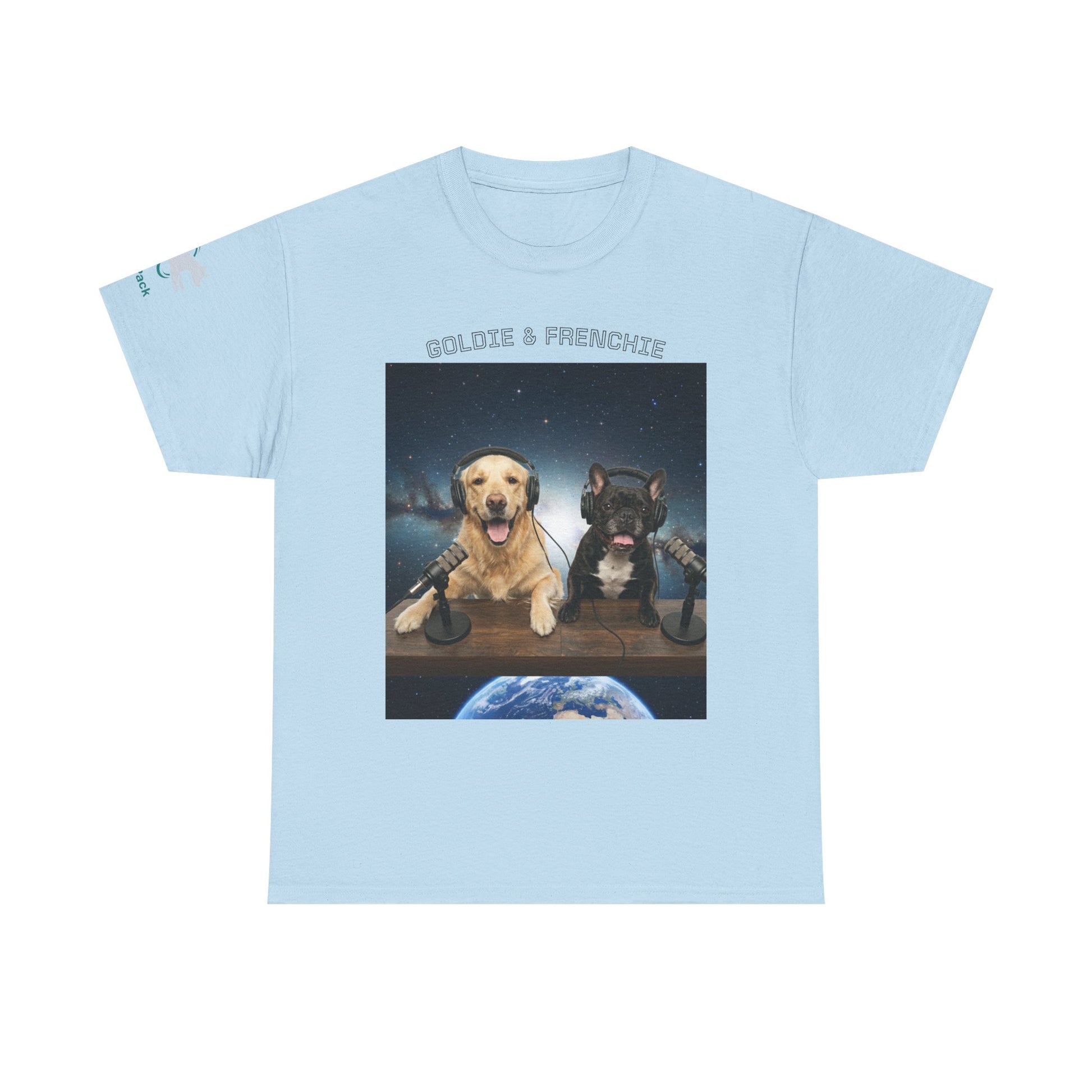 Slip into a soft, dependable tee that brings Goldie & Frenchie right into your day. This classic crewneck features a vivid, full-color print of the duo behind their microphones with a playful space backdrop — a scene that blends humor, warmth, and that unmistakable G&F charm. The medium-weight cotton keeps its shape and holds detail beautifully, so the artwork stays crisp through countless washes. Easygoing and versatile, it’s the kind of shirt you reach for on relaxed mornings, dog-walking afternoons, or nights when you want to represent your favorite podcasting pair without overthinking it.