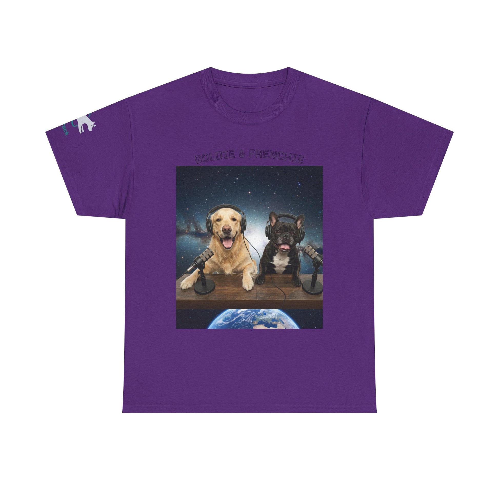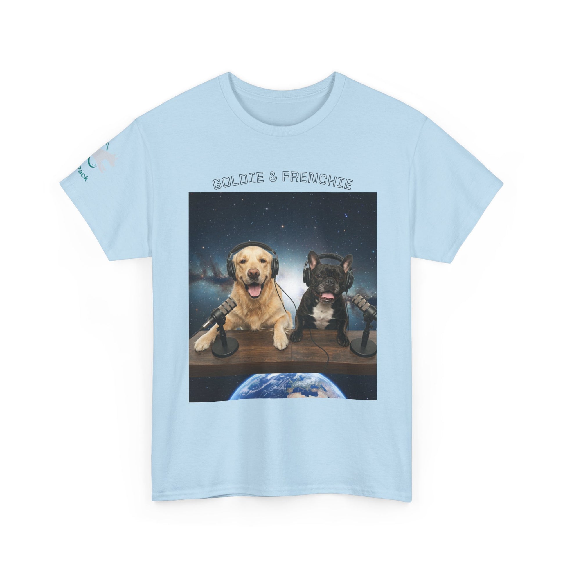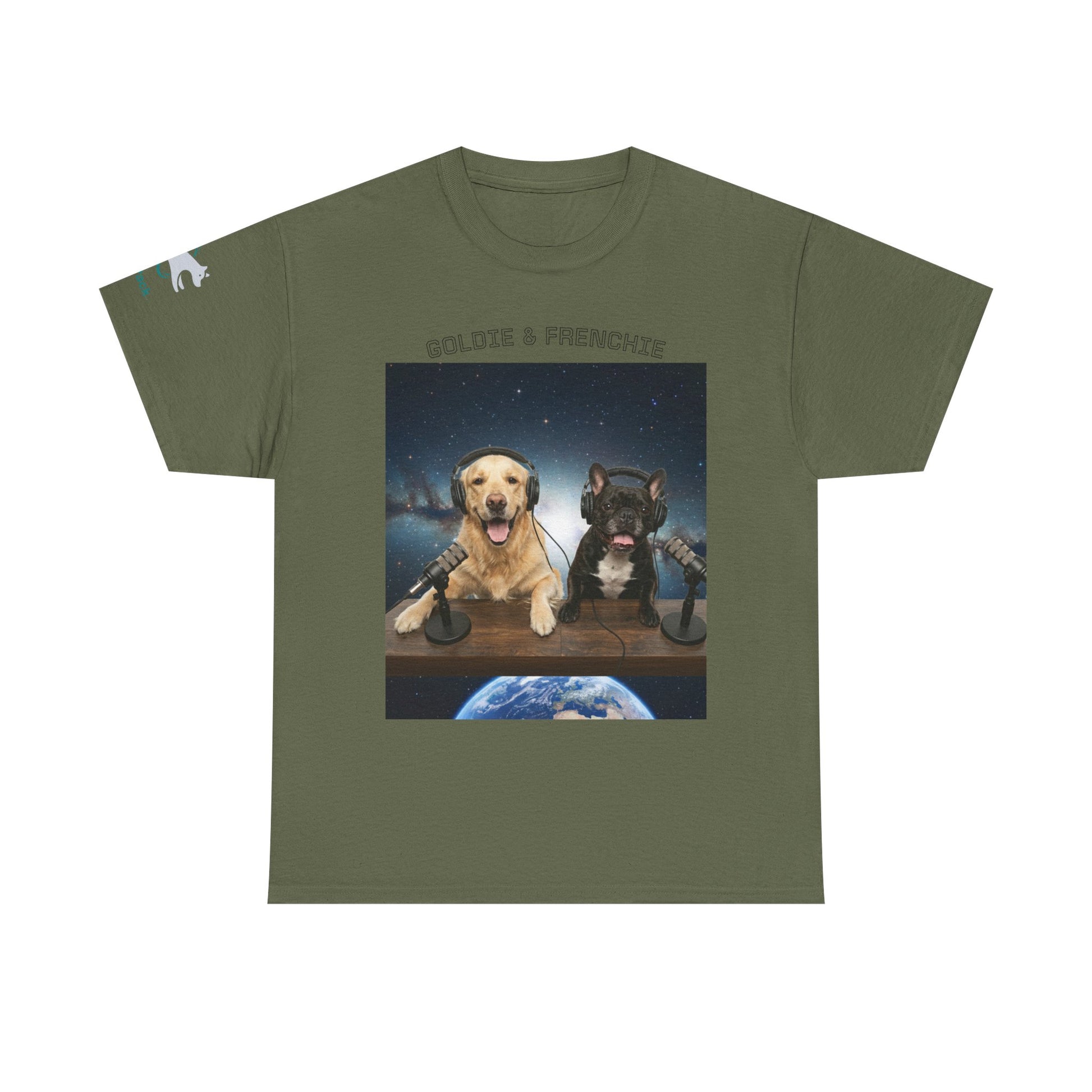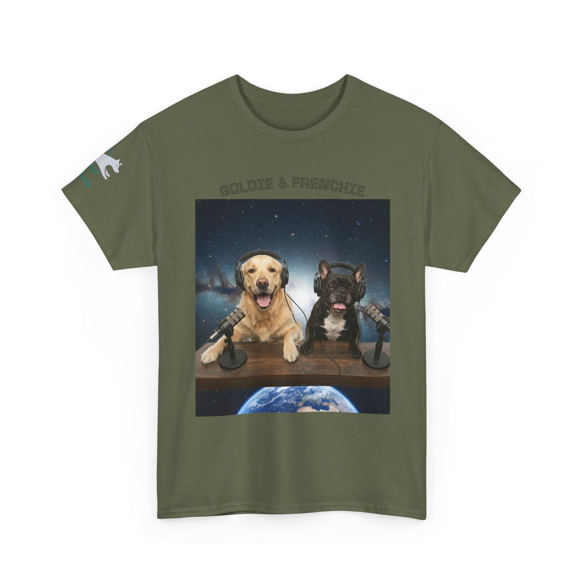 Slip into a soft, dependable tee that brings Goldie & Frenchie right into your day. This classic crewneck features a vivid, full-color print of the duo behind their microphones with a playful space backdrop — a scene that blends humor, warmth, and that unmistakable G&F charm. The medium-weight cotton keeps its shape and holds detail beautifully, so the artwork stays crisp through countless washes. Easygoing and versatile, it’s the kind of shirt you reach for on relaxed mornings, dog-walking afternoons, or nights when you want to represent your favorite podcasting pair without overthinking it.