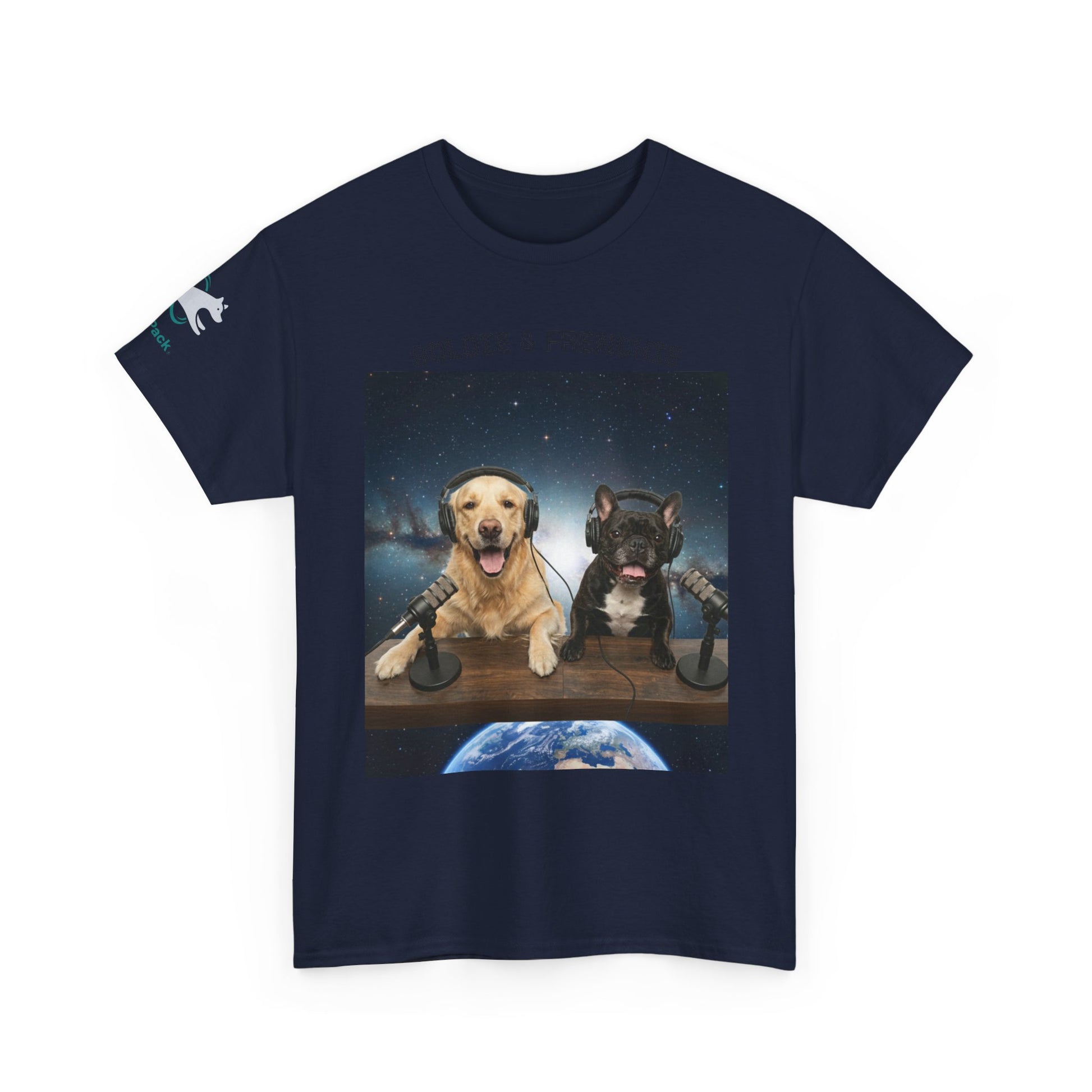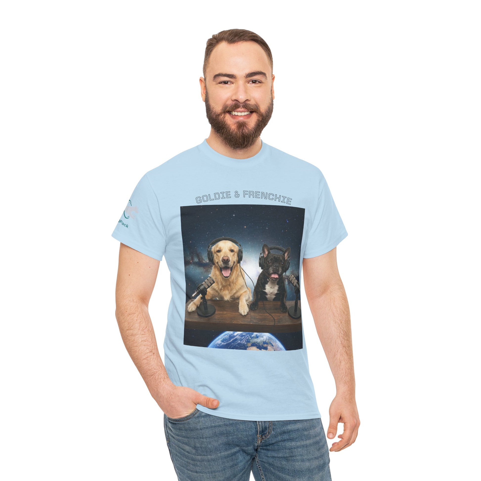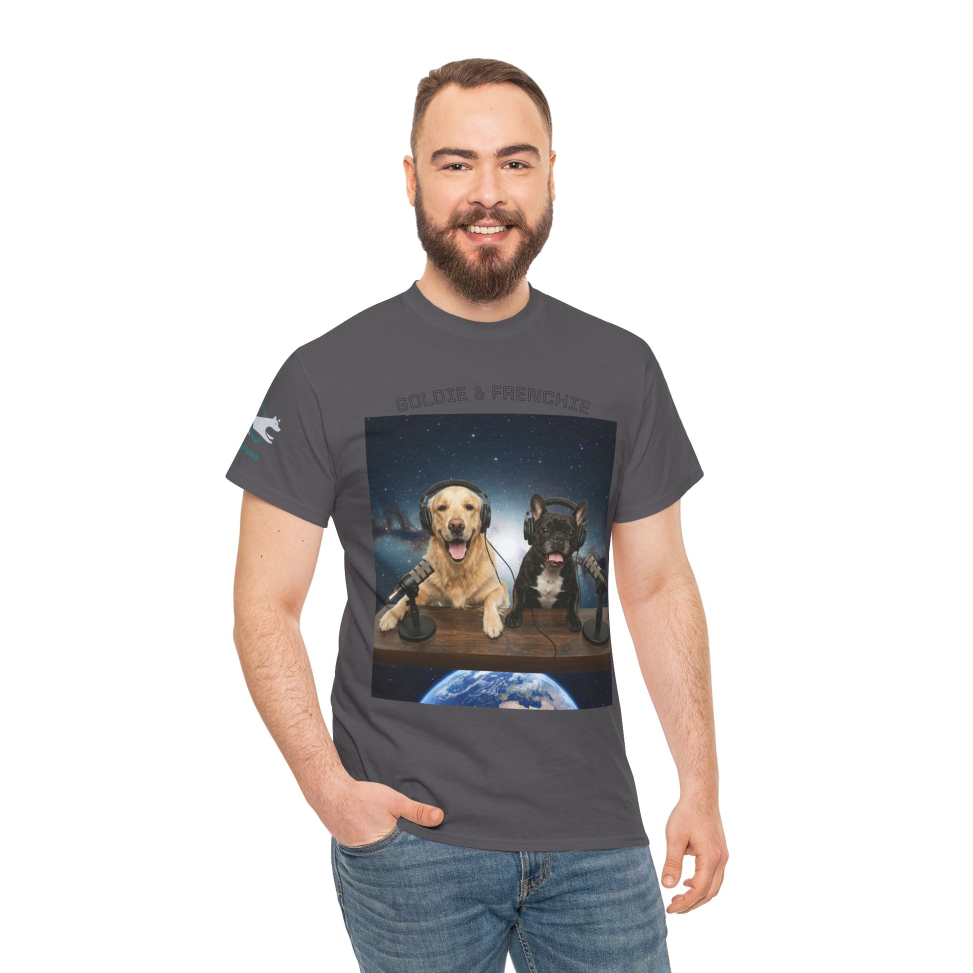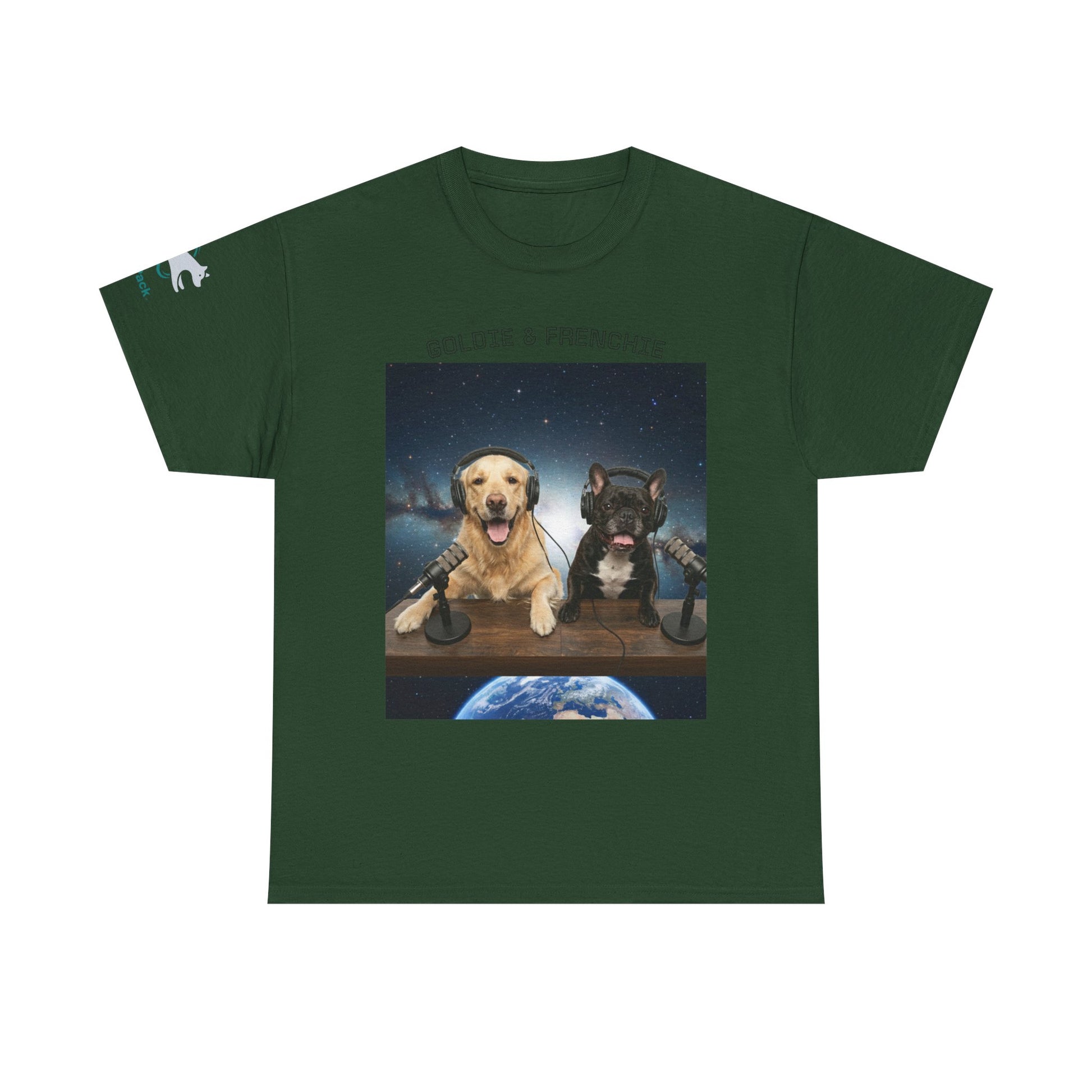 Slip into a soft, dependable tee that brings Goldie & Frenchie right into your day. This classic crewneck features a vivid, full-color print of the duo behind their microphones with a playful space backdrop — a scene that blends humor, warmth, and that unmistakable G&F charm. The medium-weight cotton keeps its shape and holds detail beautifully, so the artwork stays crisp through countless washes. Easygoing and versatile, it’s the kind of shirt you reach for on relaxed mornings, dog-walking afternoons, or nights when you want to represent your favorite podcasting pair without overthinking it.