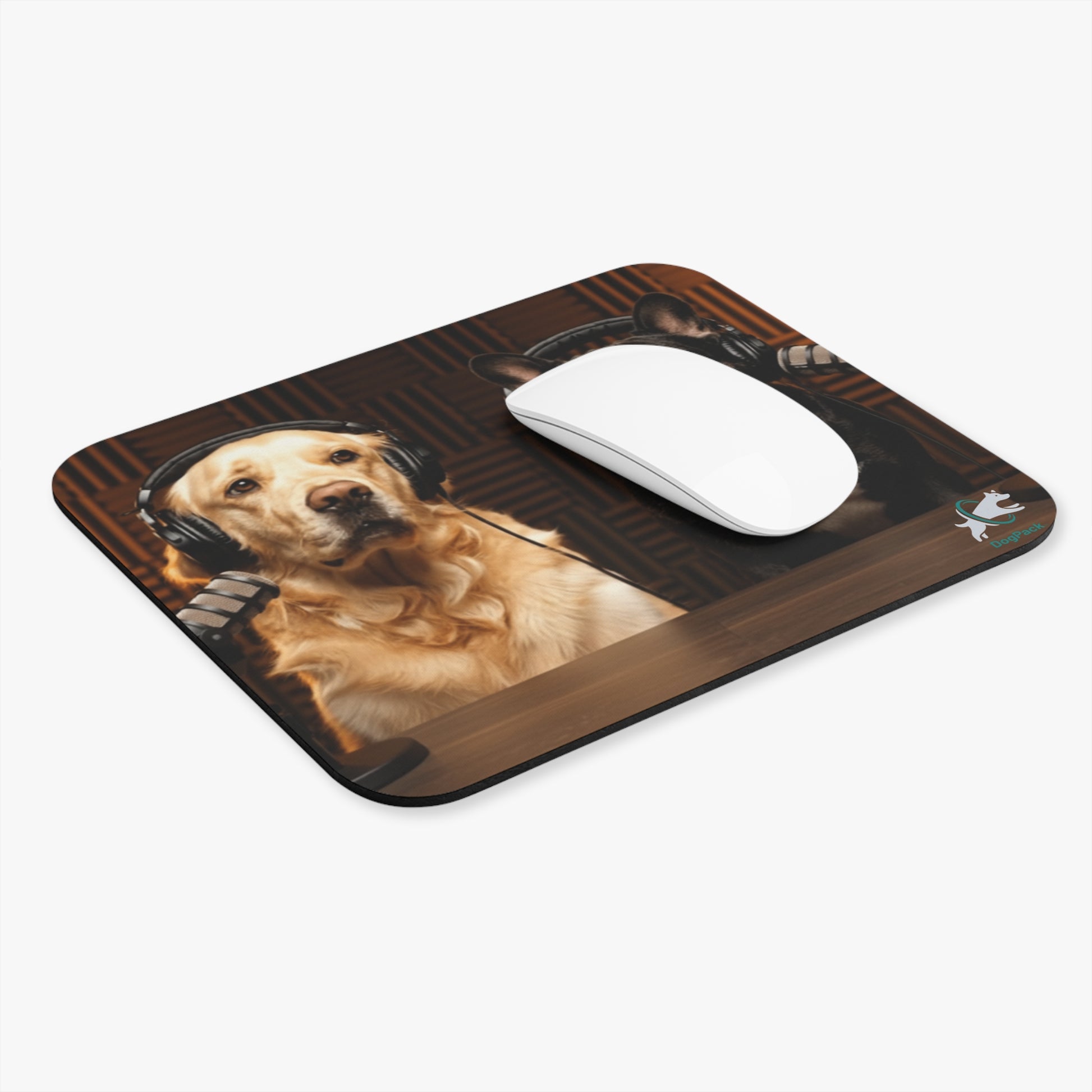 Two earnest hosts sit behind the mic — Goldie in full golden glow and Frenchie steady and focused — both wearing headphones and ready to record. This rectangular mouse pad brings that inviting studio atmosphere straight to your desk. Rich, warm tones and crisp details spread across a smooth, low-friction surface that keeps your mouse gliding effortlessly through edits, emails, or late-night sessions. The non-slip rubber base keeps everything anchored, while the slim profile slides neatly under your keyboard without adding bulk.