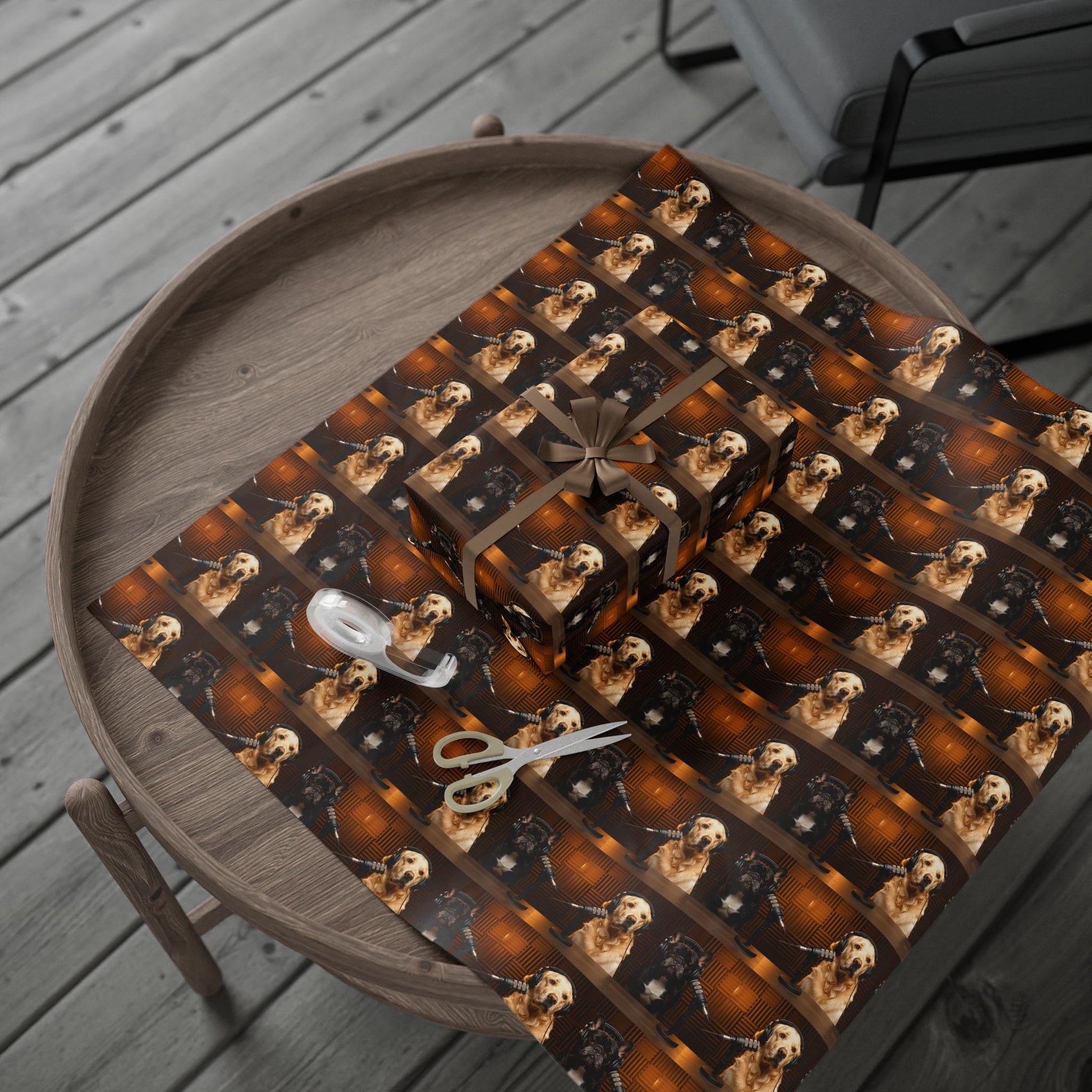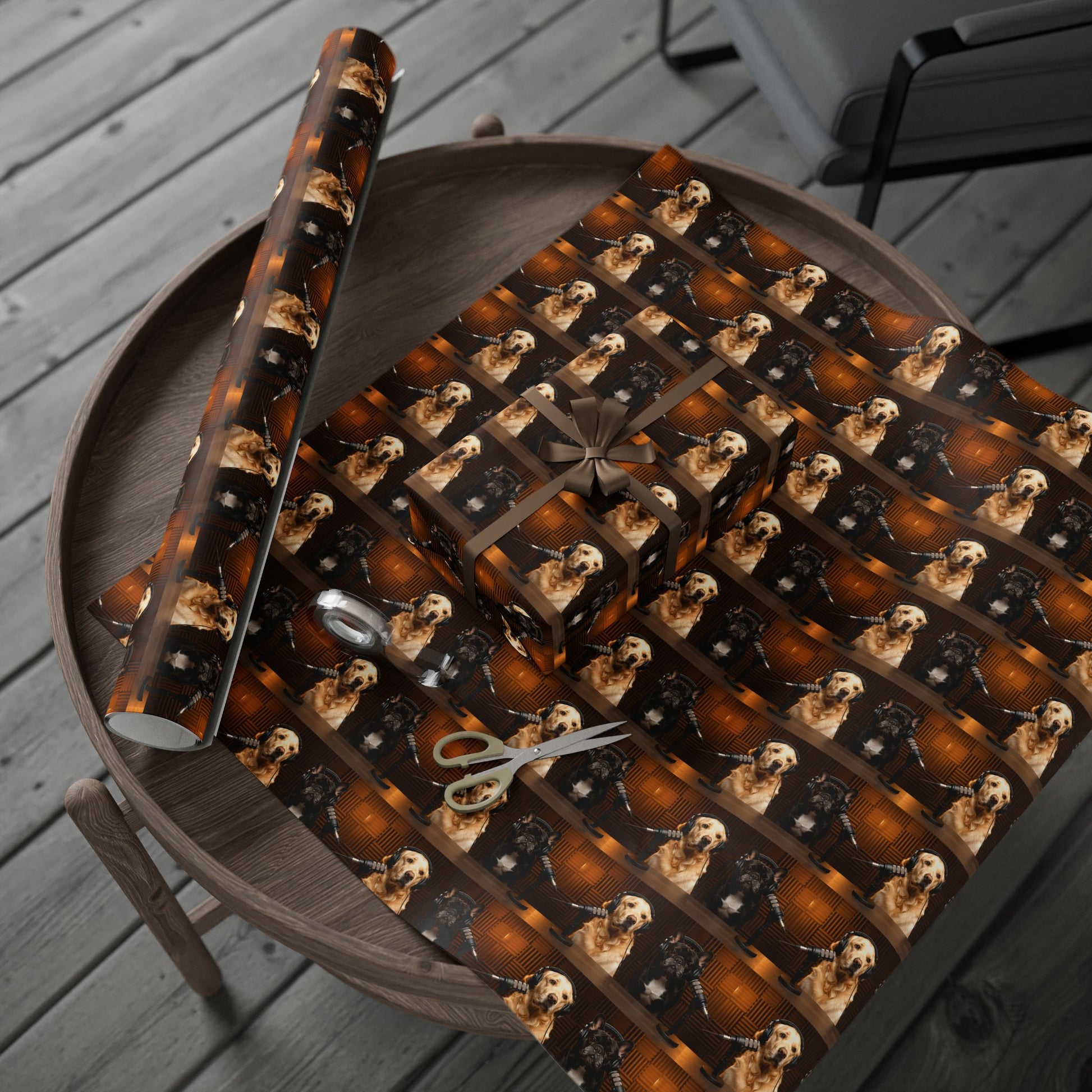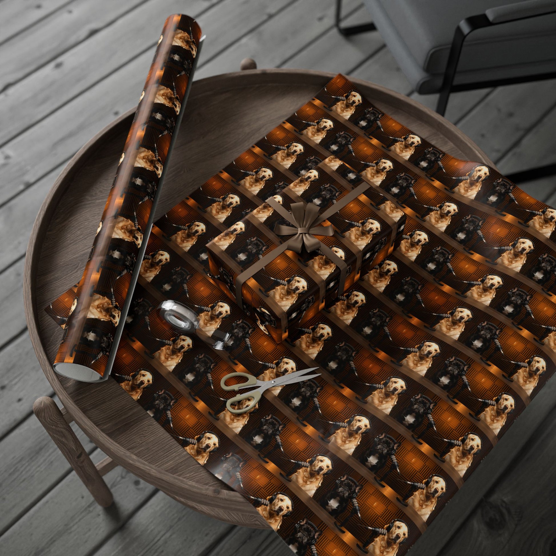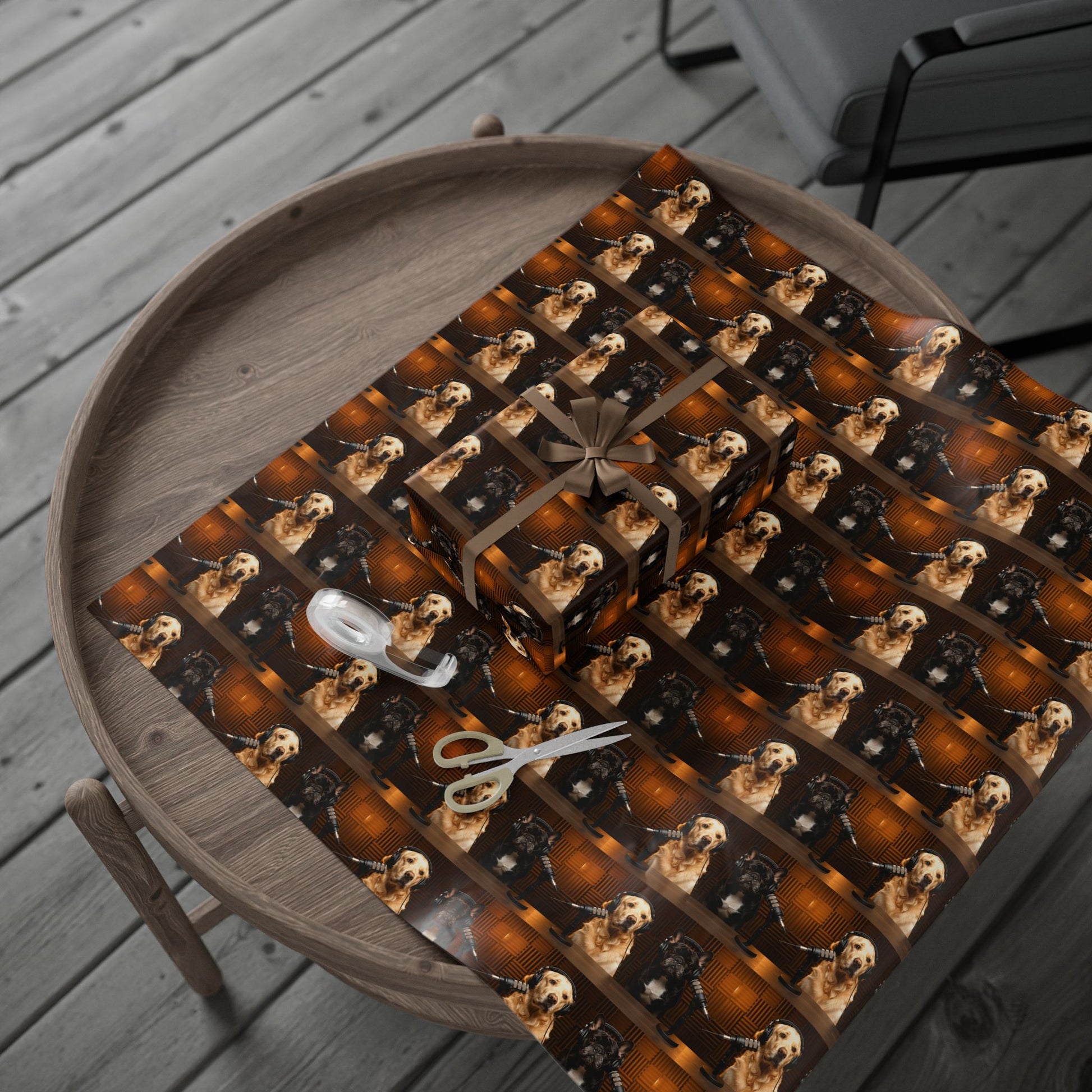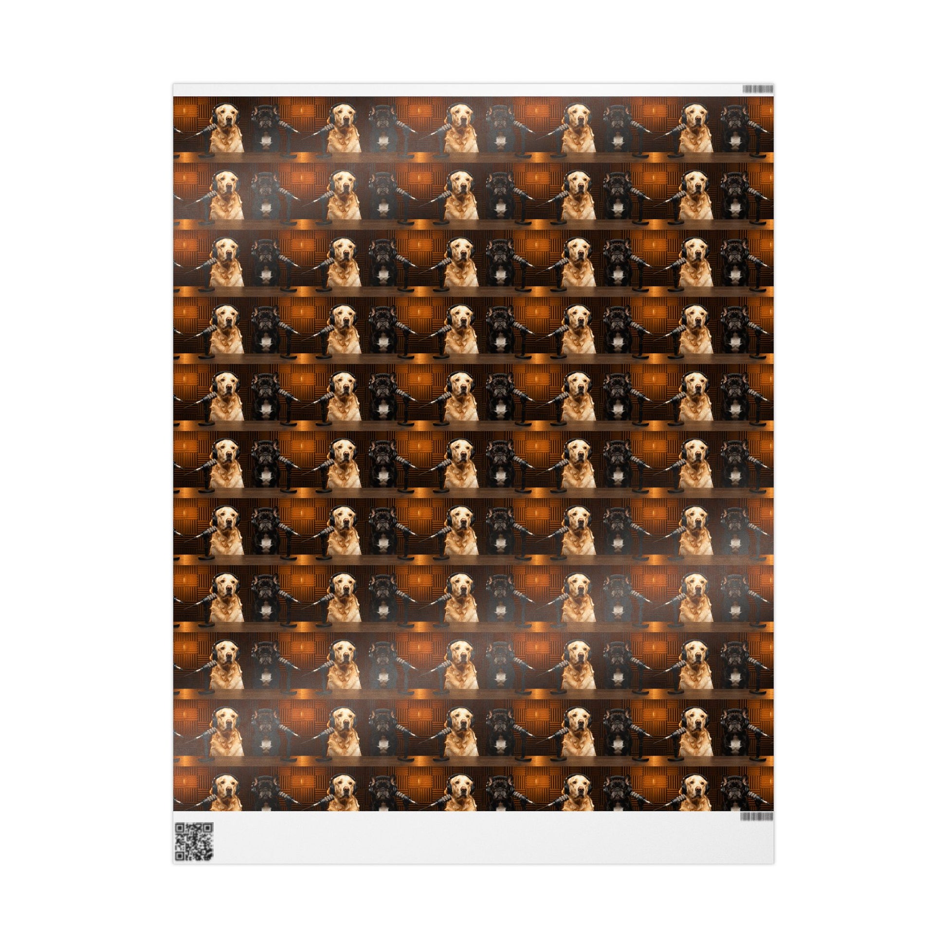 This wrapping paper features Goldie & Frenchie in a classic digital studio setting, captured in warm, cinematic lighting that feels rich, cozy, and timeless. The repeating pattern showcases the duo behind the mic in a polished, professional scene that looks like a real podcast studio moment frozen in time. It has a refined, atmospheric feel rather than a graphic or pop-art style, making it perfect for gifts that deserve something special and thoughtfully designed.