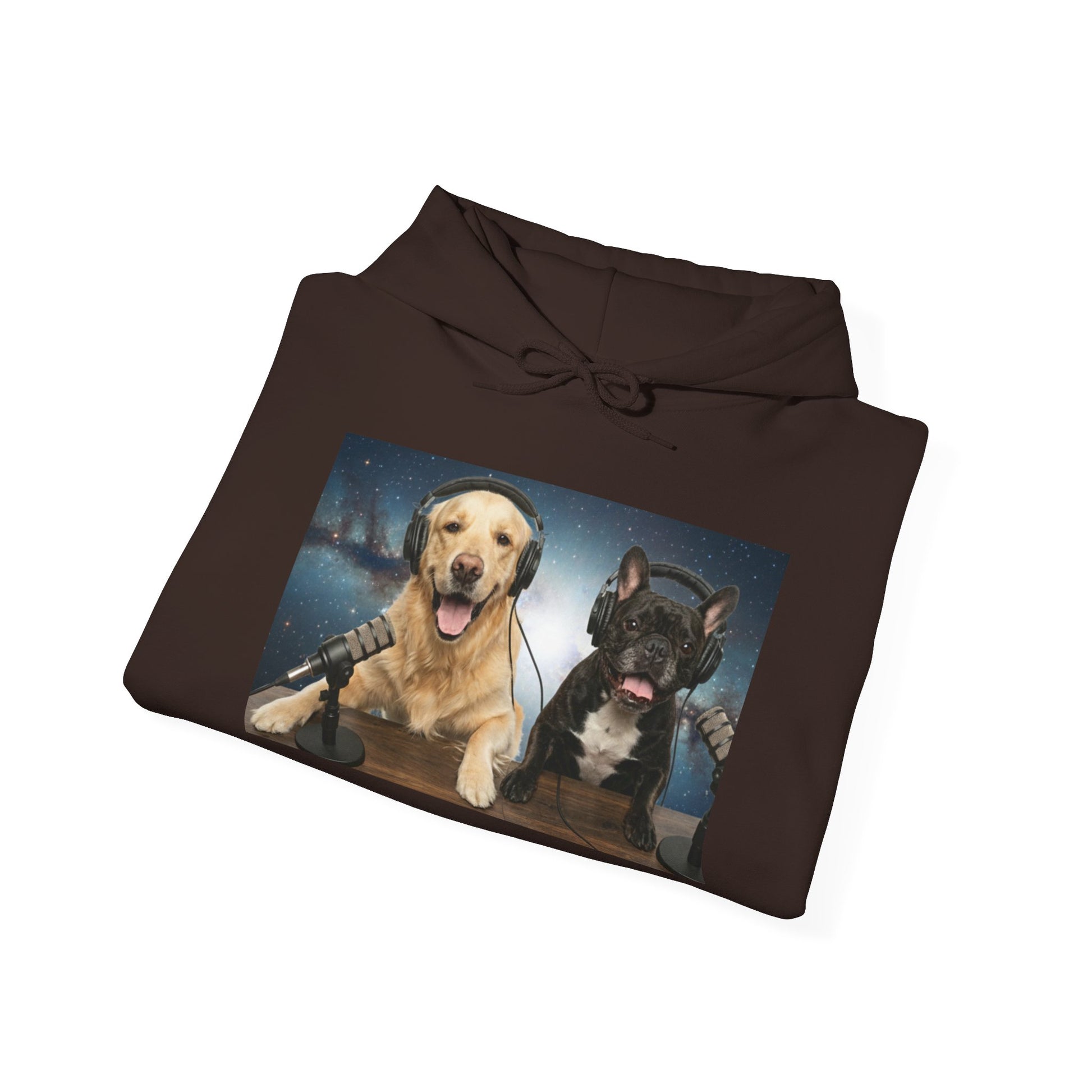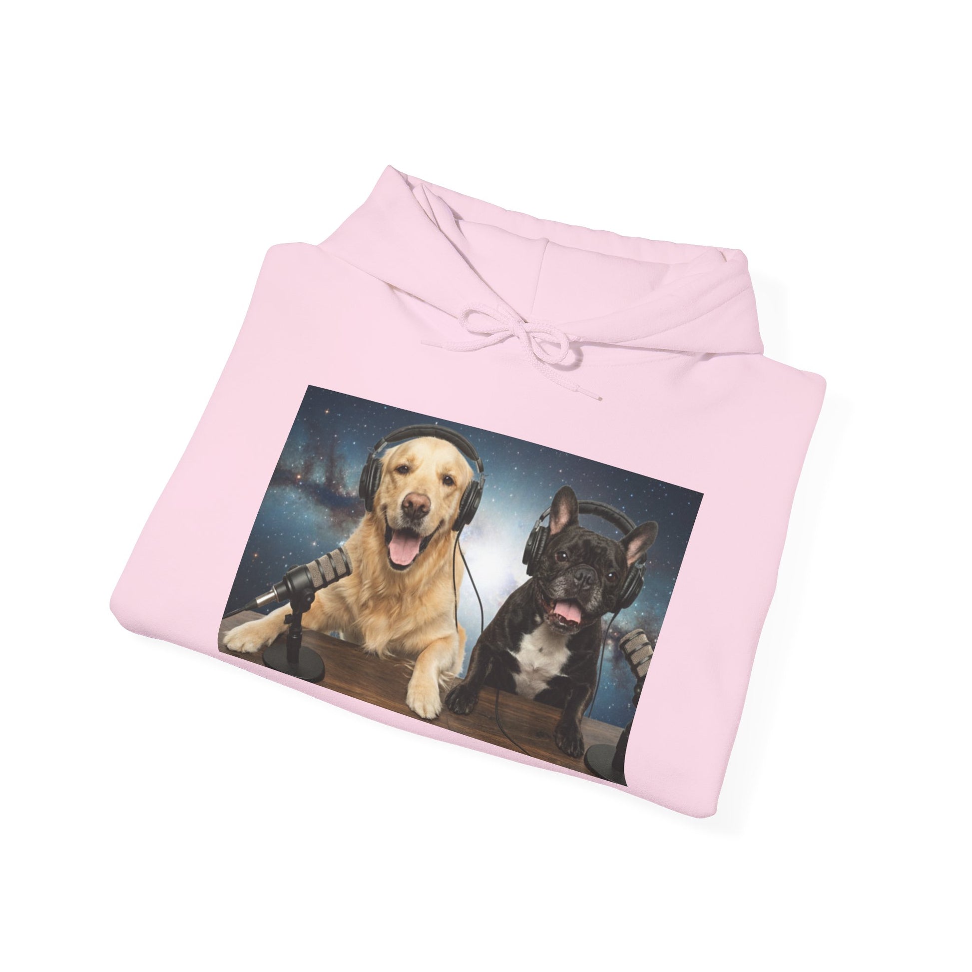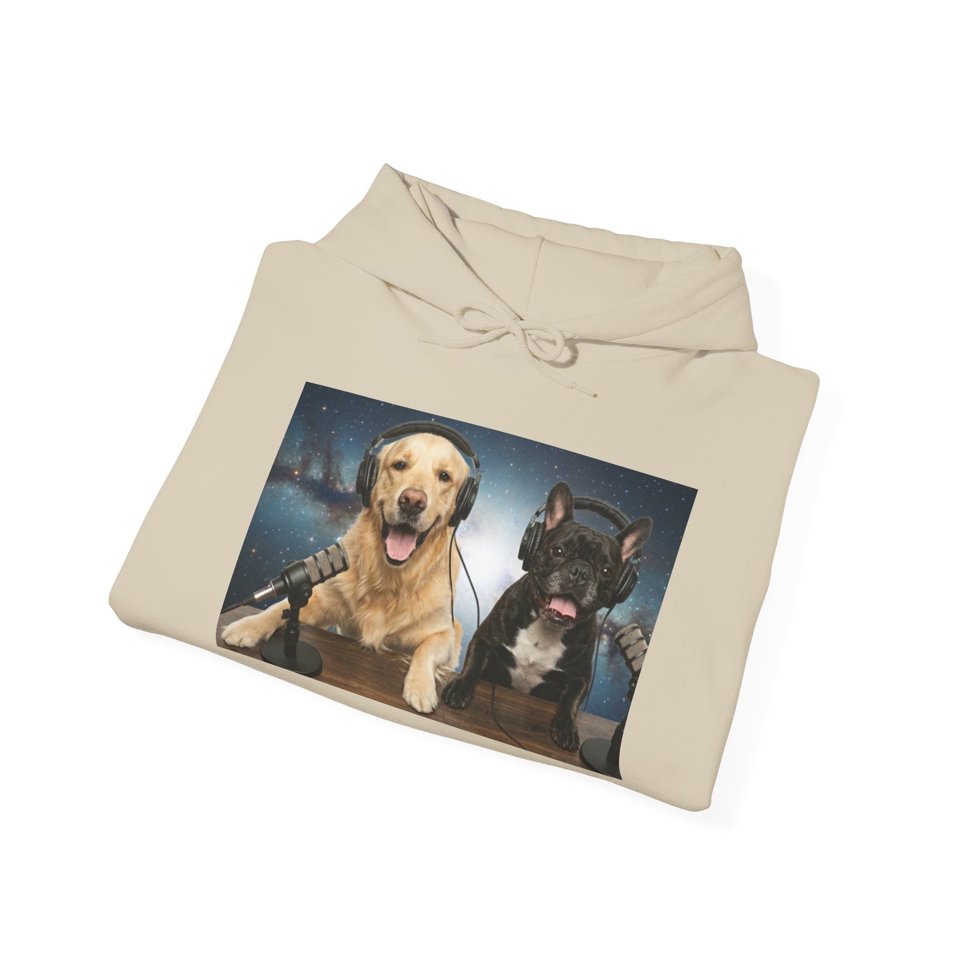 This cozy hoodie celebrates the charm of Goldie & Frenchie — two loyal, lovable co-hosts who bring joy to every episode. The front features a vibrant print of the boys at their podcast desk, headphones on, ready to share stories from across the galaxy. Soft mid-weight fabric wraps you in comfort, making it the perfect layer for evening walks, weekend coffees, or winding down on the couch. Subtle sleeve artwork adds personality without overpowering the design, letting Goldie & Frenchie stay the stars of the show.