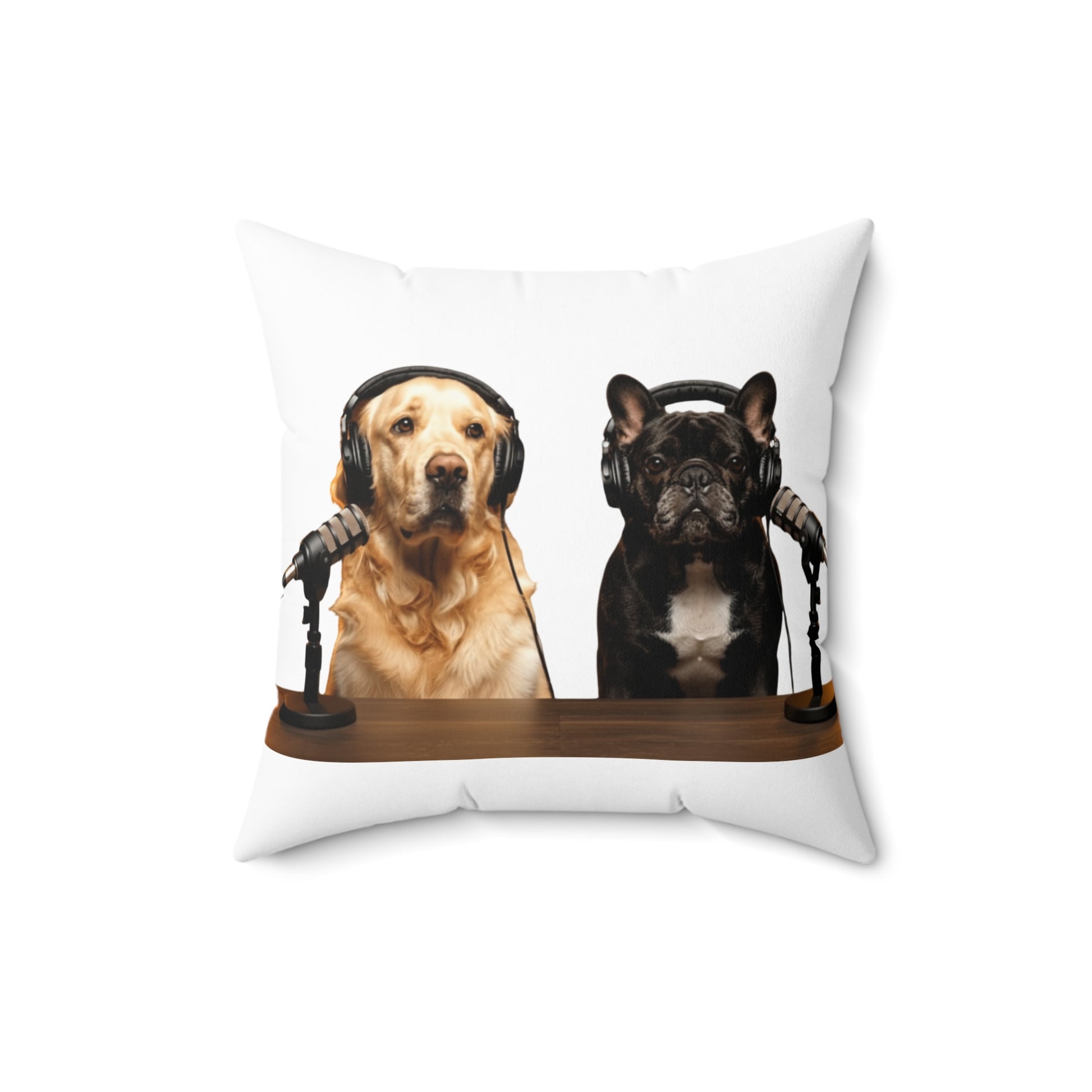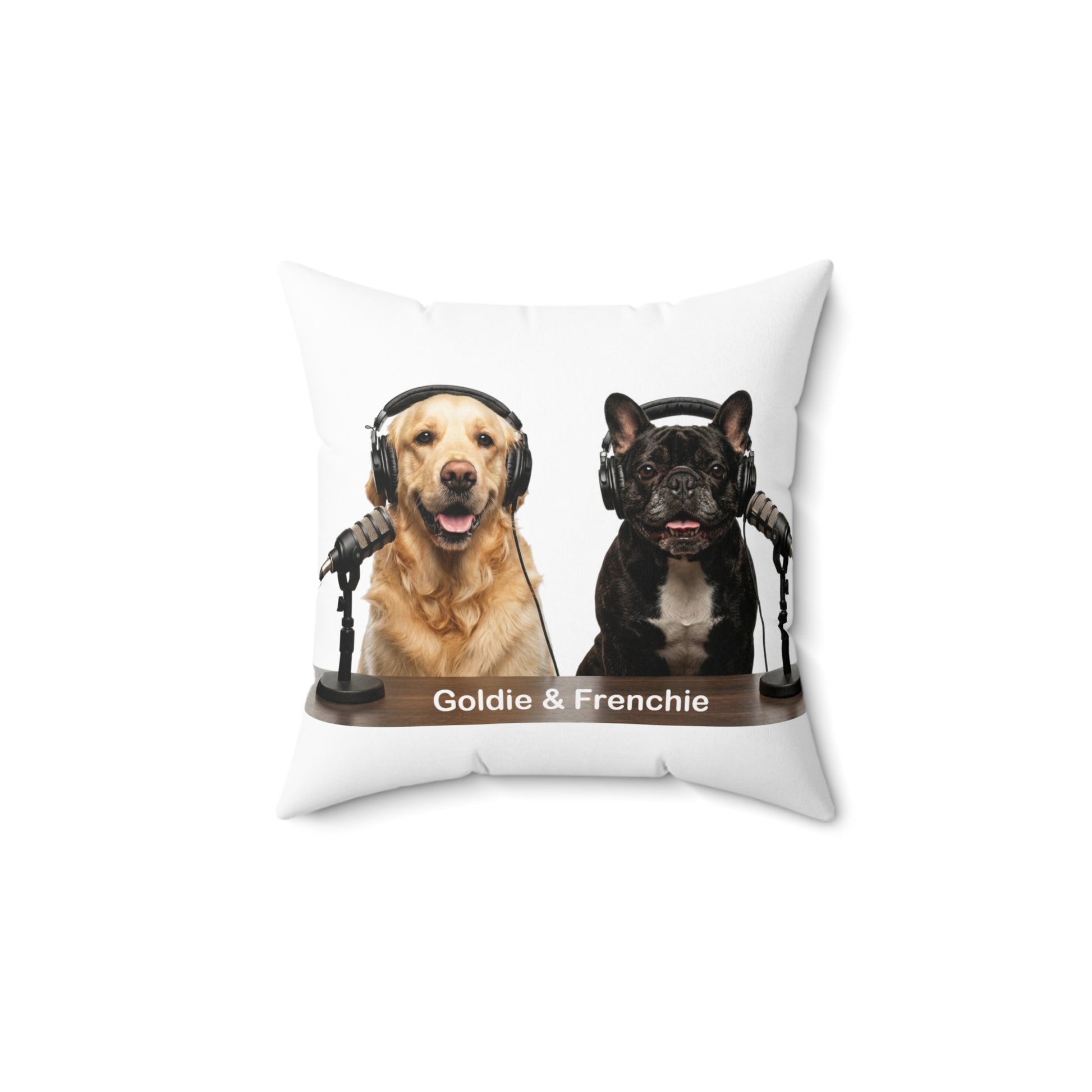 This Goldie & Frenchie pillow brings pure joy into any room — a cozy, cheerful accent featuring everyone’s favorite podcasting duo. Printed on soft, durable spun polyester, the design captures Goldie’s golden grin and Frenchie’s iconic side-eye as they sit behind their mics, ready to brighten your day. The crisp, full-color print pops beautifully against the clean white background, making it a standout piece on a couch, bed, or office chair. Whether you're a longtime fan of the show or just love dogs with personality, this pillow adds comfort, charm, and a little laughter wherever it lands.