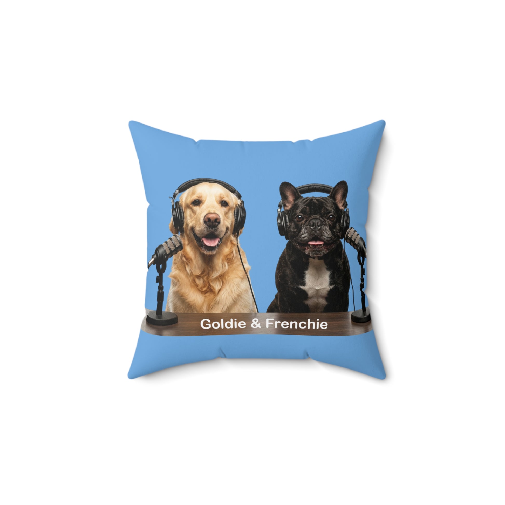 This Goldie & Frenchie pillow brings pure joy into any room — a cozy, cheerful accent featuring everyone’s favorite podcasting duo. Printed on soft, durable spun polyester, the design captures Goldie’s golden grin and Frenchie’s iconic side-eye as they sit behind their mics, ready to brighten your day. The crisp, full-color print pops beautifully against the clean white background, making it a standout piece on a couch, bed, or office chair. Whether you're a longtime fan of the show or just love dogs with personality, this pillow adds comfort, charm, and a little laughter wherever it lands.