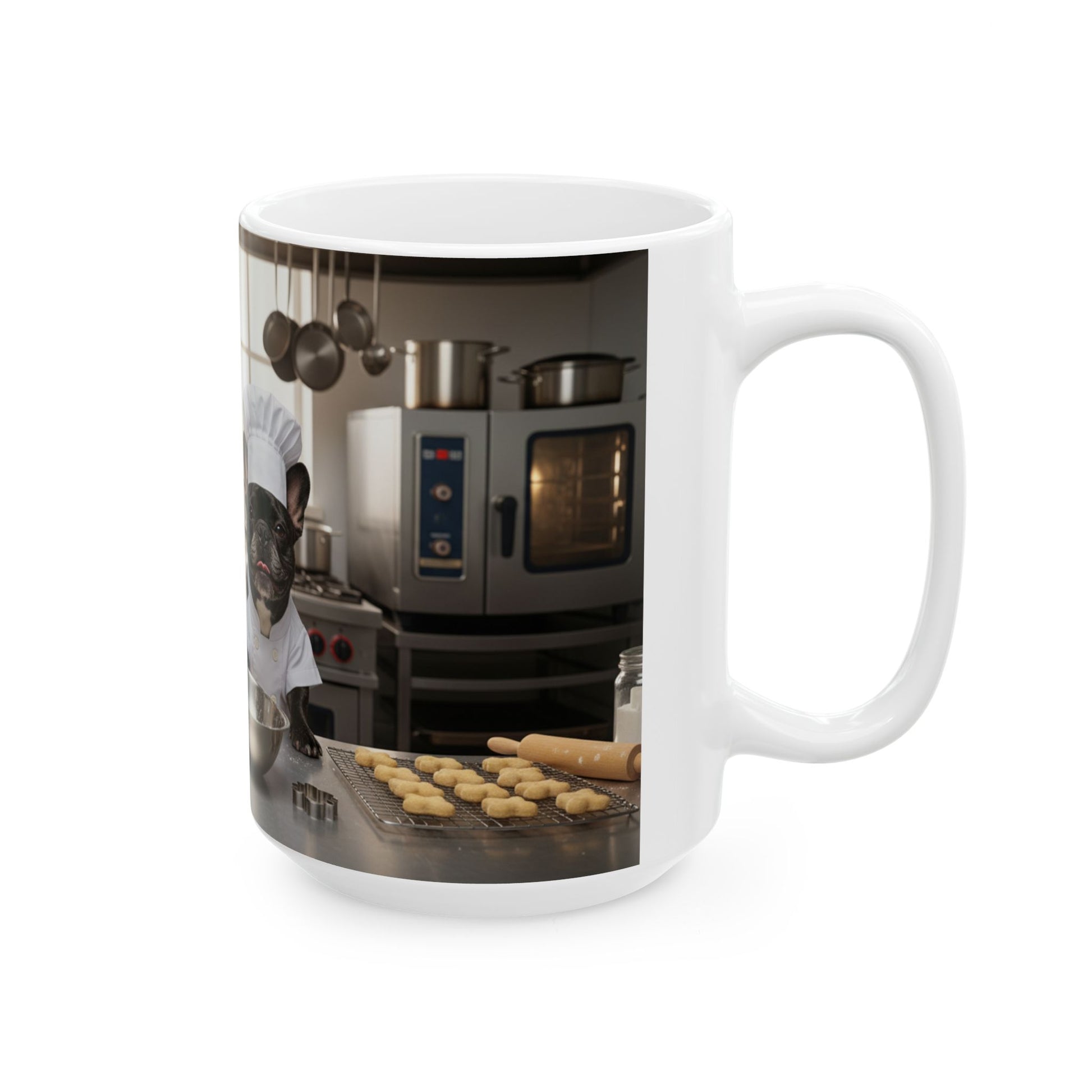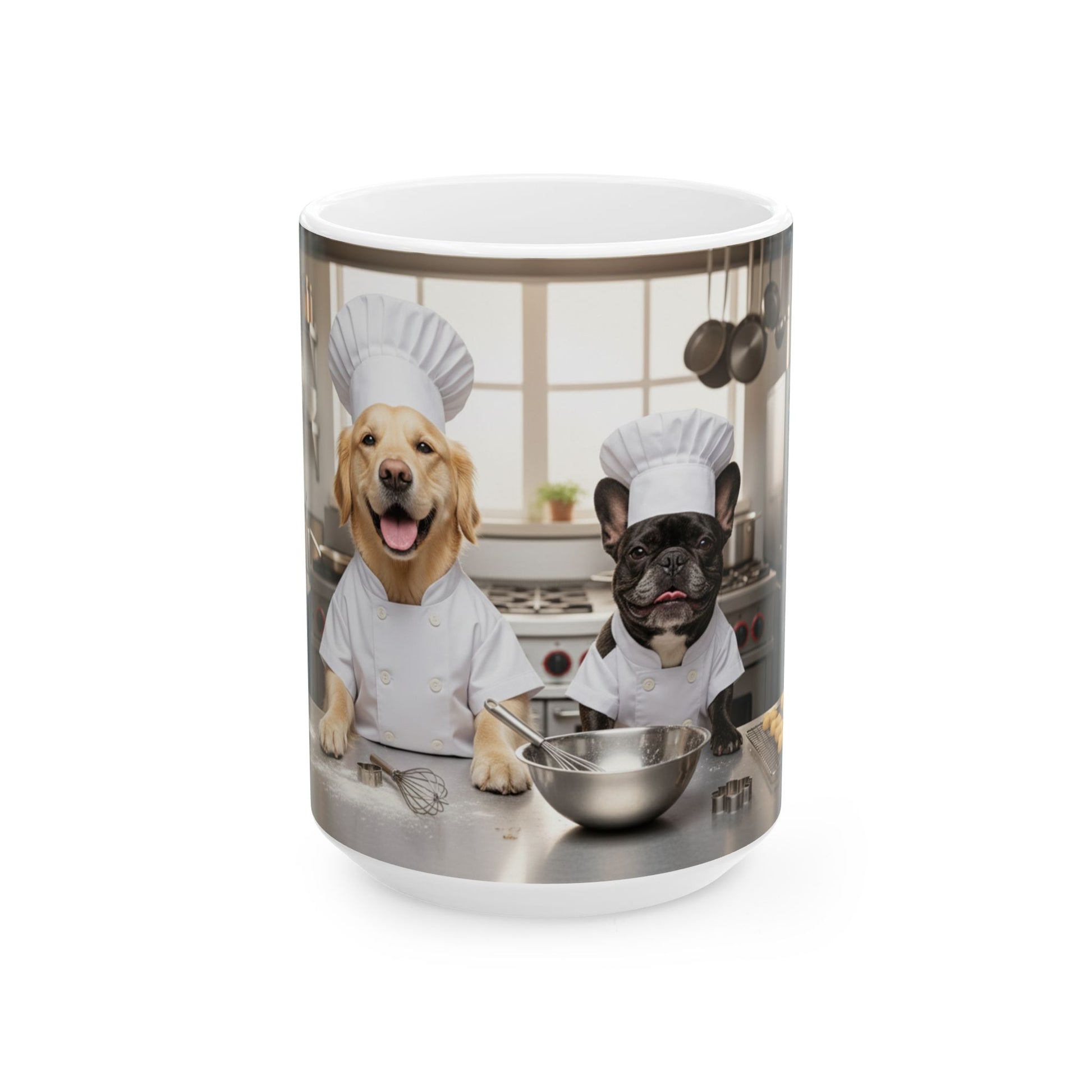 This glossy ceramic mug brings a dash of kitchen joy to your daily routine. Wrapped in a crisp, high-resolution print, Goldie & Frenchie step into the spotlight as head chefs—complete with hats, spotless coats, and stainless-steel mixing bowls at the ready. It feels like morning coffee is being served with a sprinkle of humor and a pinch of charm.