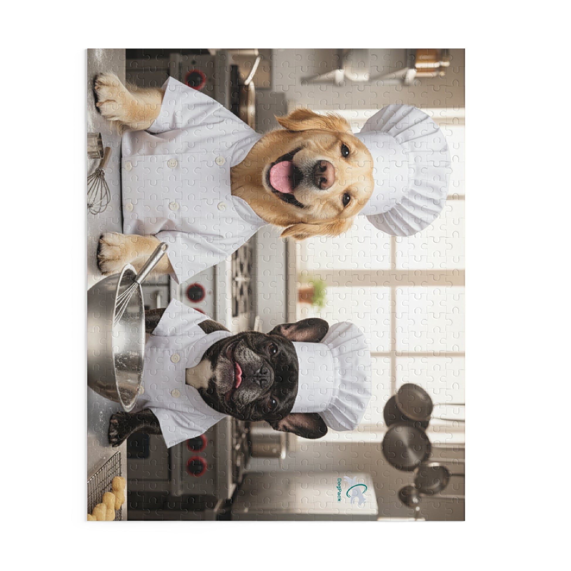 Step into the cutest kitchen in the world, one piece at a time. This charming puzzle features two proud canine chefs — Goldie, a smiling Golden Retriever and Frenchie, a focused French Bulldog — dressed in crisp white uniforms and ready to whisk, mix, and bake their way into your heart. Soft natural light, stainless-steel cookware, and tiny cookie details bring the whole scene to life as you assemble it. Whether you’re unwinding solo or gathering friends for a cozy night in, this puzzle blends warmth, humor, and a pinch of culinary whimsy. The finished piece makes a delightful display for dog lovers, bakers, or anyone who appreciates a playful twist on kitchen culture.