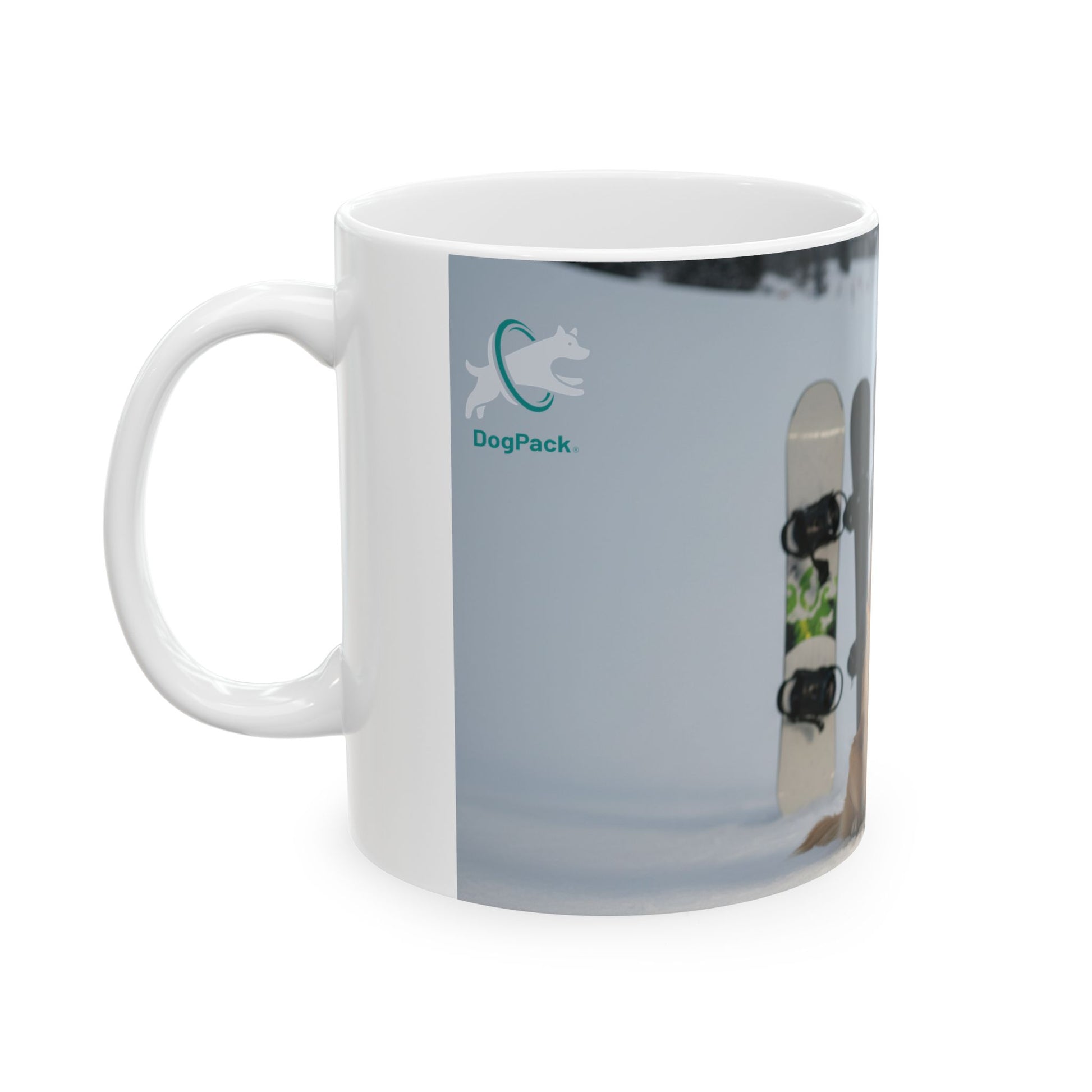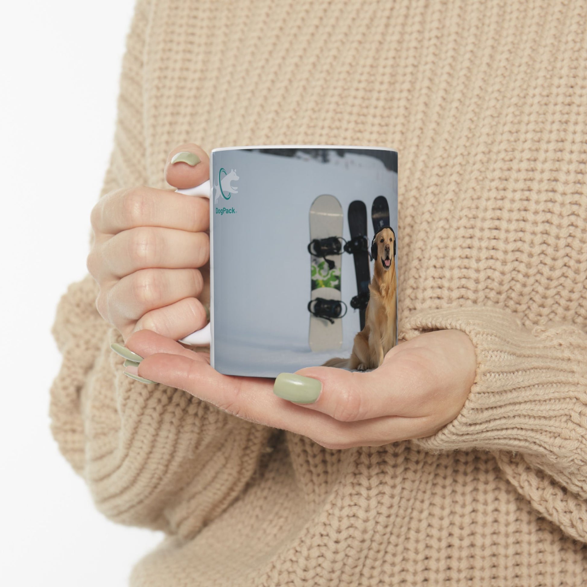 Bring a burst of winter fun to your morning routine with this glossy ceramic mug featuring two adventure-ready dogs enjoying a day on the slopes. The wraparound print shows Goldie the Golden Retriever and Frenchie, a French Bulldog posing in the snow with their snowboards — a playful scene that turns every sip into a cozy, feel-good moment.