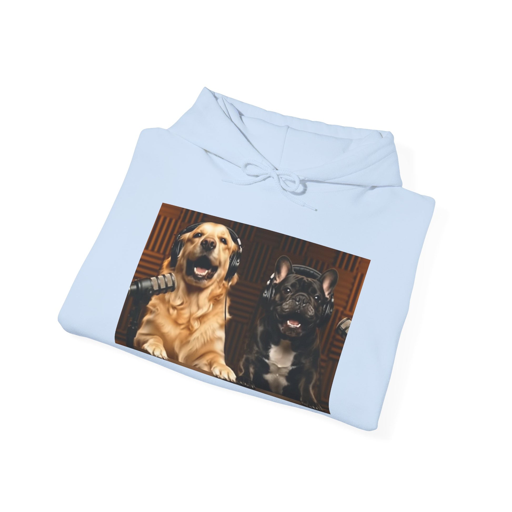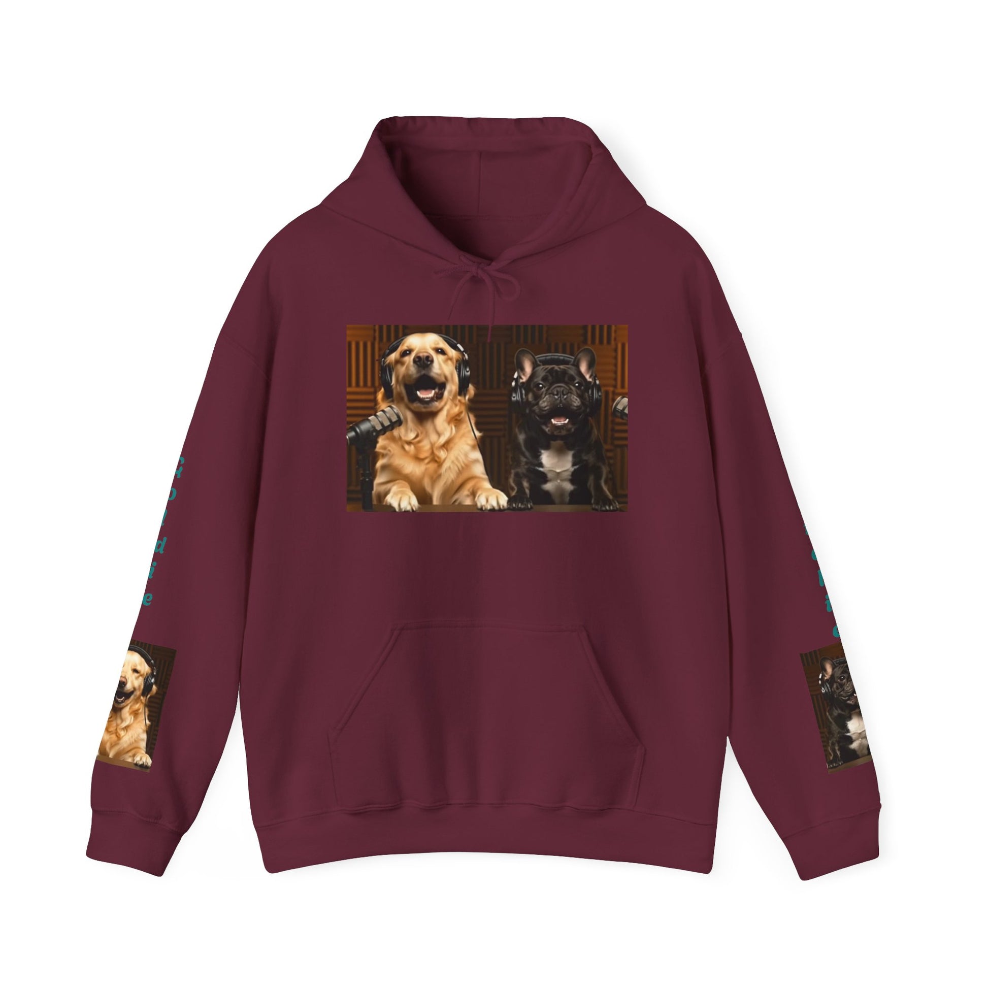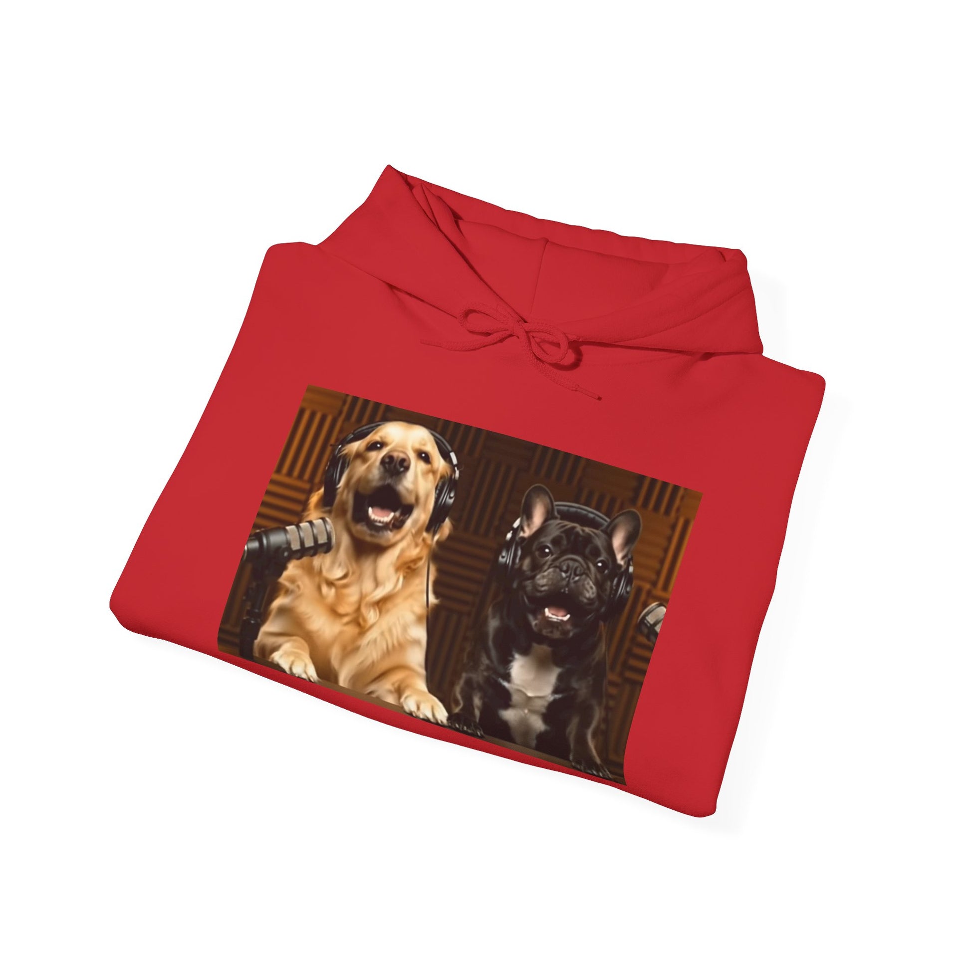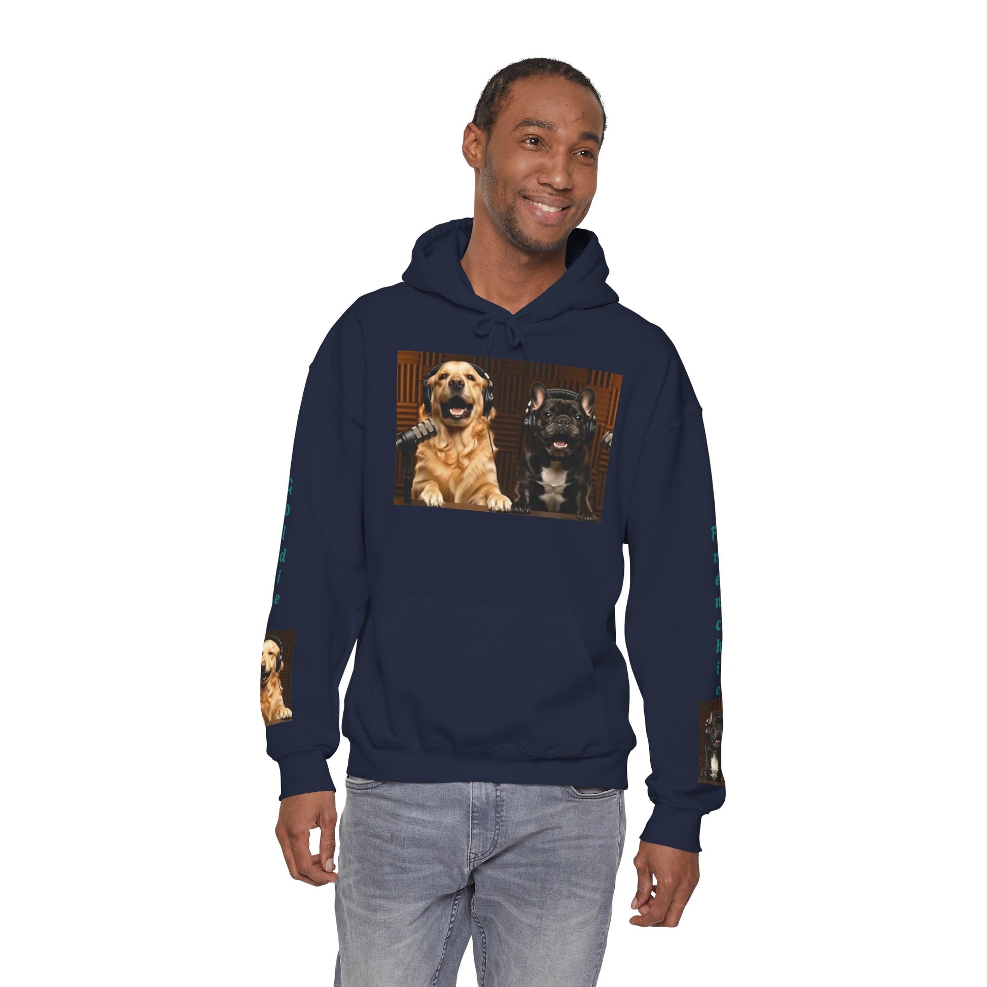 Soft, roomy hooded sweatshirt printed with warm, candid photos of two dogs—one golden, one dark—so their friendly faces sit front-and-center and again across the back and sleeves. The fabric feels cozy against the skin and the roomy kangaroo pocket shelters cold hands or a leash while you stroll. Subtle text along the sleeves names the dogs, giving the piece a personal, lived-in charm that reads like a favorite memory you can wear. It’s the kind of hoodie you reach for on slow mornings, long walks, or when you want to carry a bit of home with you.