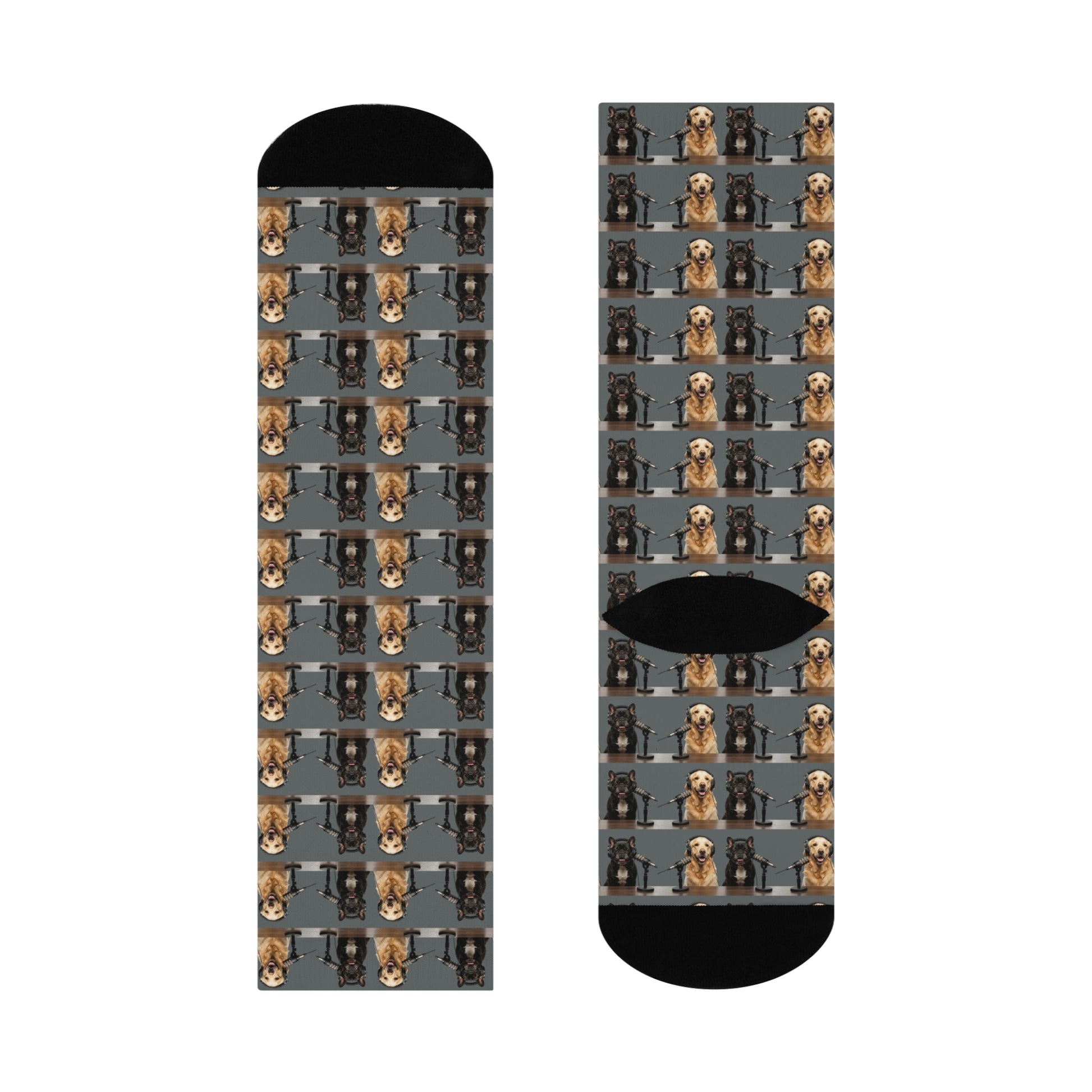 These cushioned crew socks turn everyday comfort into a subtle statement, featuring Goldie & Frenchie captured in their classic podcast studio setup. The repeating pattern showcases the duo behind the mic in a clean, photo-real style set against a neutral grey background, giving the socks a polished, understated look that still feels unmistakably DogPack.