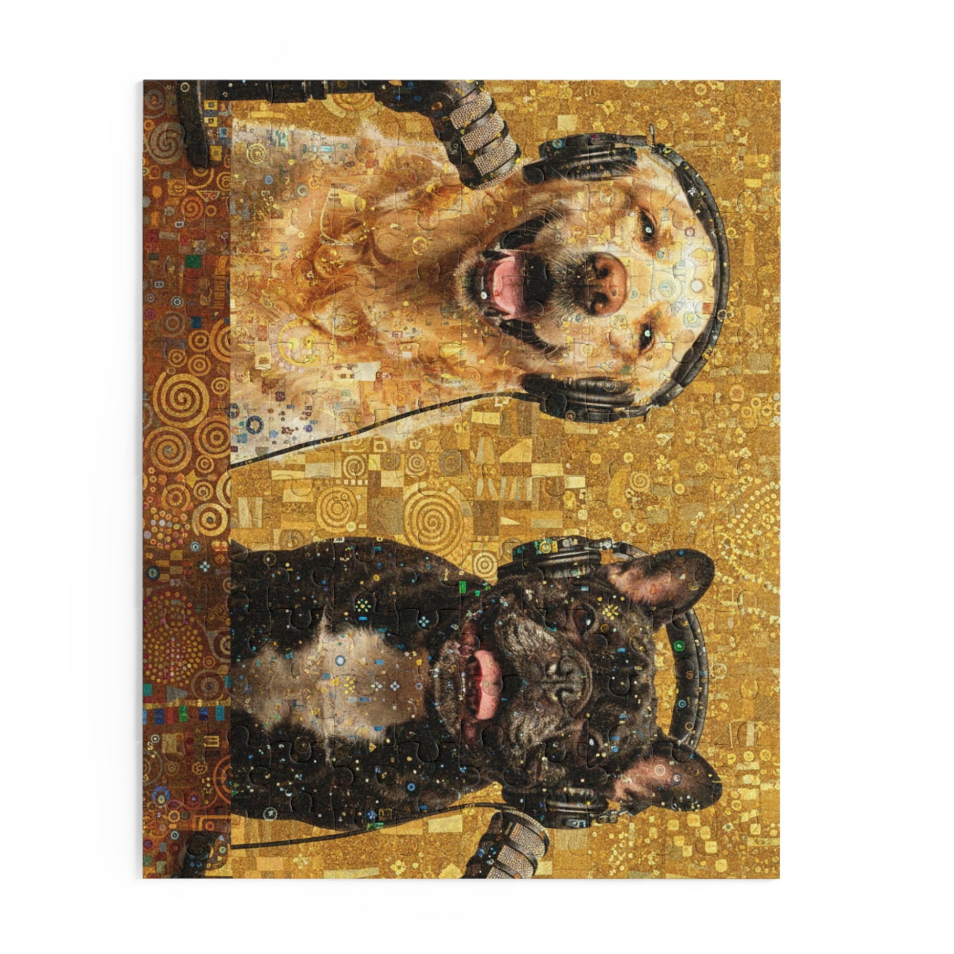Goldie & Frenchie sit front and center, rendered in rich swirling patterns, shimmering textures, and warm metallic tones reminiscent of Gustav Klimt’s iconic style. Their headphones, smiles, and playful expressions add a modern, humorous contrast to the ornate backdrop, transforming each puzzle piece into a tiny work of art. As the sections come together, the image glows with personality—part fine art, part comedy, all heart. Perfect for cozy evenings, creative breaks, or gifting to any dog lover who appreciates a touch of sophistication with their silliness.