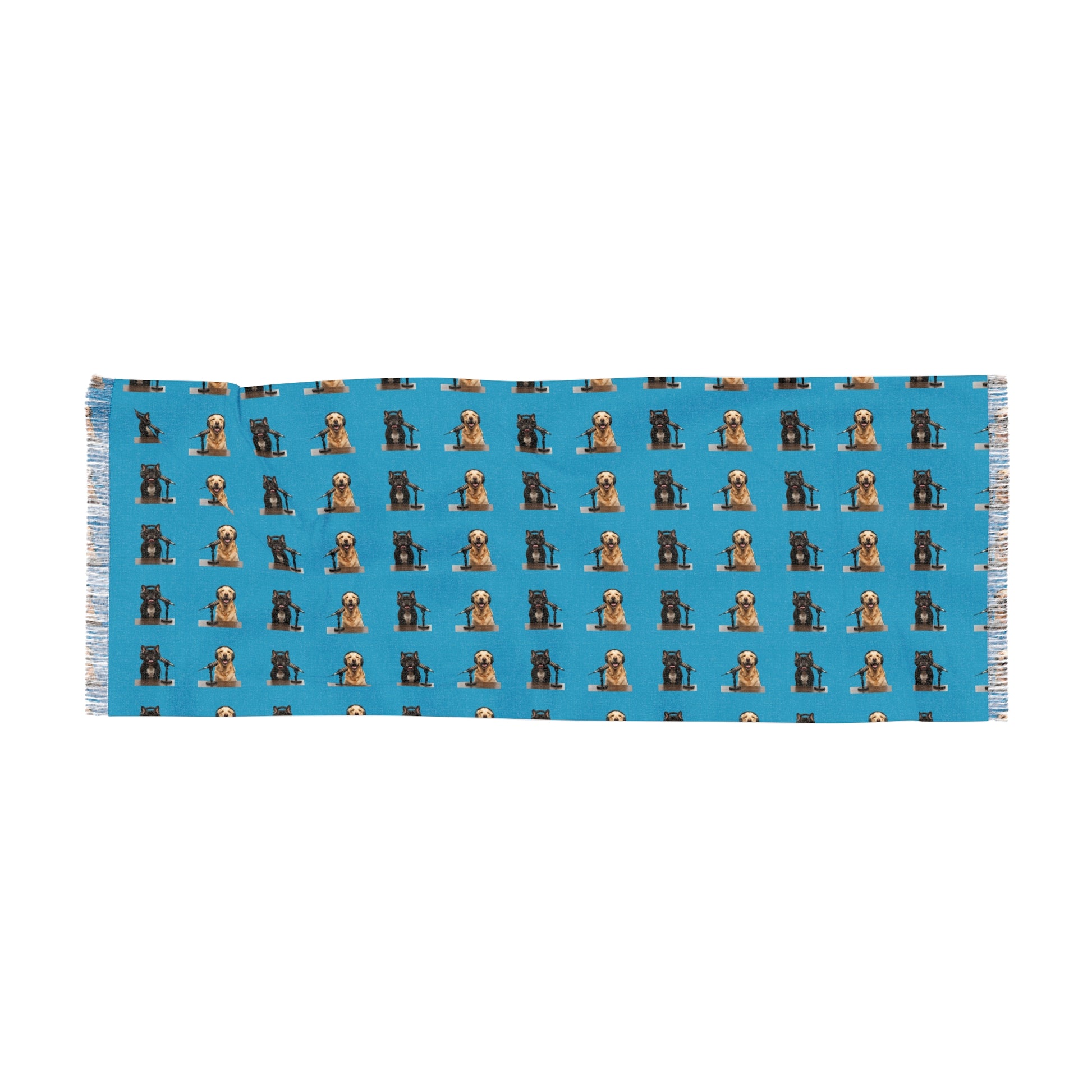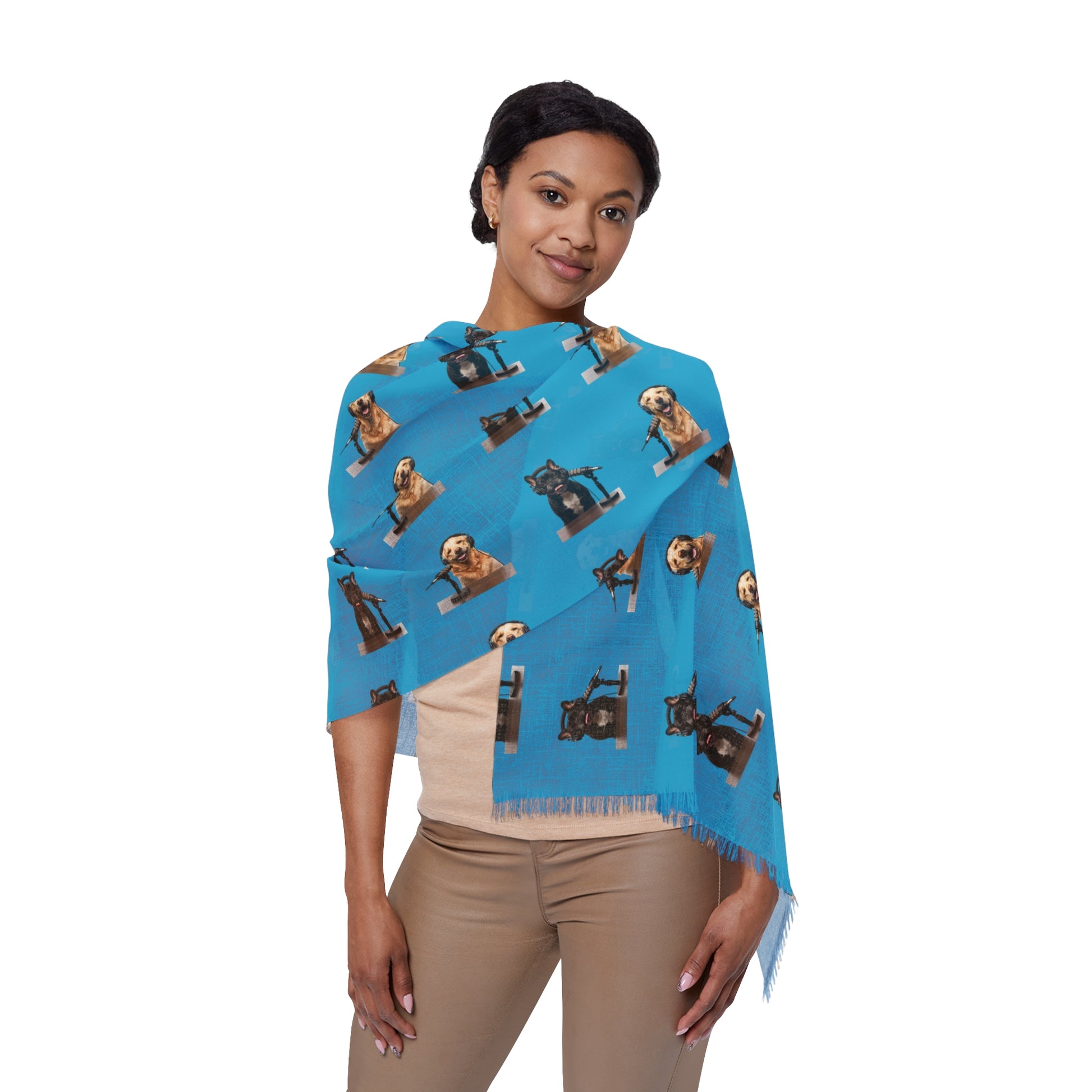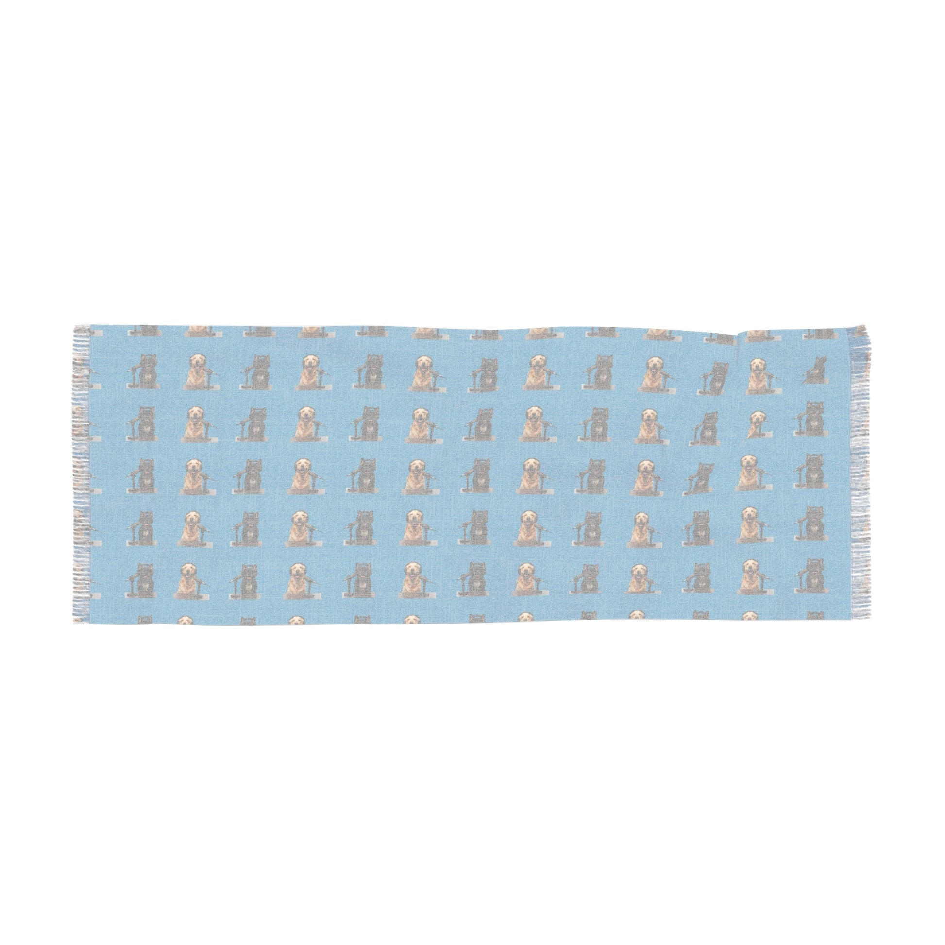 Soft, lightweight, and full of character, this scarf is designed to be noticed up close and admired from afar. The repeating Goldie & Frenchie portrait pattern creates a clean, modern rhythm across the fabric—playful without being loud, distinctive without overpowering your look. Each small illustration adds personality, turning a simple accessory into something that feels curated and intentional.