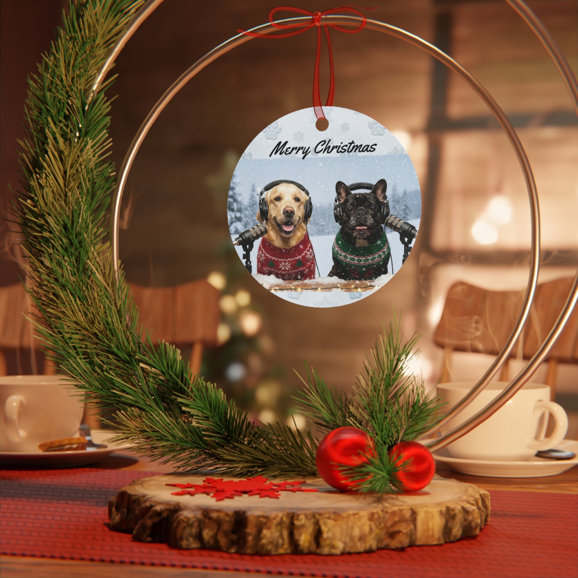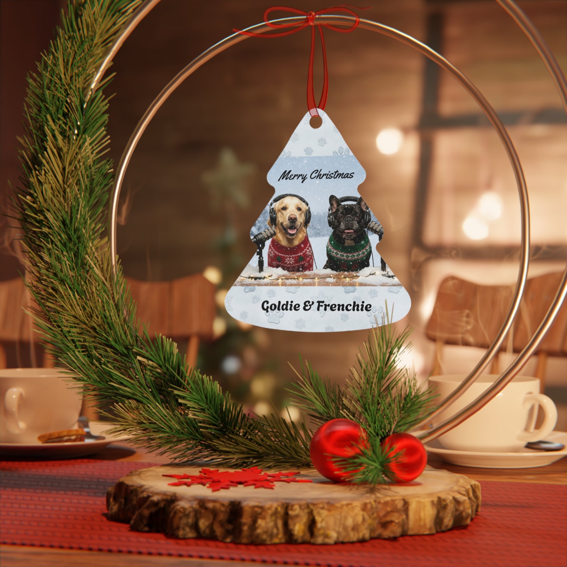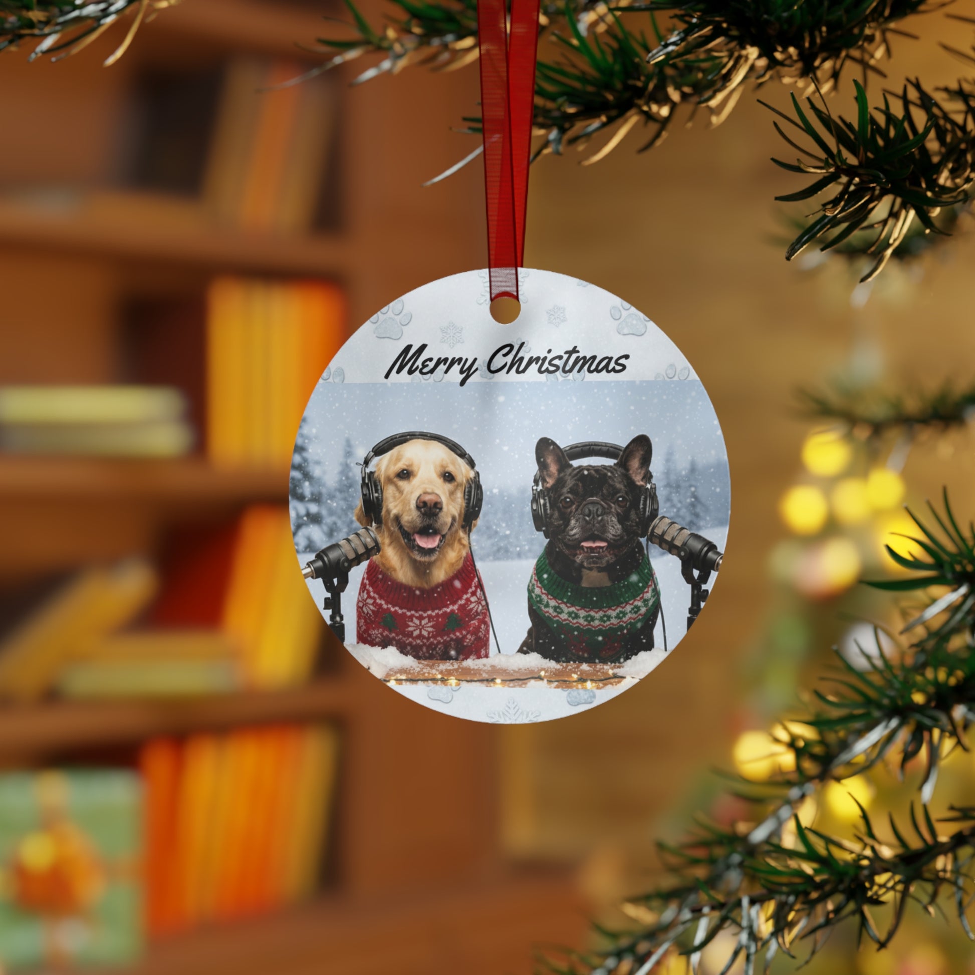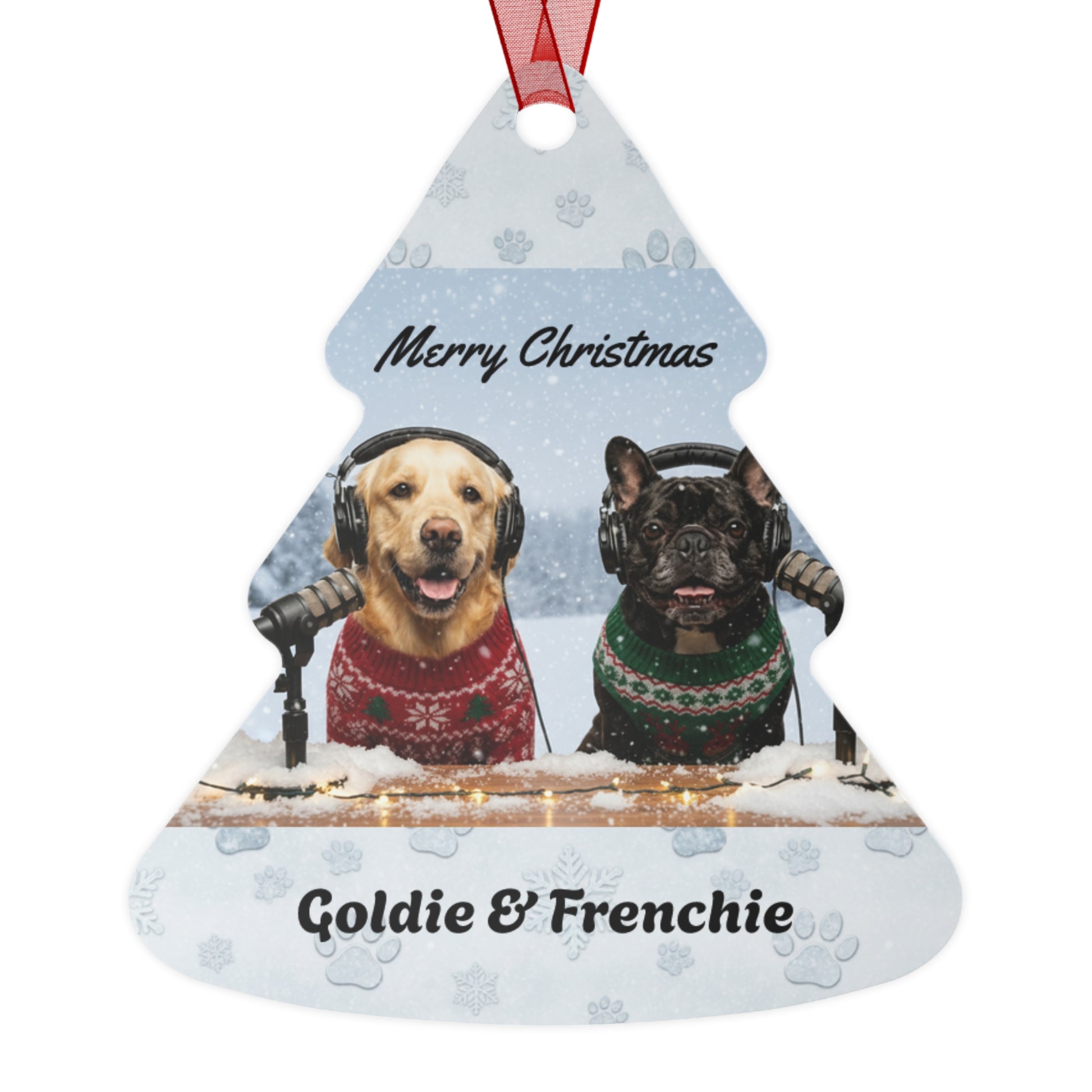 Add a touch of winter magic to your holiday décor with this beautifully printed metal ornament featuring Goldie & Frenchie in their festive Christmas scene. Made from lightweight, glossy aluminum, each ornament showcases vibrant, double-sided artwork that stays crisp year after year. The smooth white surface resists scratches and chips, while the included red ribbon makes hanging effortless. Choose from four classic shapes to suit any tree, mantle, or gift wrap accent. Whether kept as a personal keepsake or shared as a thoughtful present, this ornament brings a cozy, joyful moment to the season.