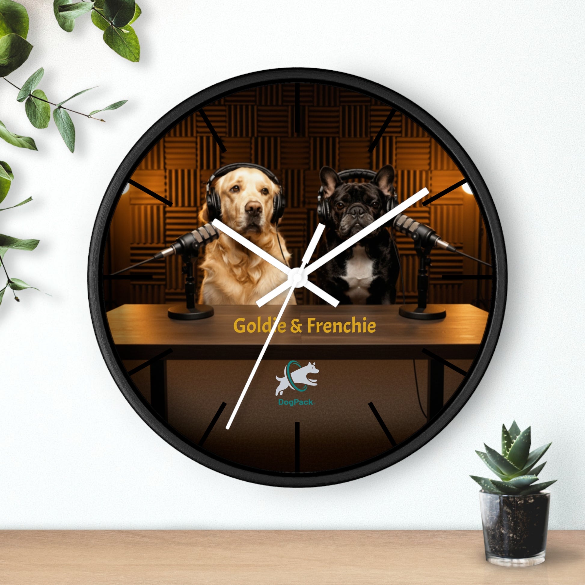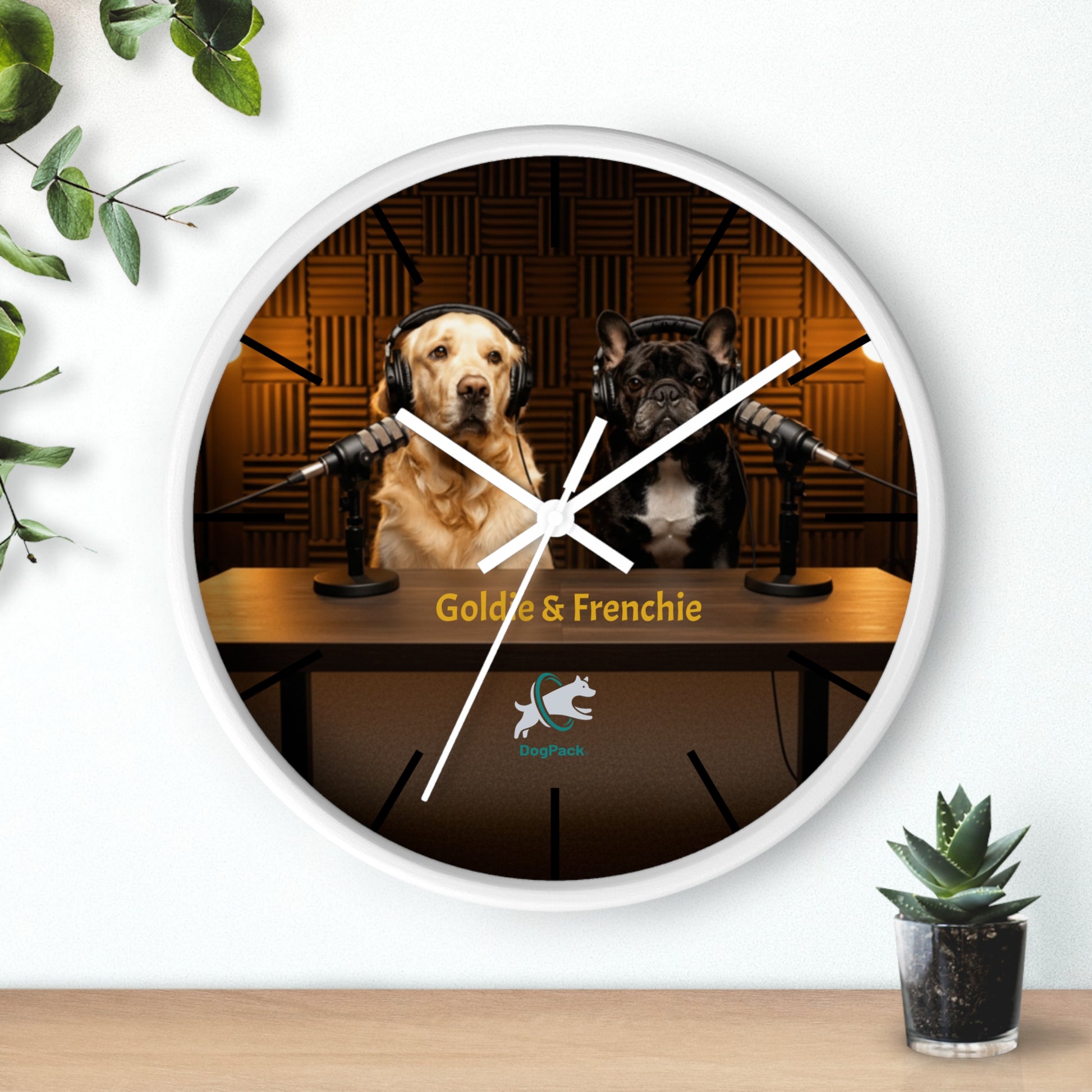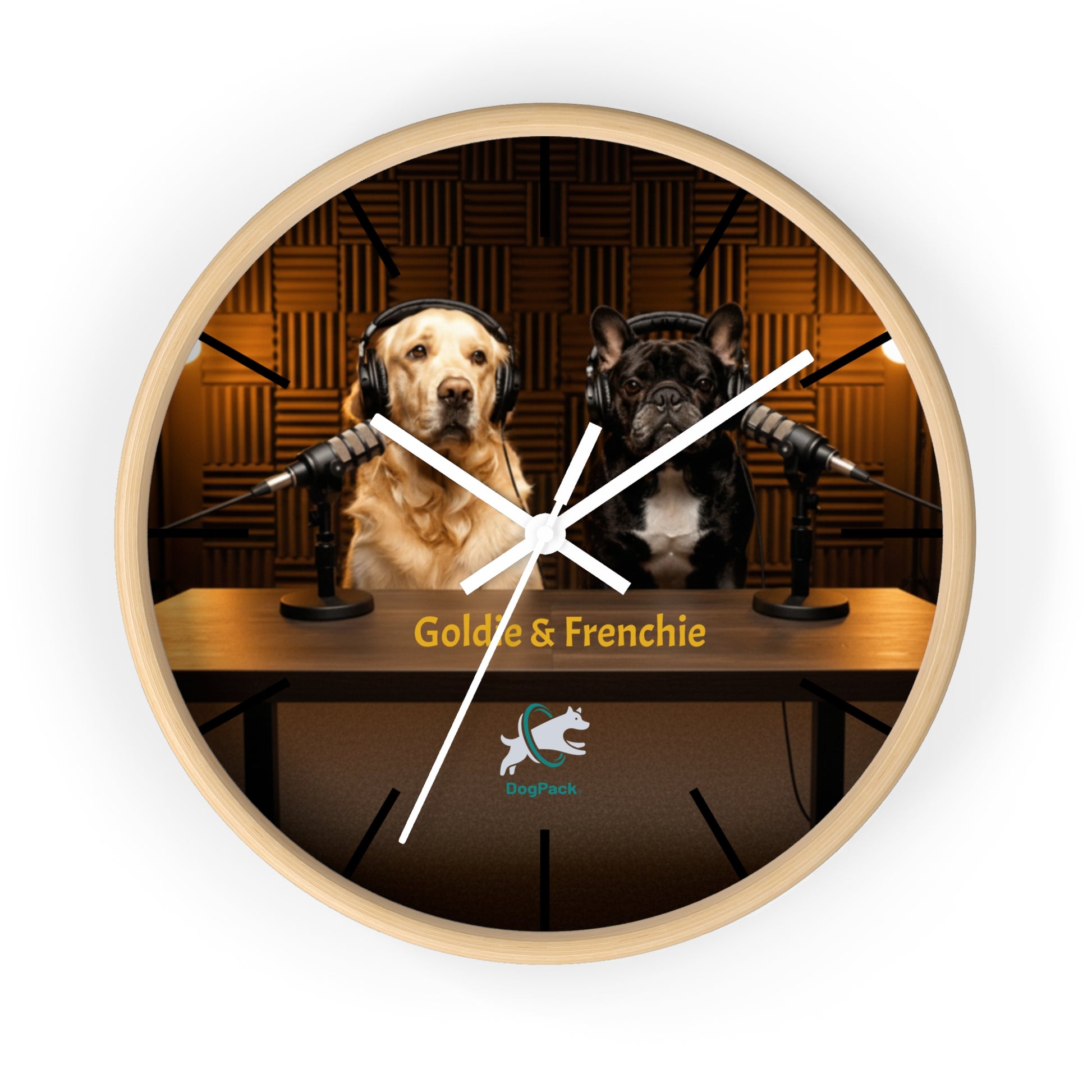 Bring a touch of DogPack charm to your space with this 10" Goldie & Frenchie studio-edition wall clock. Featuring the duo behind their iconic microphones, this design captures the cozy glow of a real recording booth — warm lights, soft acoustic panels, and the unmistakable personalities of a Golden Retriever and French Bulldog who look ready to start the next episode. The high-definition print keeps the colors rich and crisp, while the silent mechanism makes it perfect for bedrooms, offices, and living rooms alike. With multiple frame and hand options, it blends easily with any décor and hangs effortlessly with the pre-installed hook.