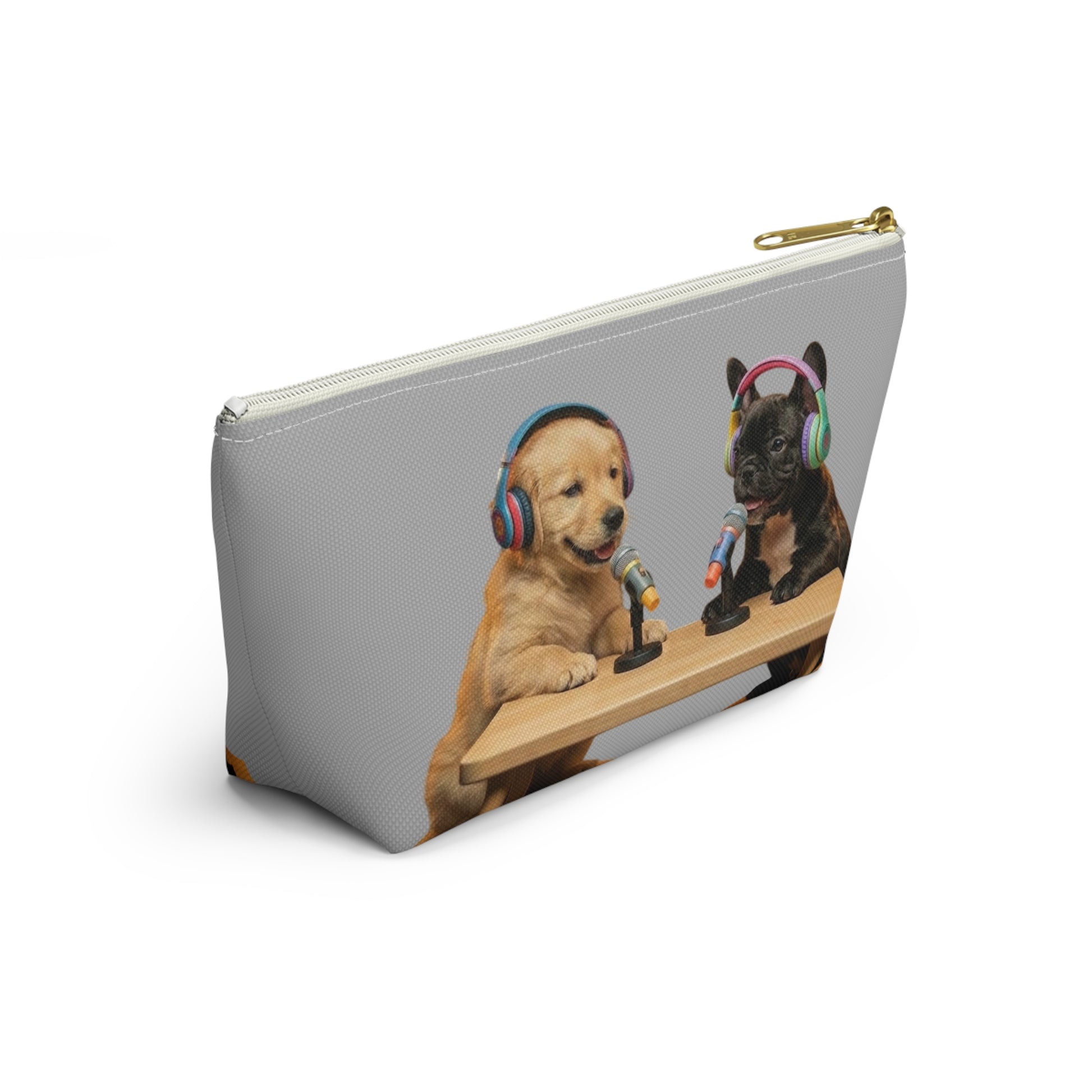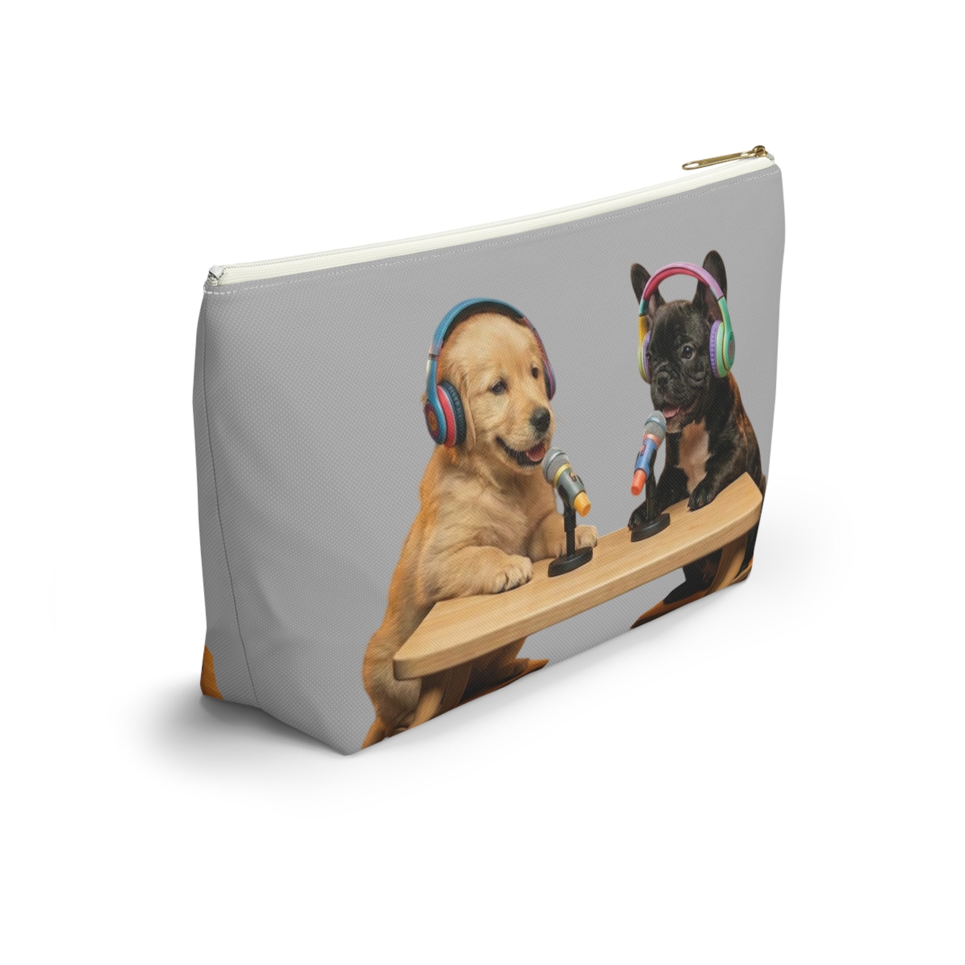 This playful accessory pouch captures two sides of Goldie & Frenchie in one standout design — youthful curiosity on one half, confident charm on the other. Featuring the duo seated behind the mic, the artwork transitions from their early, playful puppy days to their more composed adult personalities, creating a fun and meaningful contrast that fans instantly recognize. The light grey backdrop keeps the focus on their expressions and energy, making the pouch feel lively without being loud.
