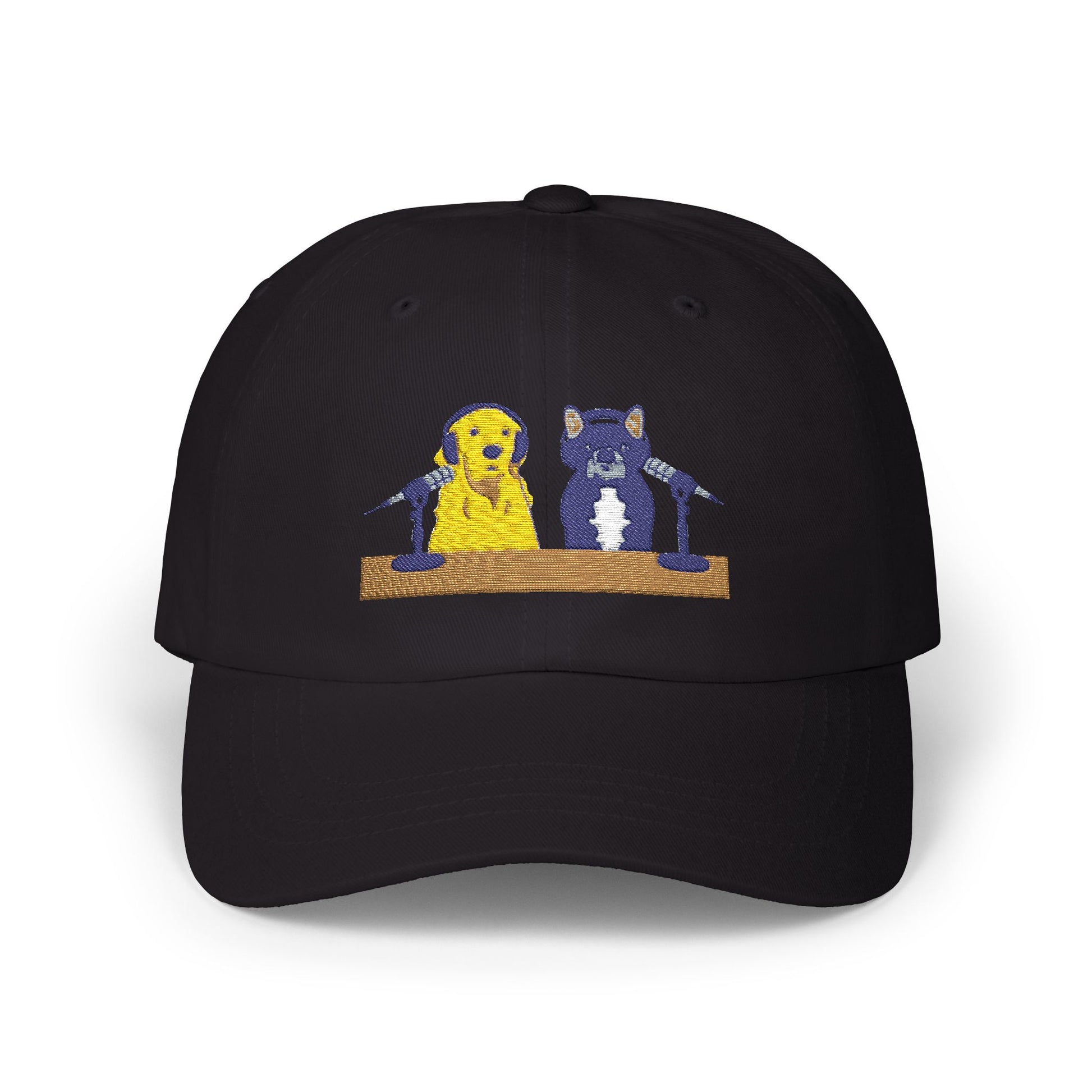 A soft, low-profile cotton cap featuring a stitched mini-scene of Goldie and Frenchie behind their microphones — Goldie bright and cheerful, Frenchie calm and composed — captured in charming, textured embroidery. The artwork feels playful and familiar, like a tiny snapshot from their Pawdcast brought to life on your everyday hat.