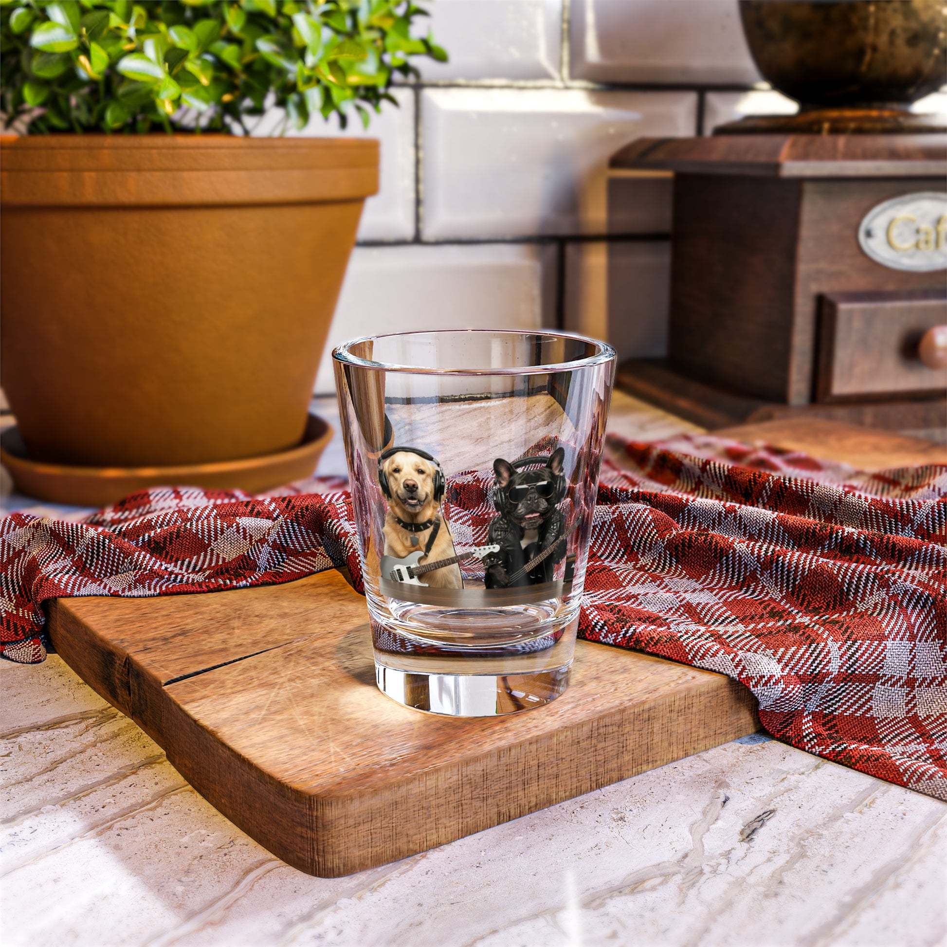 This 1.5oz clear glass features Goldie & Frenchie in full rock-dog mode — headphones on, guitars tuned, ready to blow the roof off any bar cart. Crisp full-color printing brings their stage-ready energy to life, while the heavyweight glass base gives every pour a solid, satisfying feel. Whether you’re lining up celebratory shots, sampling craft spirits, or displaying it as part of your DogPack collection, this little glass brings big personality with every clink.