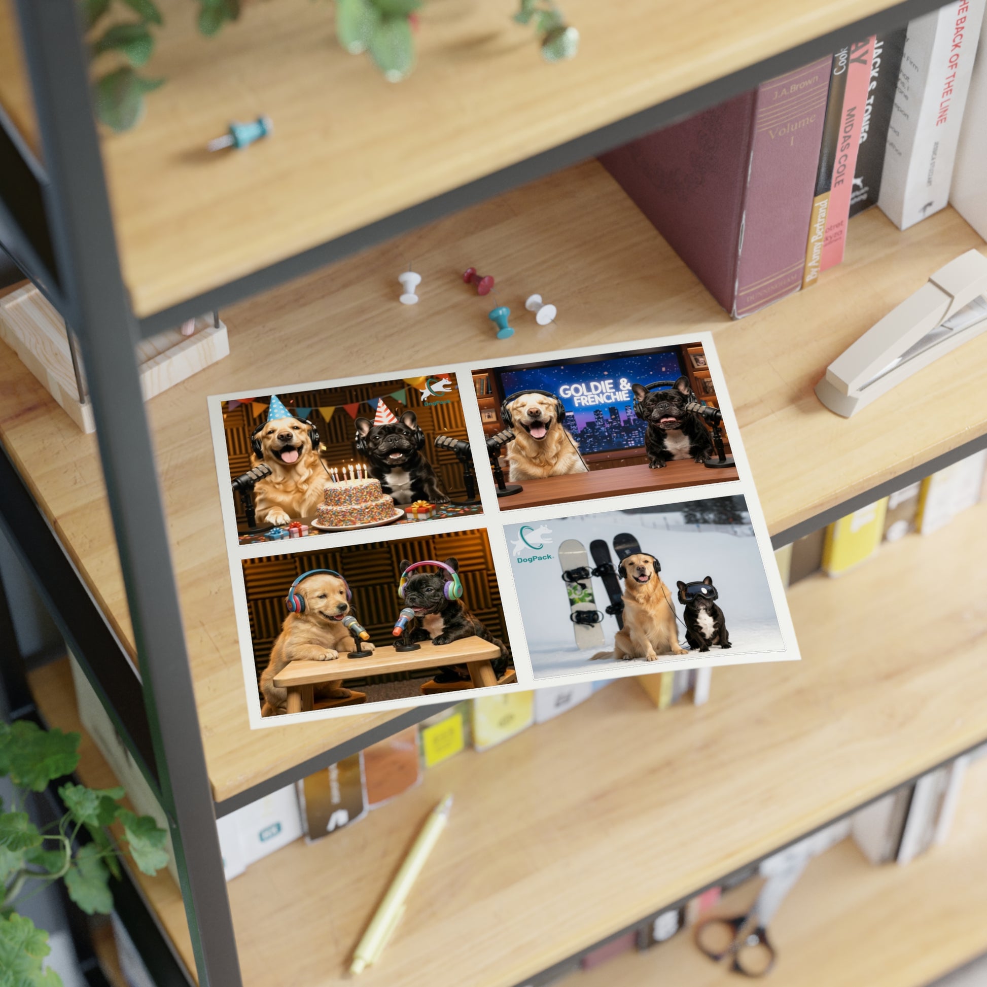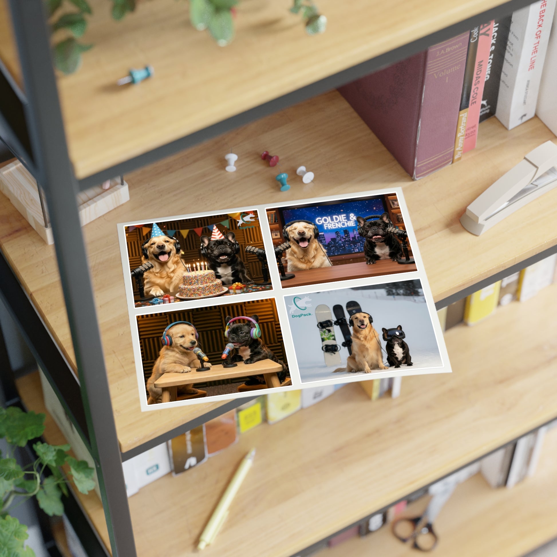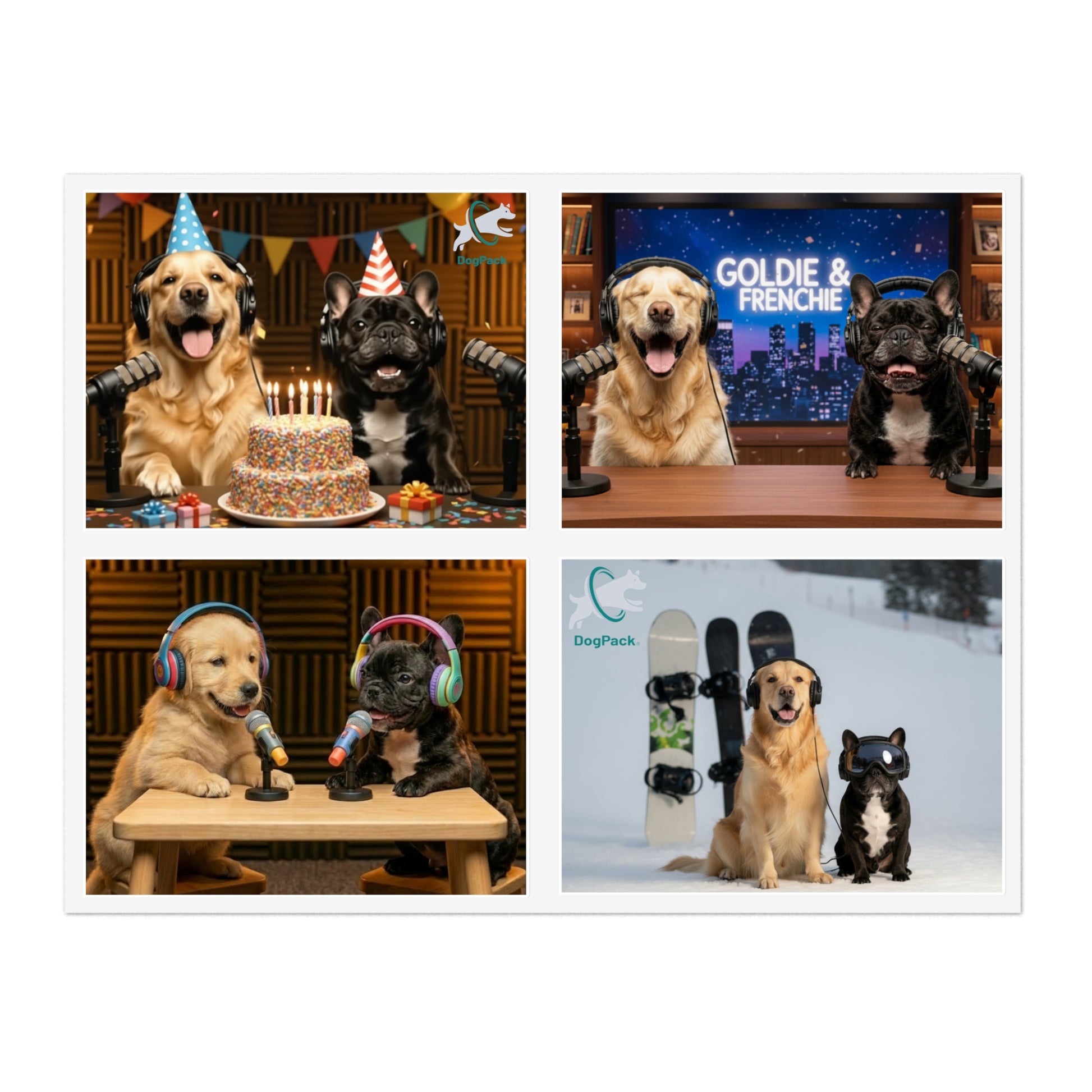 Goldie & Frenchie — Sheet of 4 Popular Stickers with backgrounds, Celebration, Talk Show, Snowboarding, Puppies