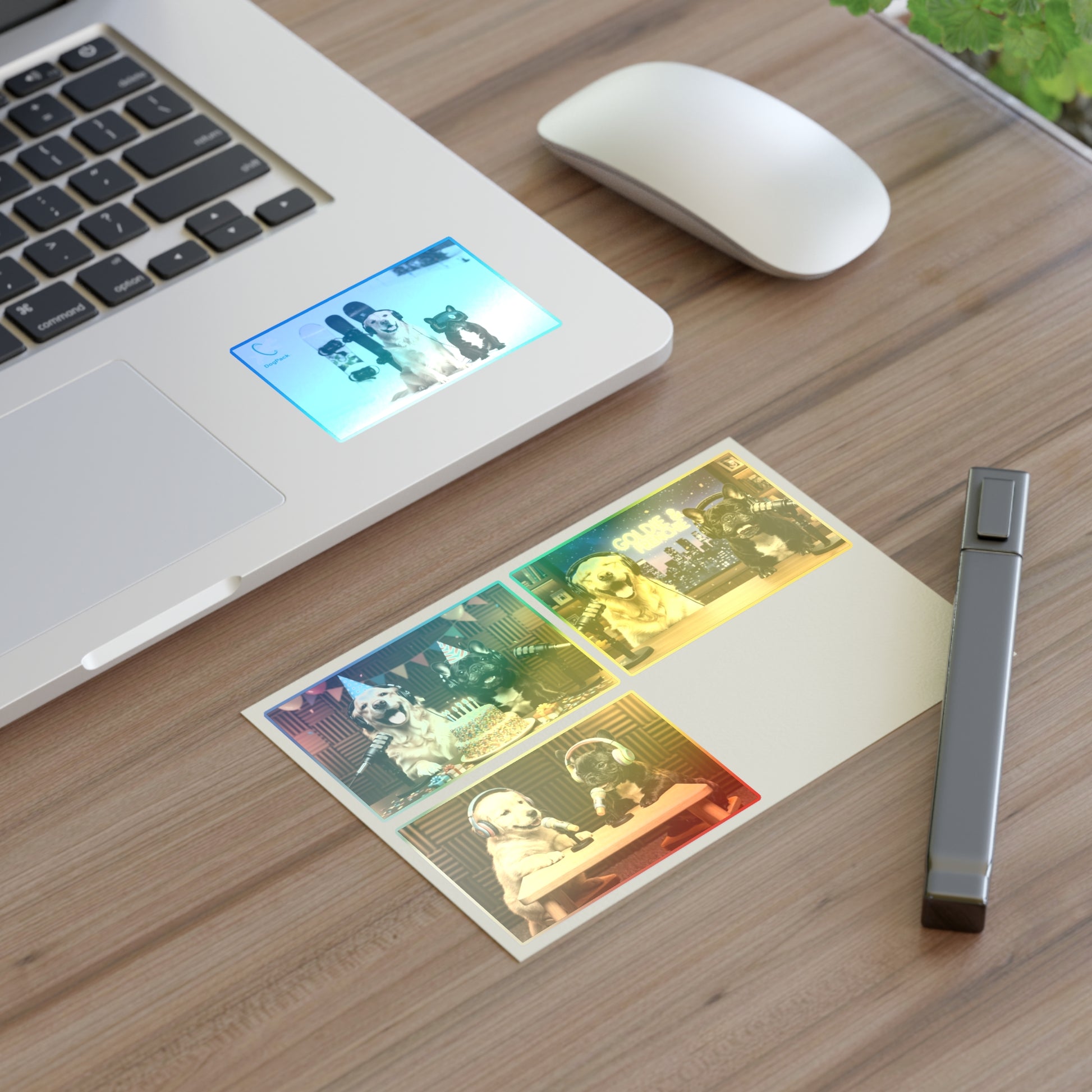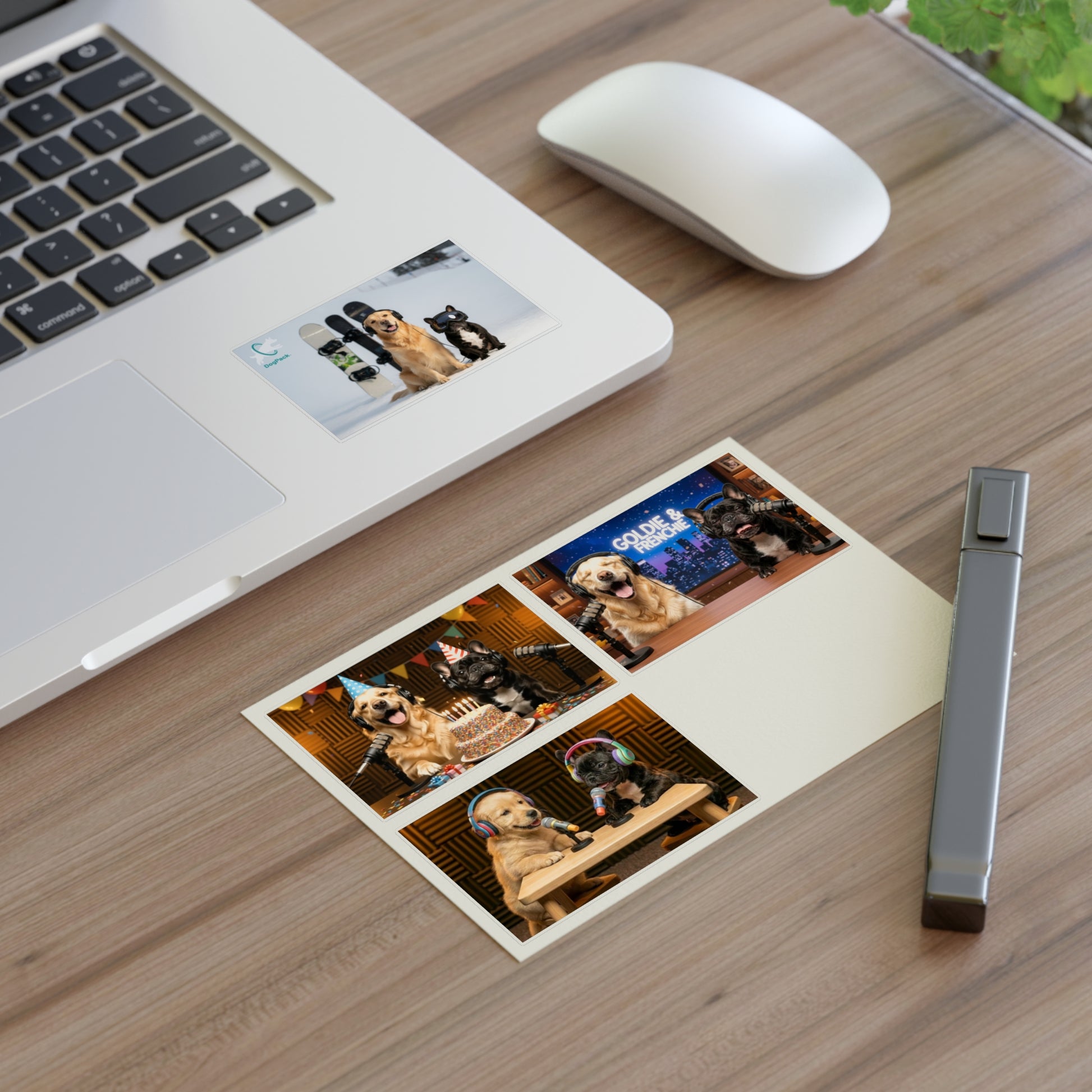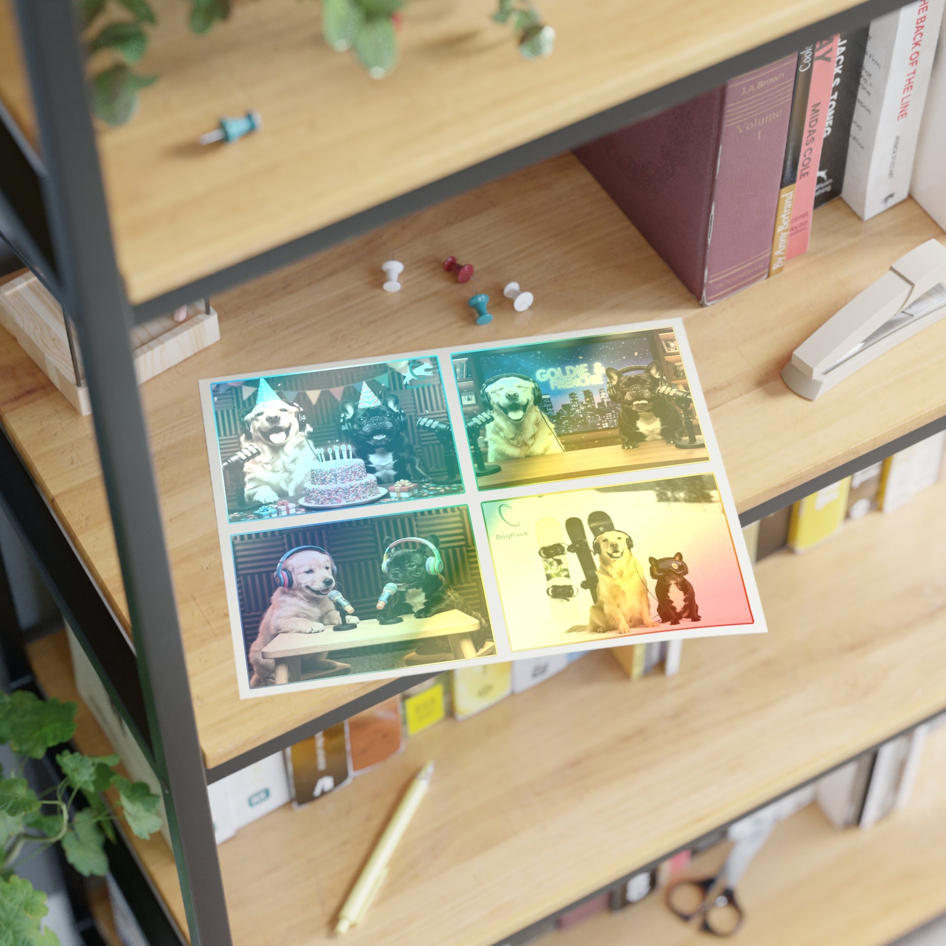 Goldie & Frenchie — Sheet of 4 Popular Stickers with backgrounds, Celebration, Talk Show, Snowboarding, Puppies