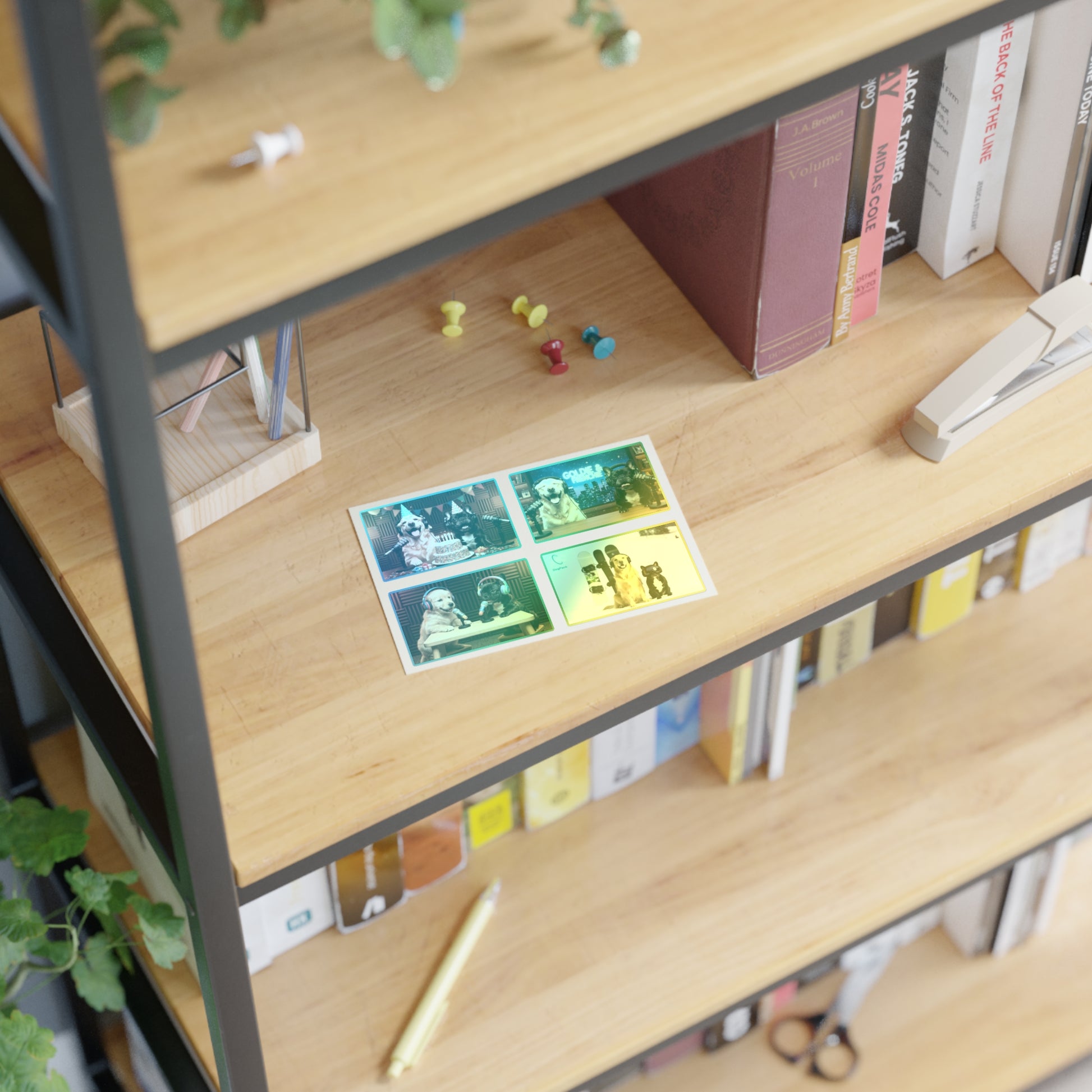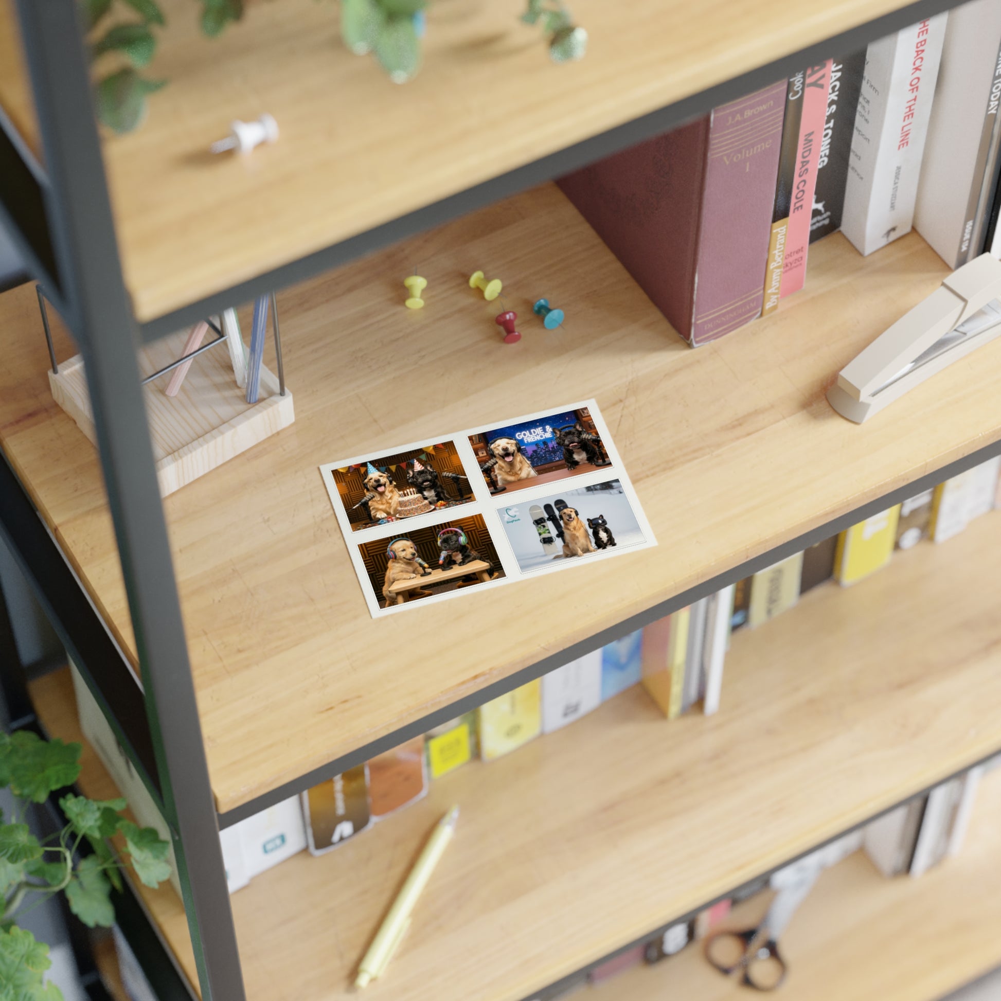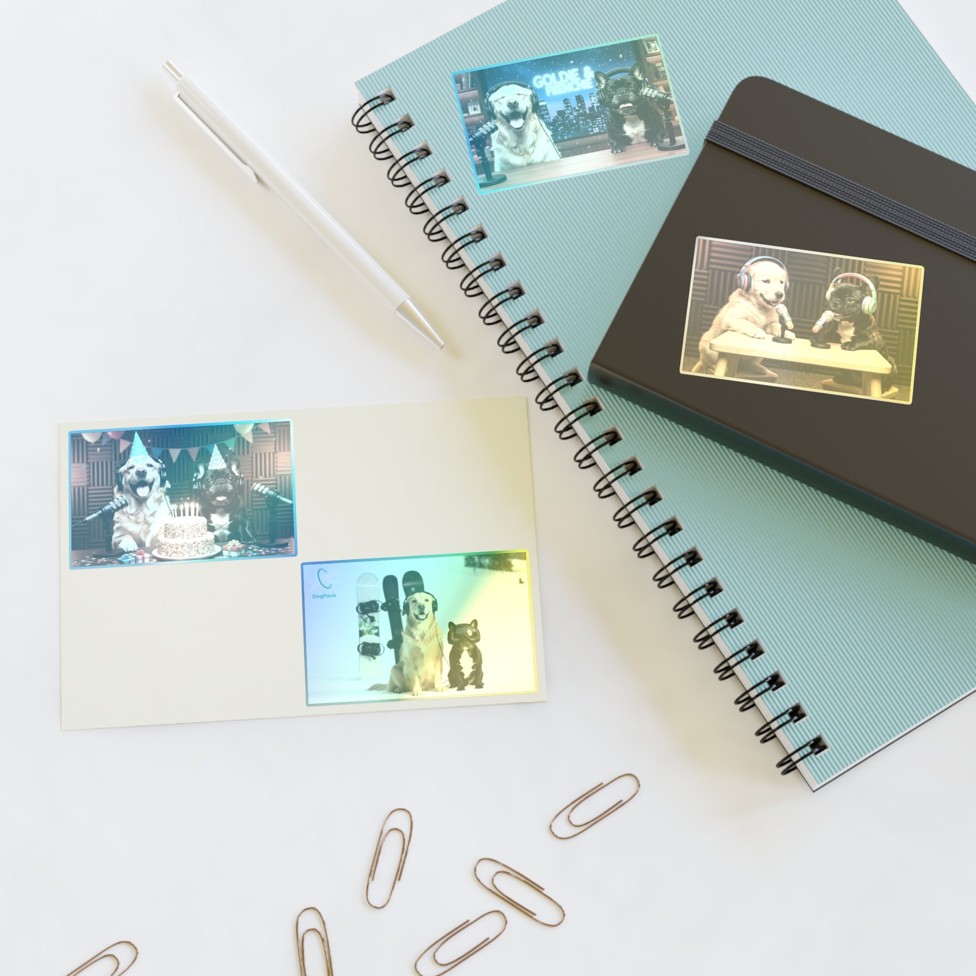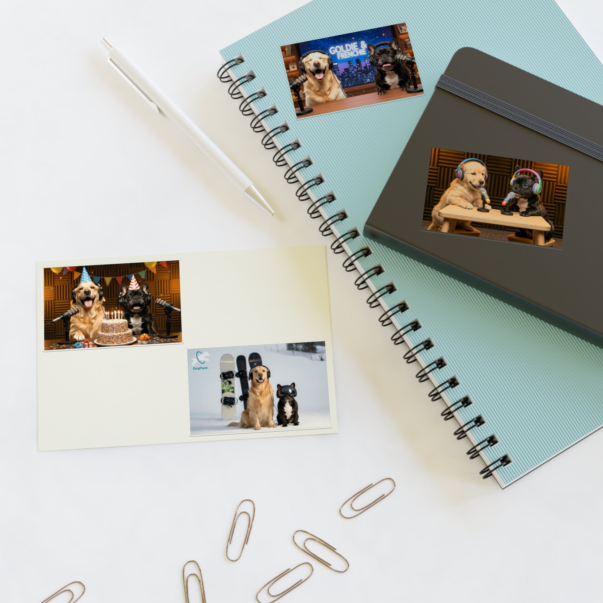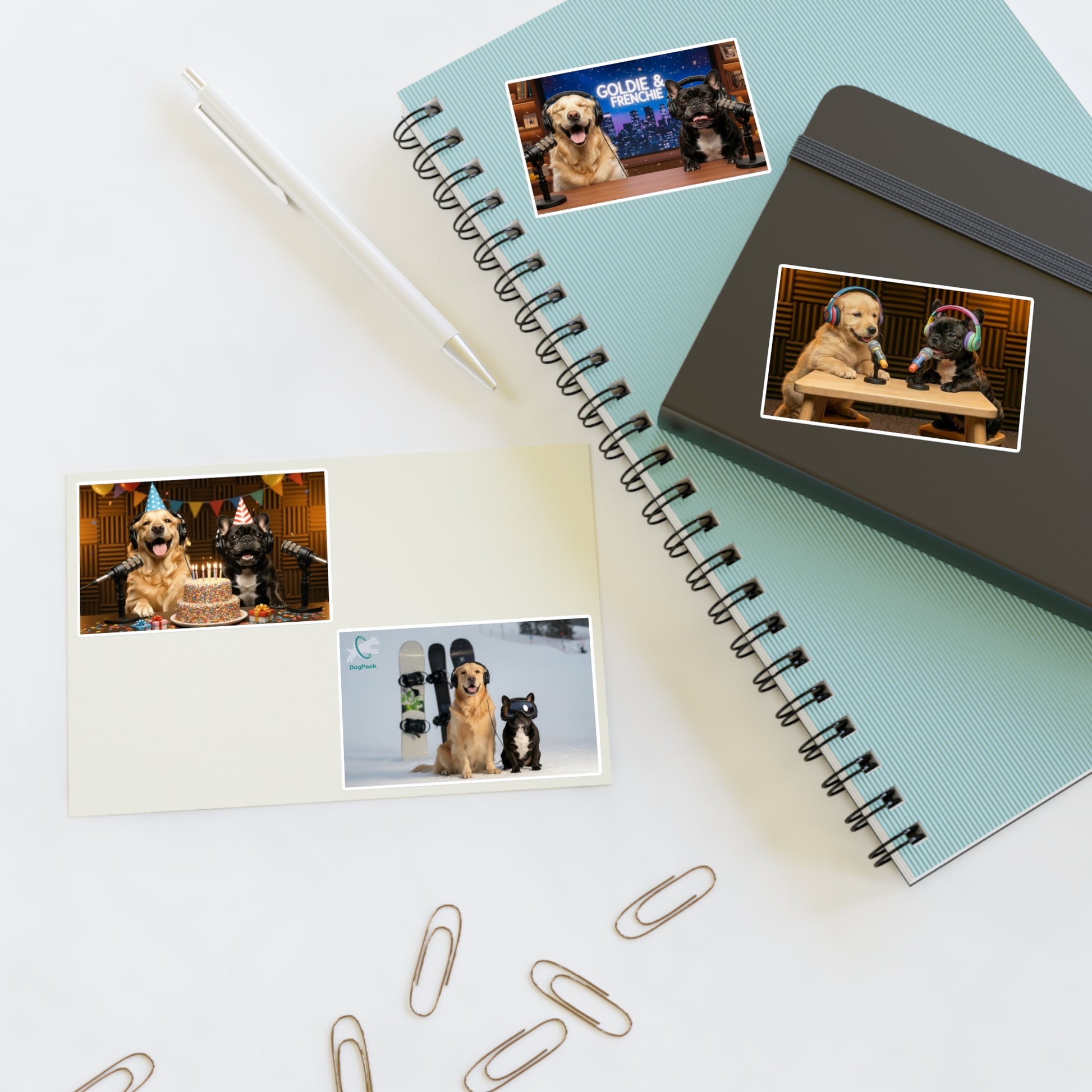Bring Goldie & Frenchie’s personalities to life with this playful sticker sheet featuring four unique designs of the duo in different everyday moments. From behind the mic on a talk show set, to celebrating on air, to snowboarding, and as puppies, each sticker captures a fun snapshot of their world.