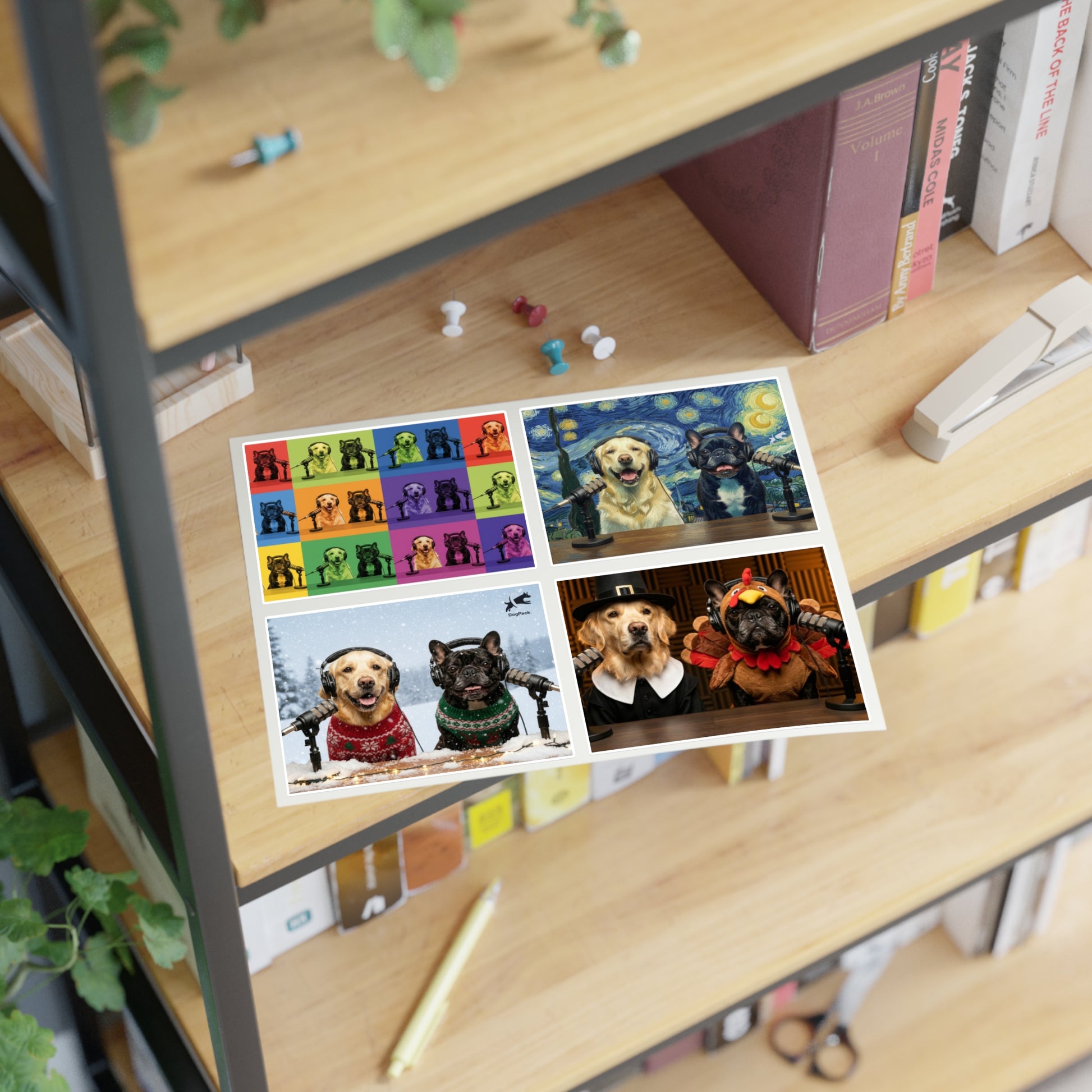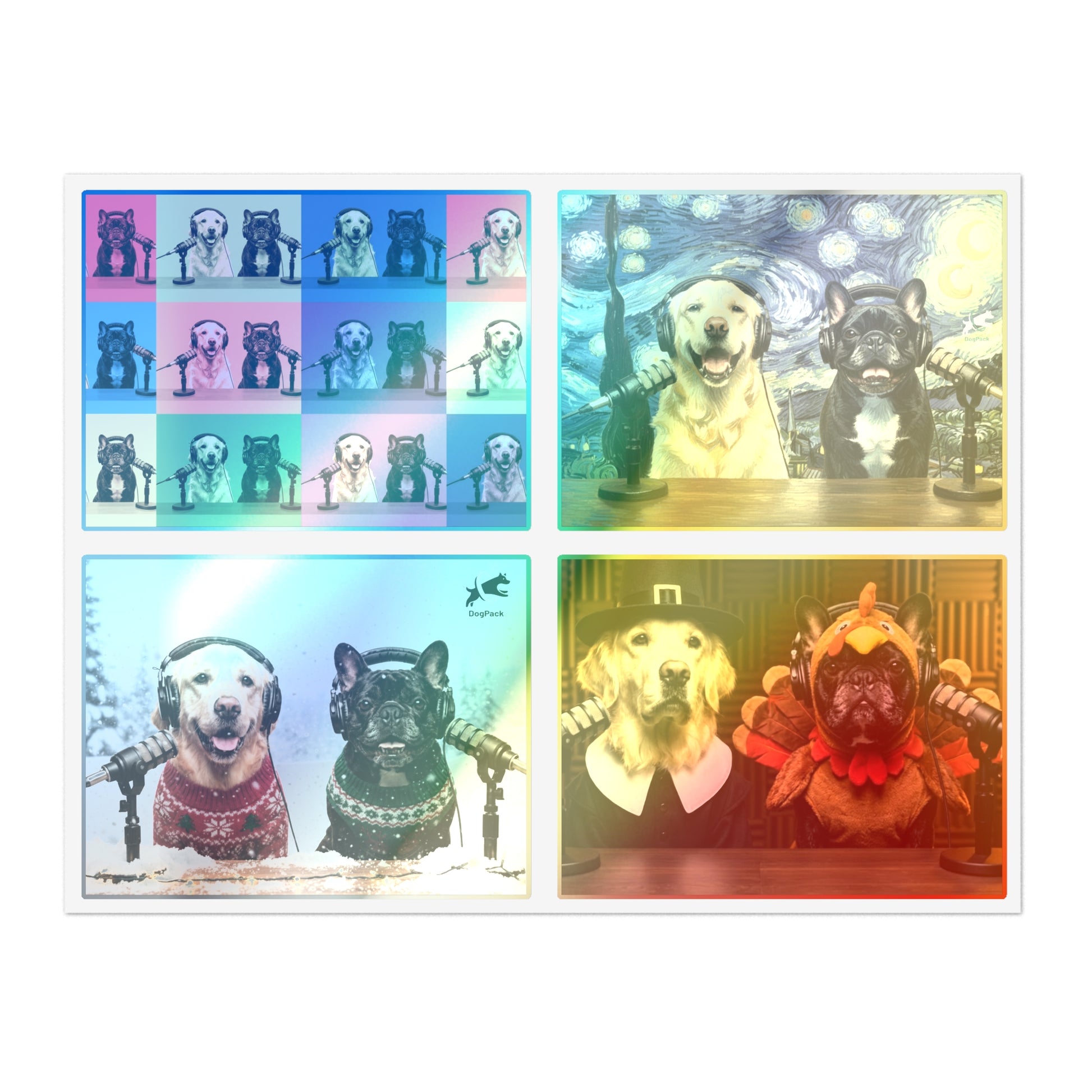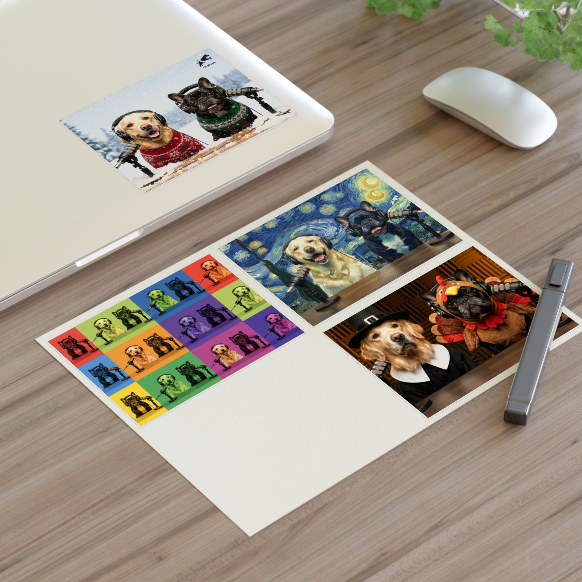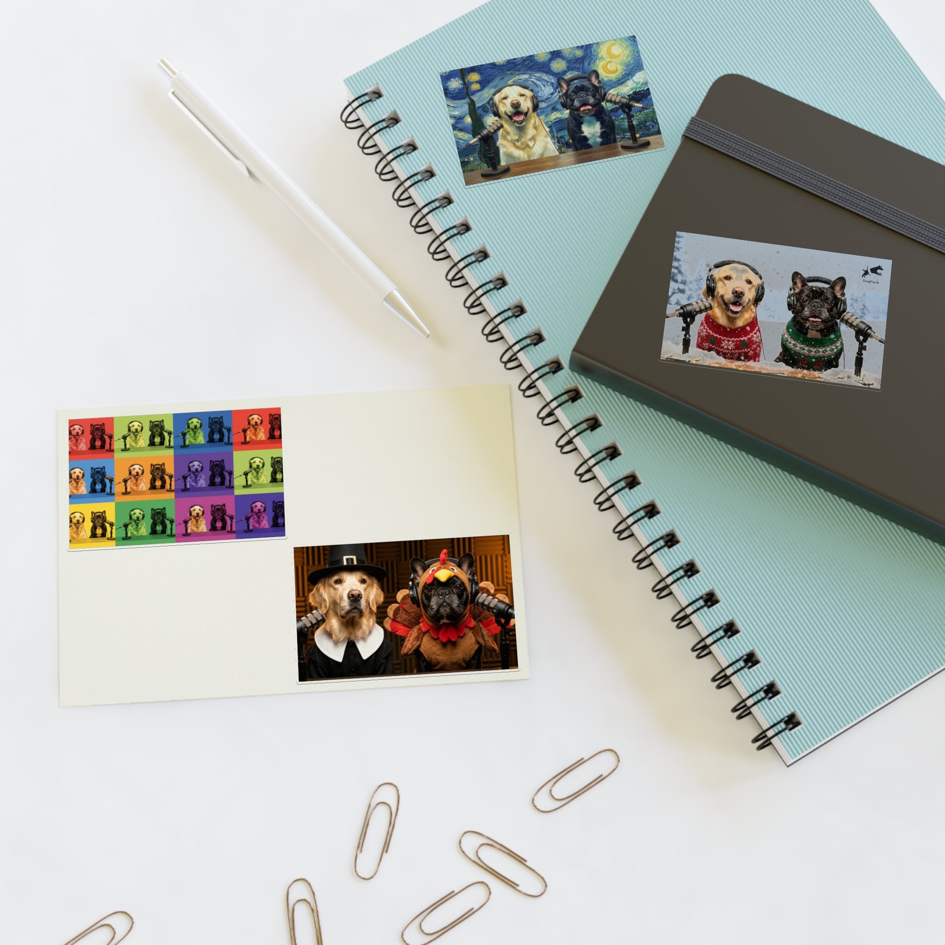 Goldie & Frenchie — Sheet of 4 Popular Stickers with backgrounds, Warhol, Van Gogh, Winter, Thanksgiving