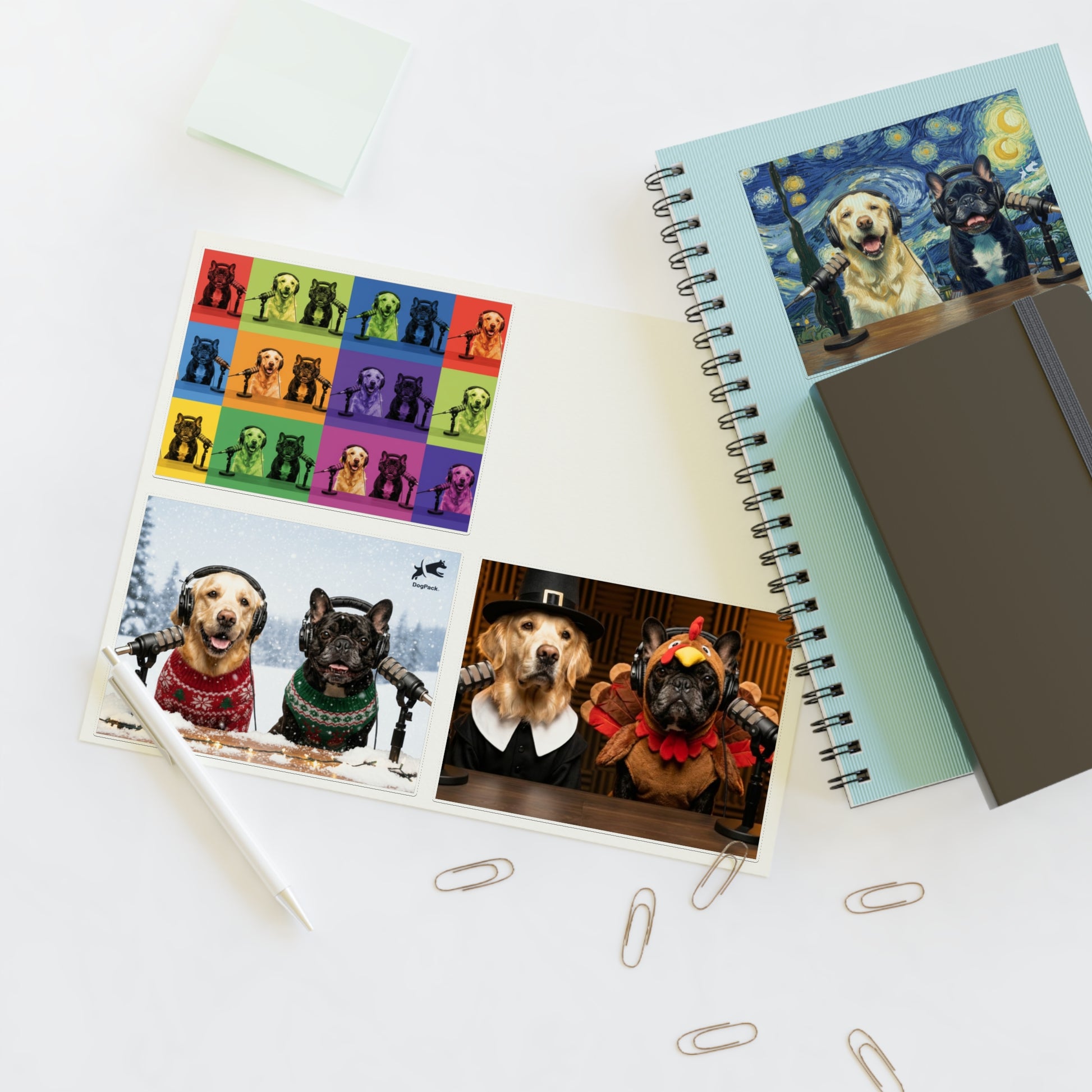 Bring Goldie & Frenchie’s personalities to life with this playful sticker sheet featuring four unique designs of the duo in different everyday moments. From pop-art to impressionist style, to the cold outdoors and serious Thanksgiving costumes, each sticker captures a fun snapshot of their world.