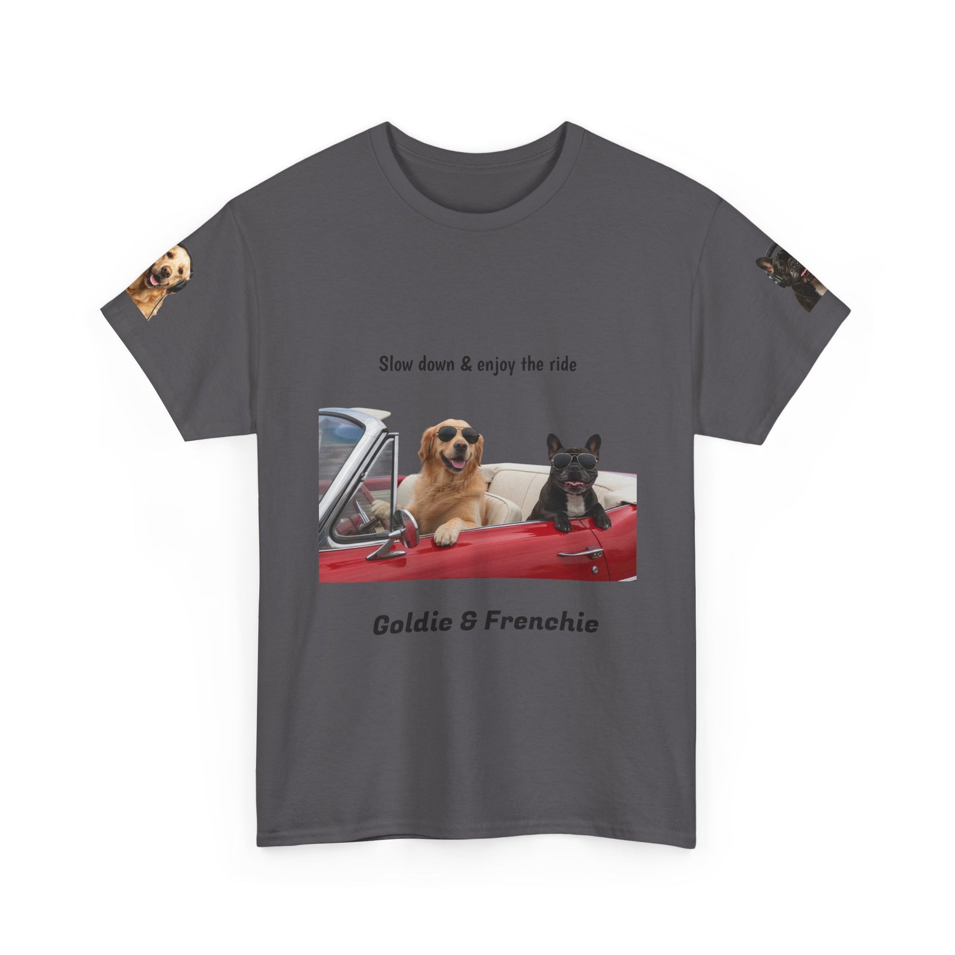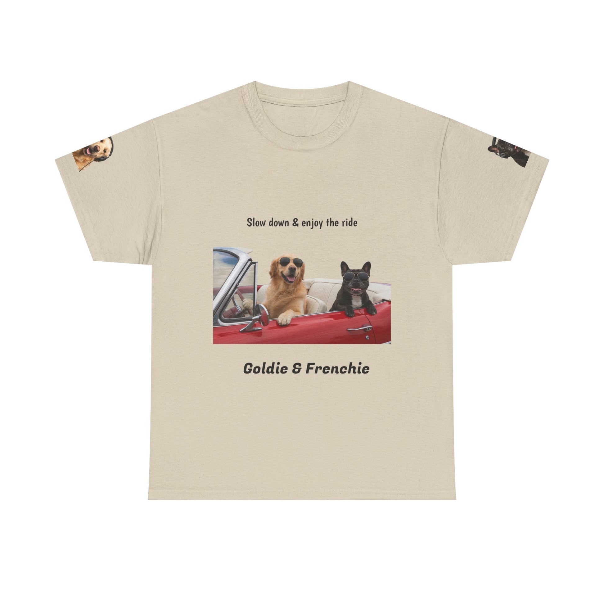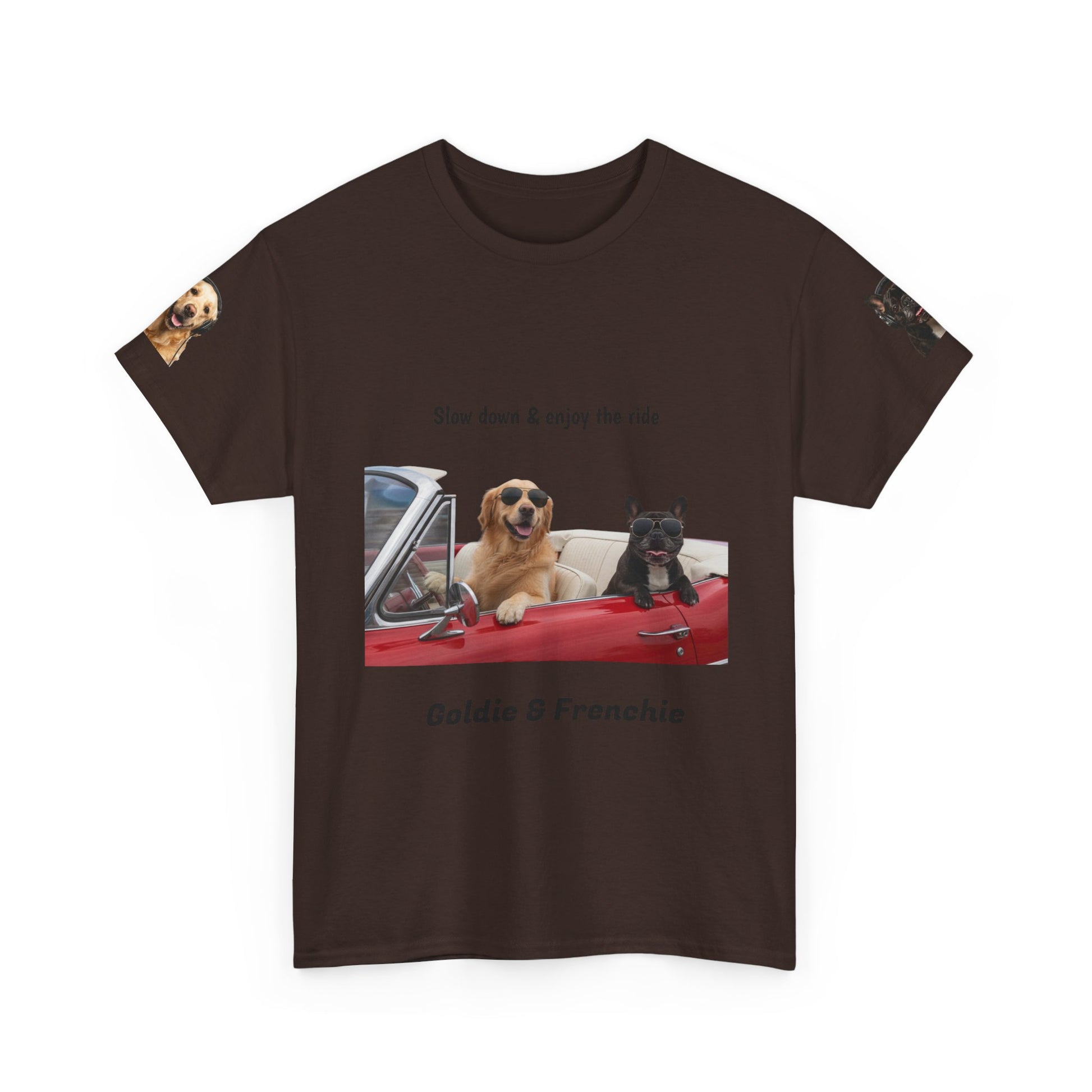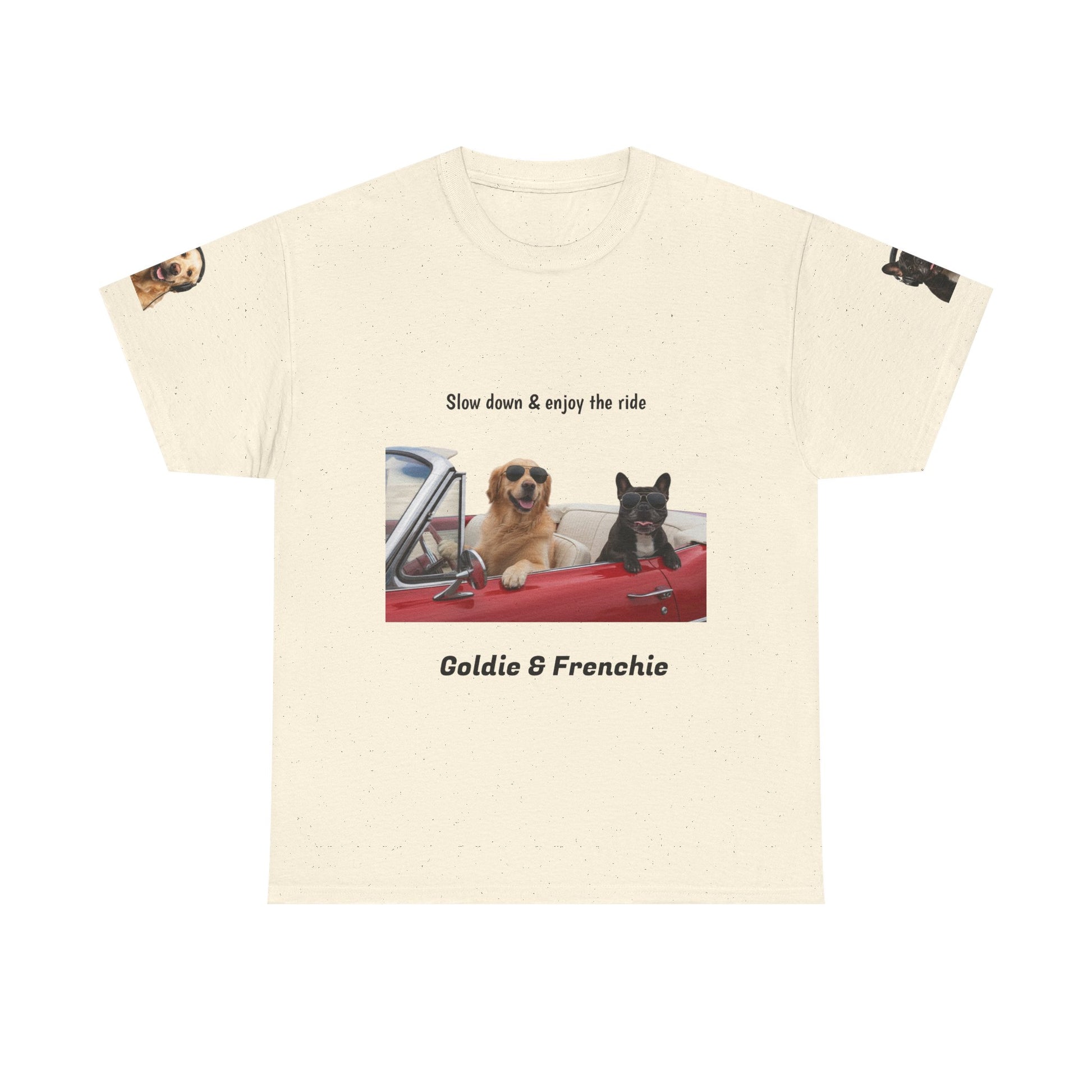 This soft, classic tee carries the easy joy of an afternoon drive with Goldie & Frenchie riding shotgun — sunglasses on, breeze in the fur, and the reminder to “Slow down & enjoy the ride.” It’s simple, calm, and quietly happy — like the moment the sun hits the car just right and you forget you were ever in a hurry.