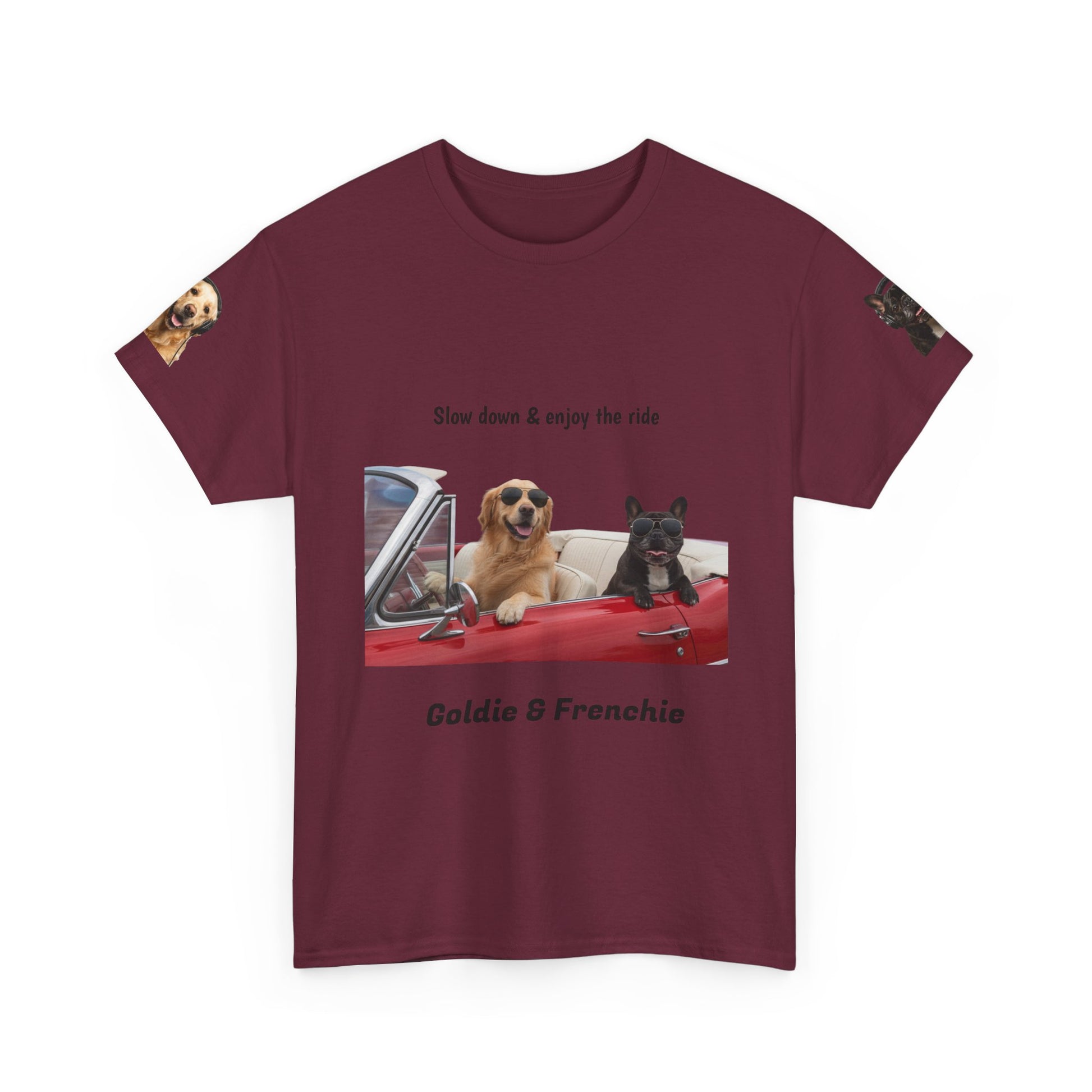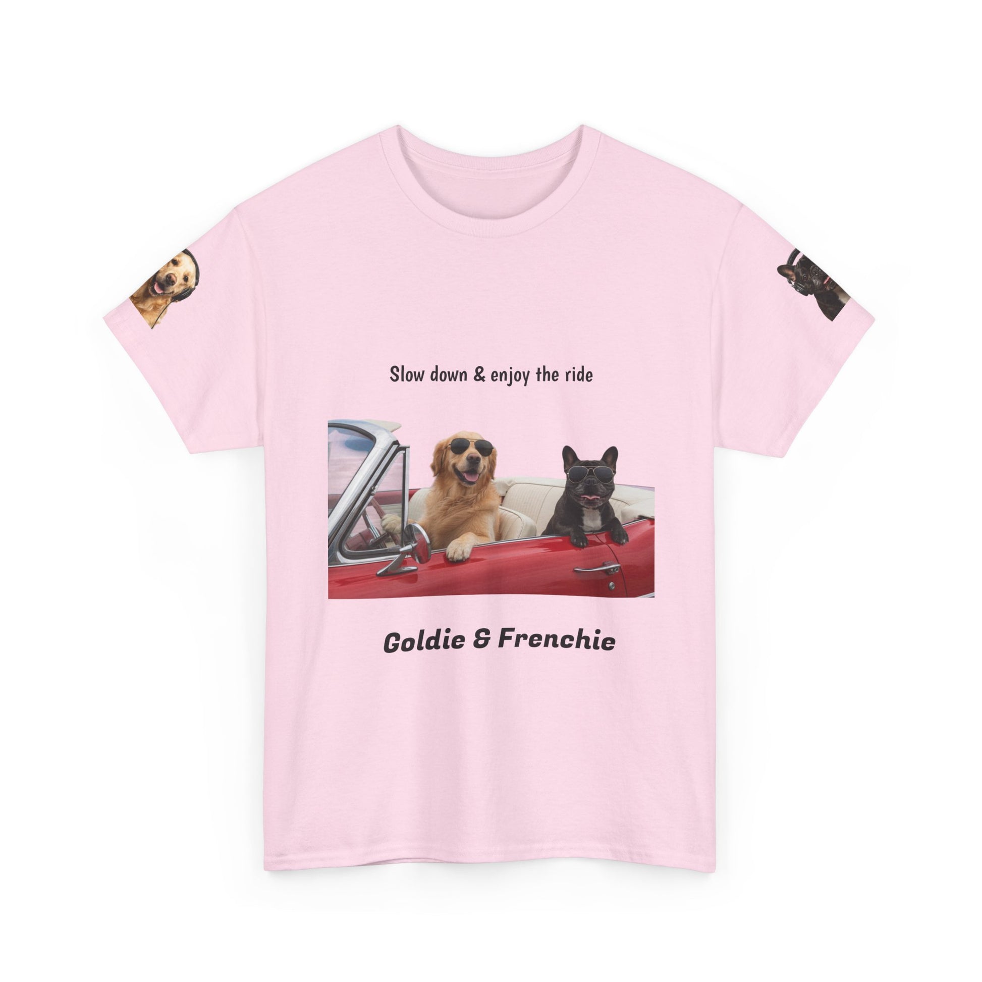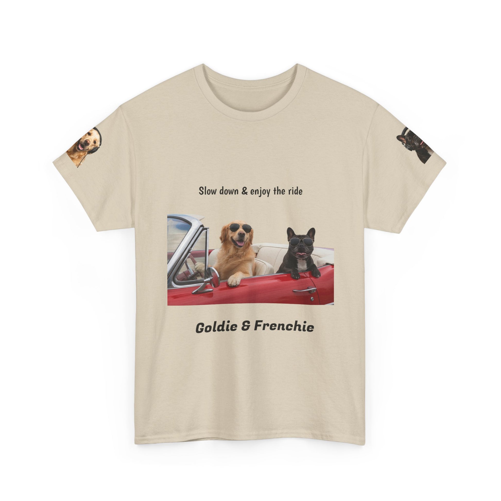 This soft, classic tee carries the easy joy of an afternoon drive with Goldie & Frenchie riding shotgun — sunglasses on, breeze in the fur, and the reminder to “Slow down & enjoy the ride.” It’s simple, calm, and quietly happy — like the moment the sun hits the car just right and you forget you were ever in a hurry.
