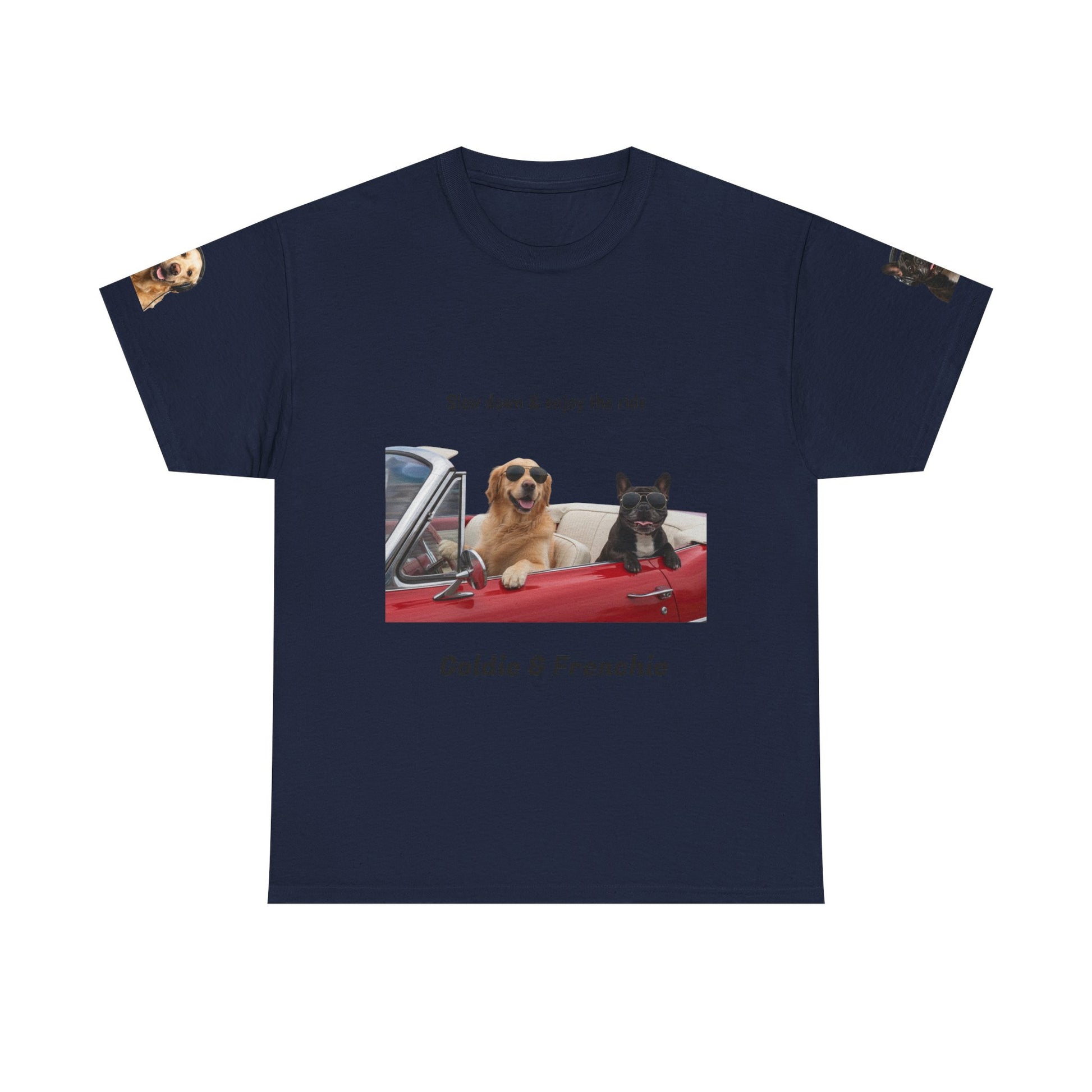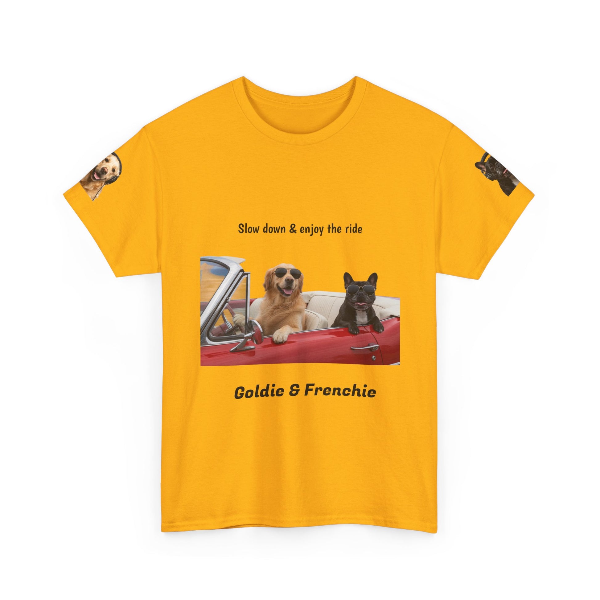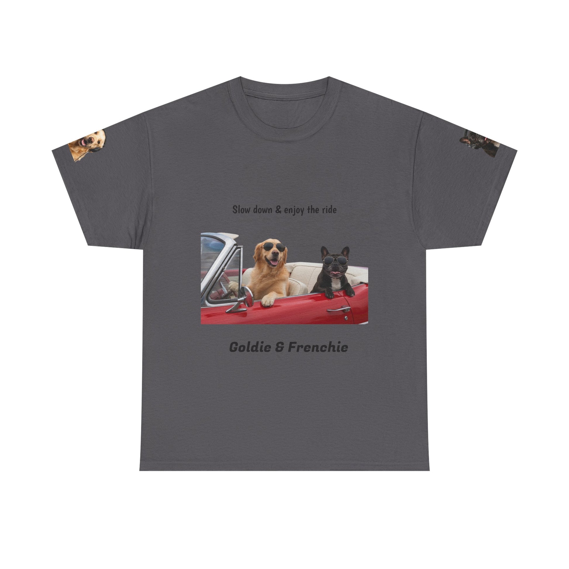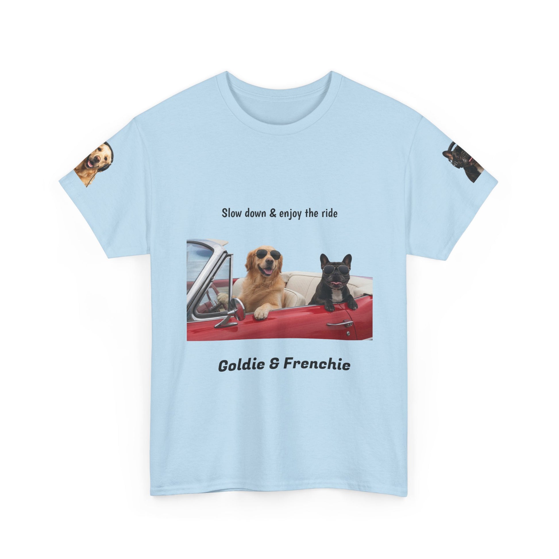 This soft, classic tee carries the easy joy of an afternoon drive with Goldie & Frenchie riding shotgun — sunglasses on, breeze in the fur, and the reminder to “Slow down & enjoy the ride.” It’s simple, calm, and quietly happy — like the moment the sun hits the car just right and you forget you were ever in a hurry.
