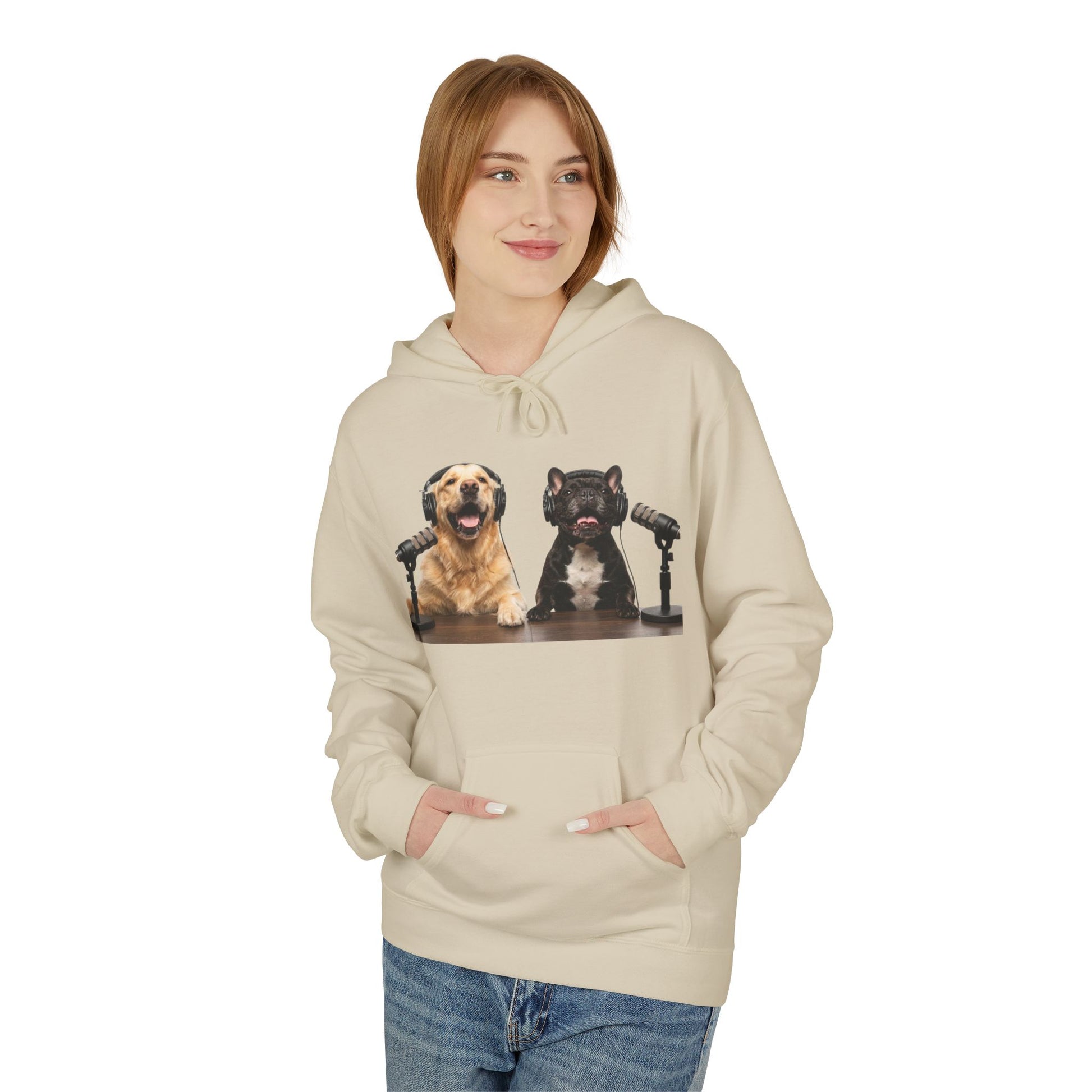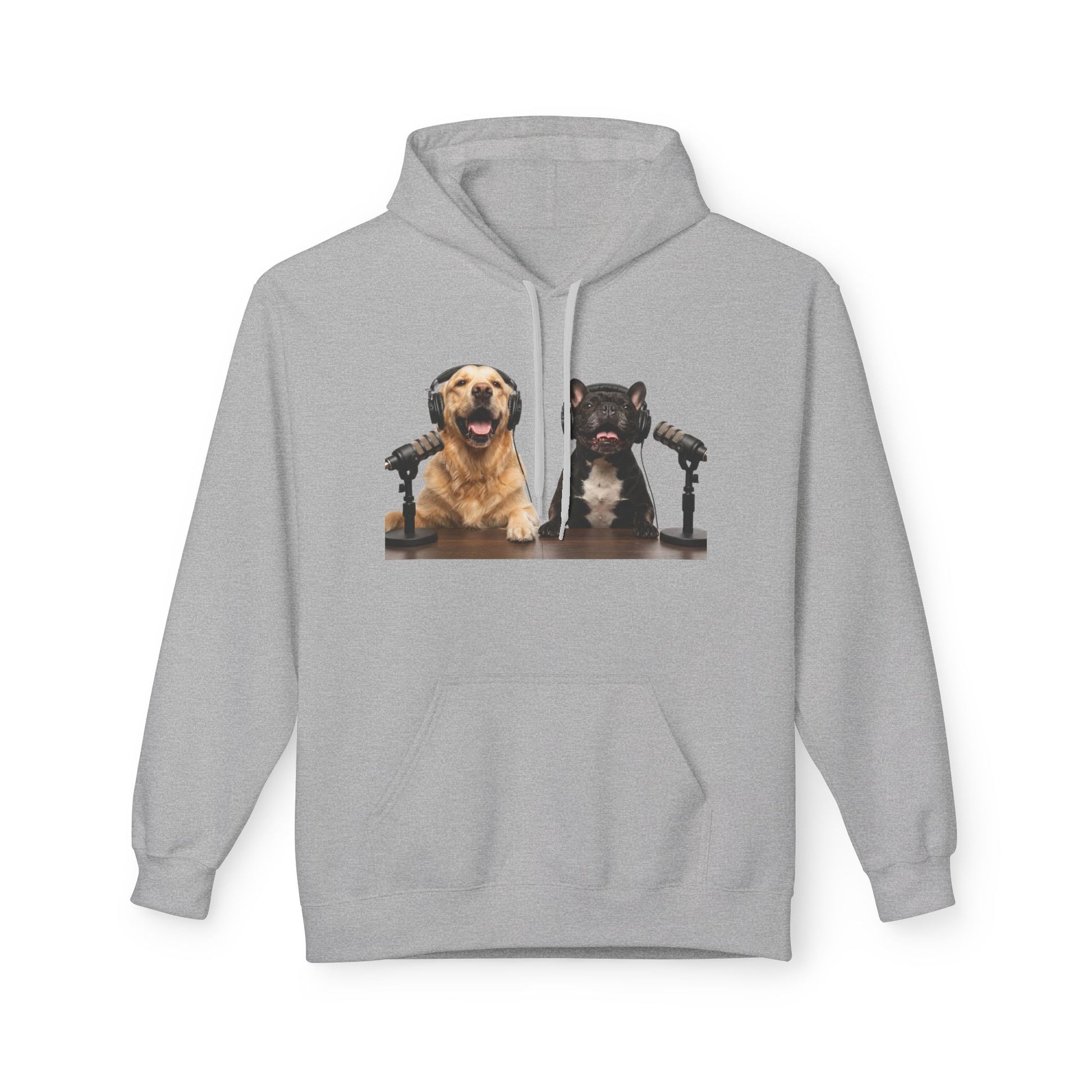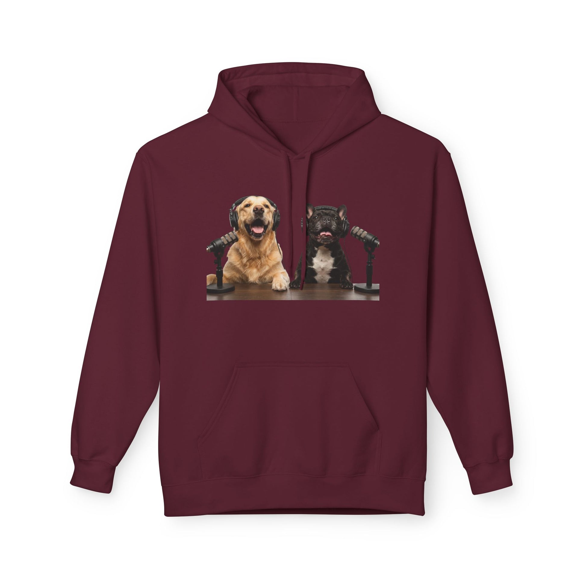 Two dogs, one podcast, and a hoodie that lets you support the show every time you wear it. Goldie and Frenchie sit mid-conversation — mics up, expressions locked in — printed on a soft, cozy midweight fleece that keeps the artwork crisp and the silhouette relaxed. The drop-shoulder fit and roomy pouch pocket make it a go-to layer for coffee runs, editing sessions, long walks, or any day you want comfort with personality.
