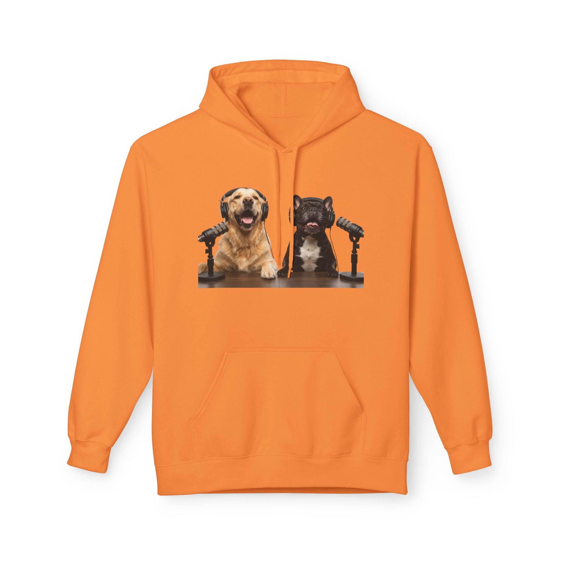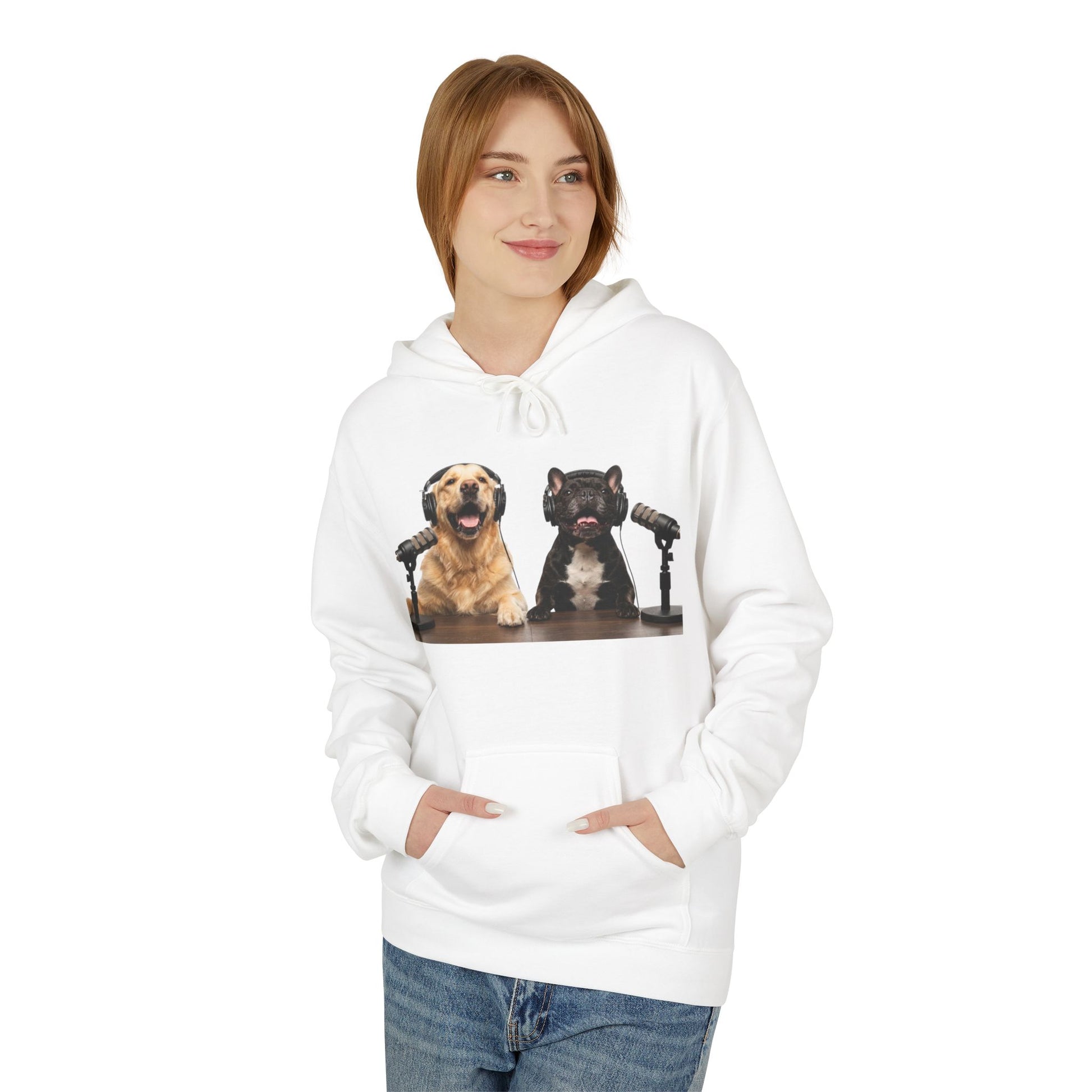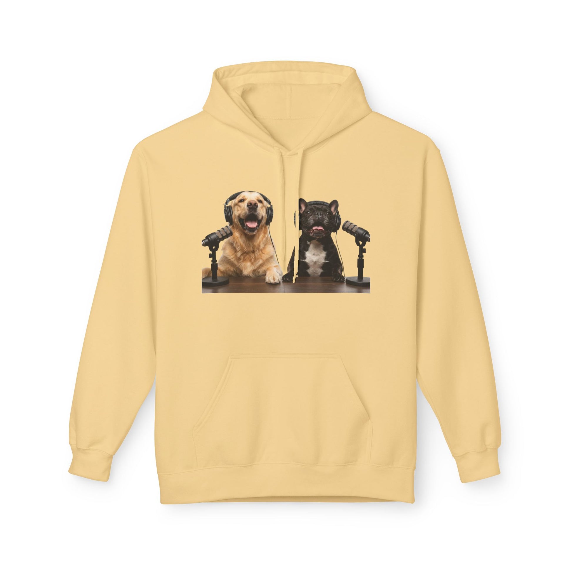 Two dogs, one podcast, and a hoodie that lets you support the show every time you wear it. Goldie and Frenchie sit mid-conversation — mics up, expressions locked in — printed on a soft, cozy midweight fleece that keeps the artwork crisp and the silhouette relaxed. The drop-shoulder fit and roomy pouch pocket make it a go-to layer for coffee runs, editing sessions, long walks, or any day you want comfort with personality.