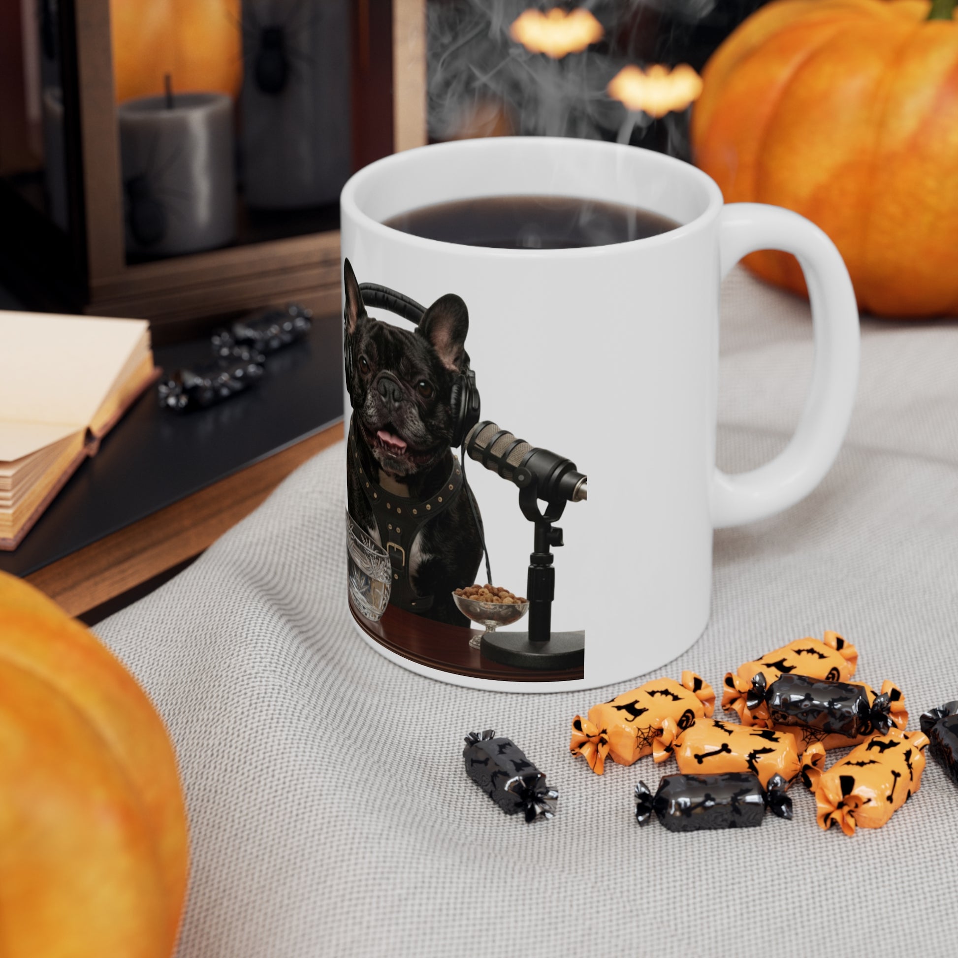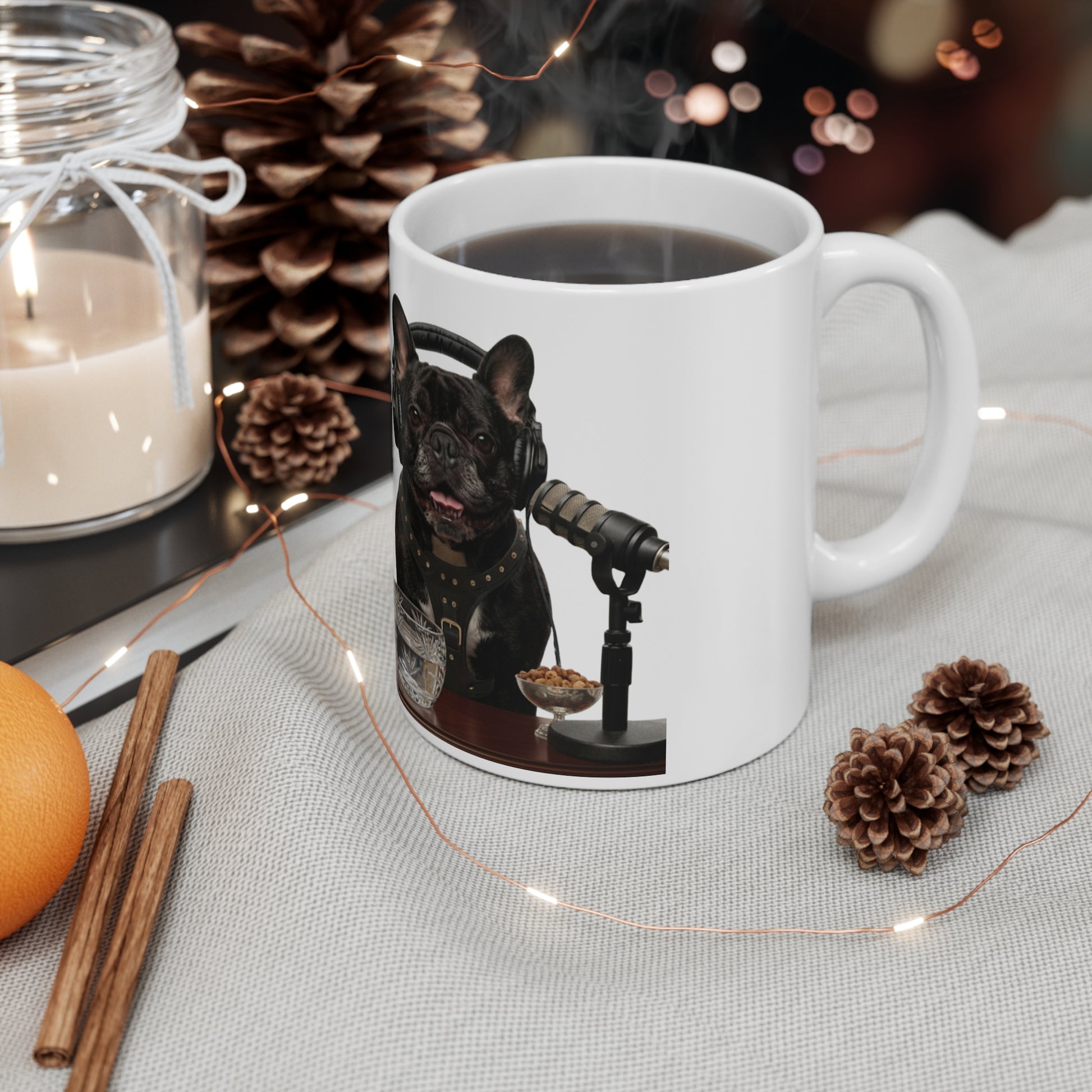The artwork wraps fully around the mug, so the scene comes to life from every angle. A sturdy build, smooth glossy finish, and comfortable handle make it ideal for desks, kitchen counters, or cozy corners where routines take shape. Designed for dog lovers and podcast fans alike, it’s a cheerful everyday mug that adds personality without overpowering your space.