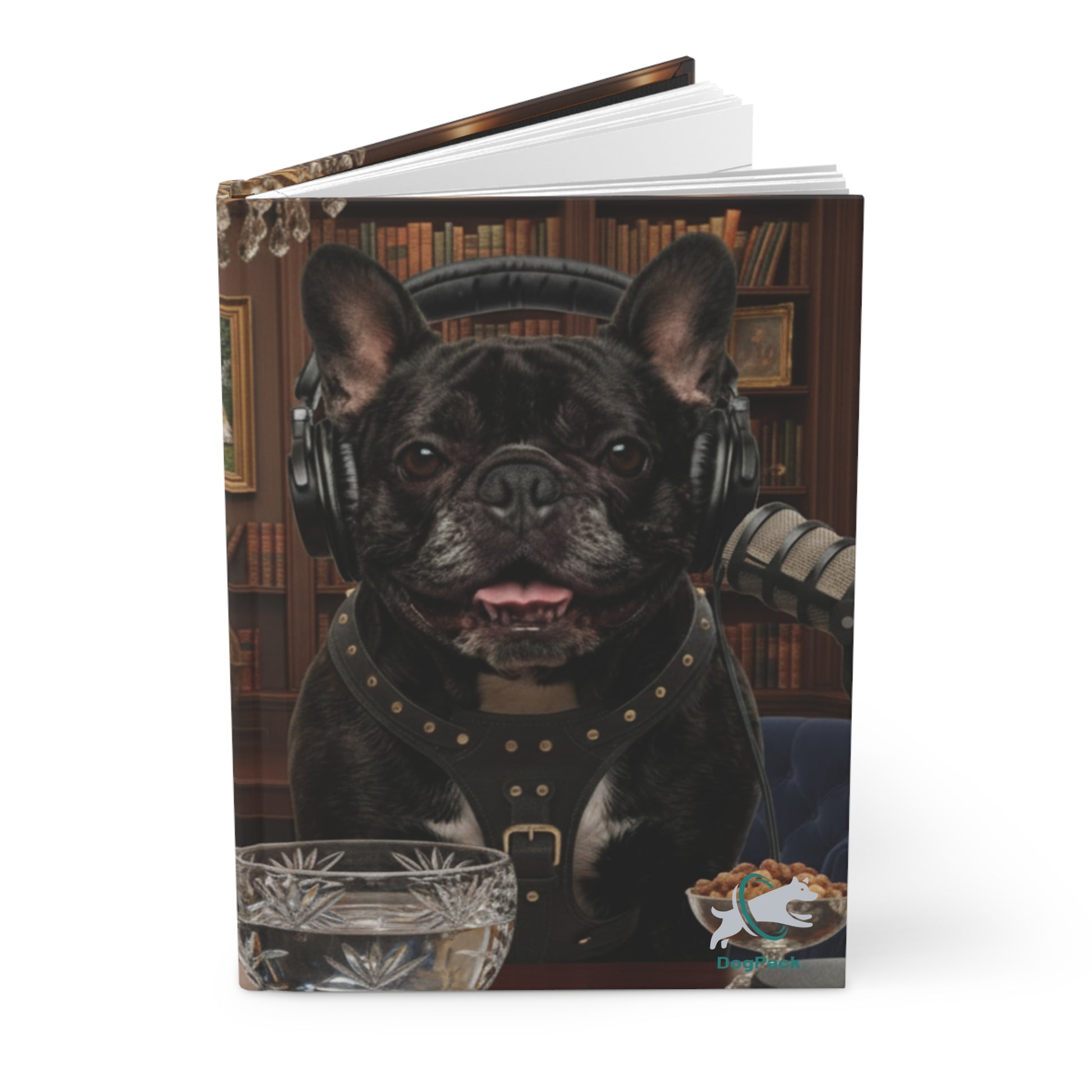 This premium hardbound journal features Goldie and Frenchie in their most refined form — bowtie, leather harness, crystal water, snack bowls and all — posed in a grand library like two aristocrats recording their latest highly intellectual discussion. The full-wrap matte cover feels velvety to the touch while the sewn casewrap binding allows the pages to lay flatter than an obedient sit-stay.