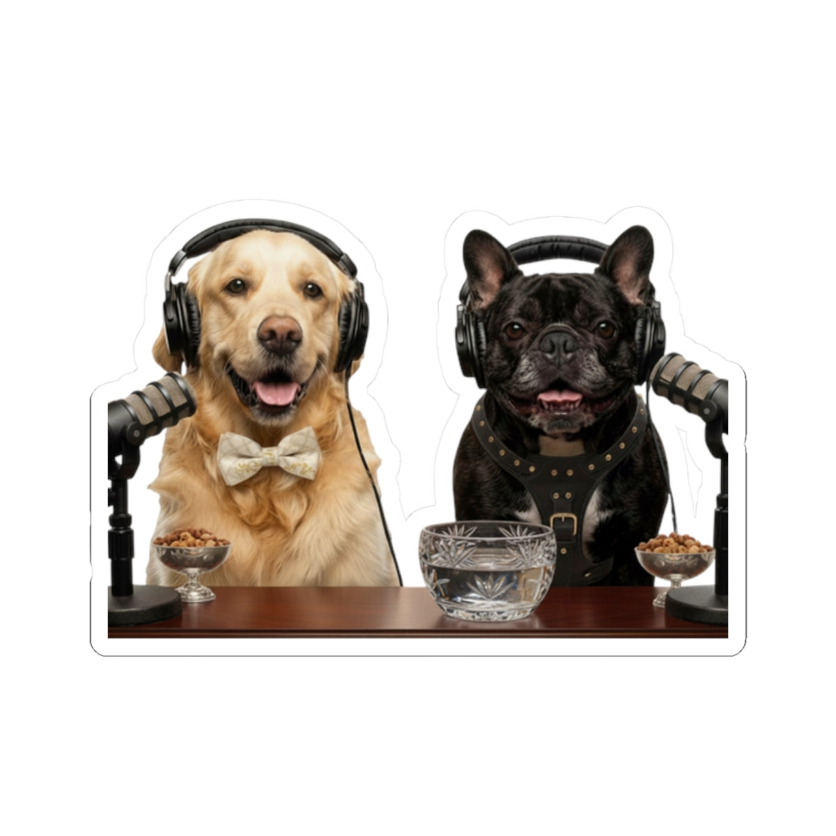 These glossy kiss-cut vinyl stickers capture Goldie & Frenchie at their most refined — poised, confident, and unmistakably sophisticated. Seated behind the mic like seasoned hosts, the duo brings a polished talk-show energy that feels equal parts charm and quiet authority. This is Goldie & Frenchie in their Sophisticated & Wealthy era: calm expressions, composed posture, and a presence that speaks without trying too hard.