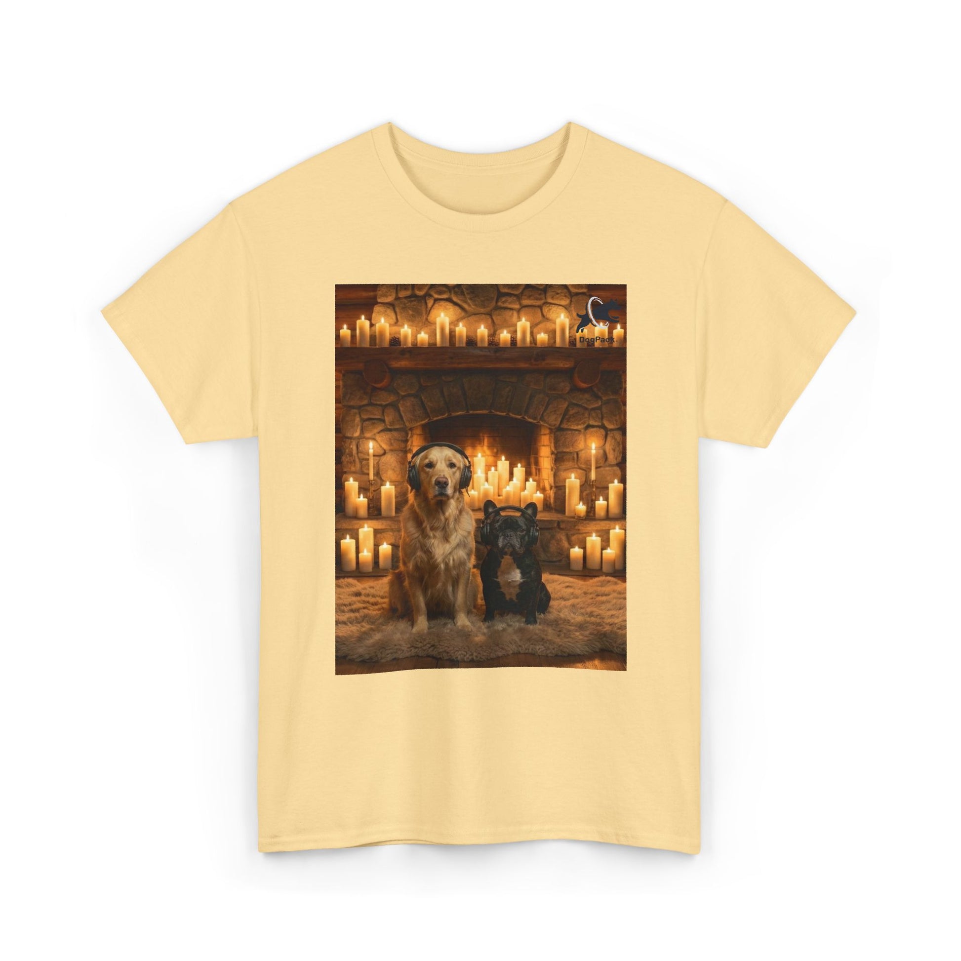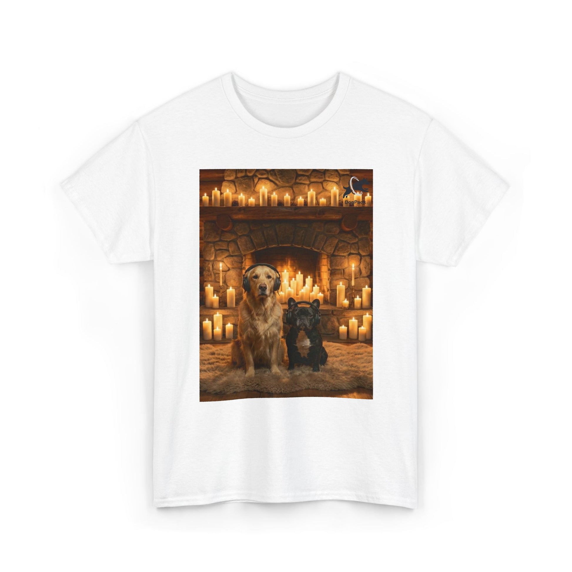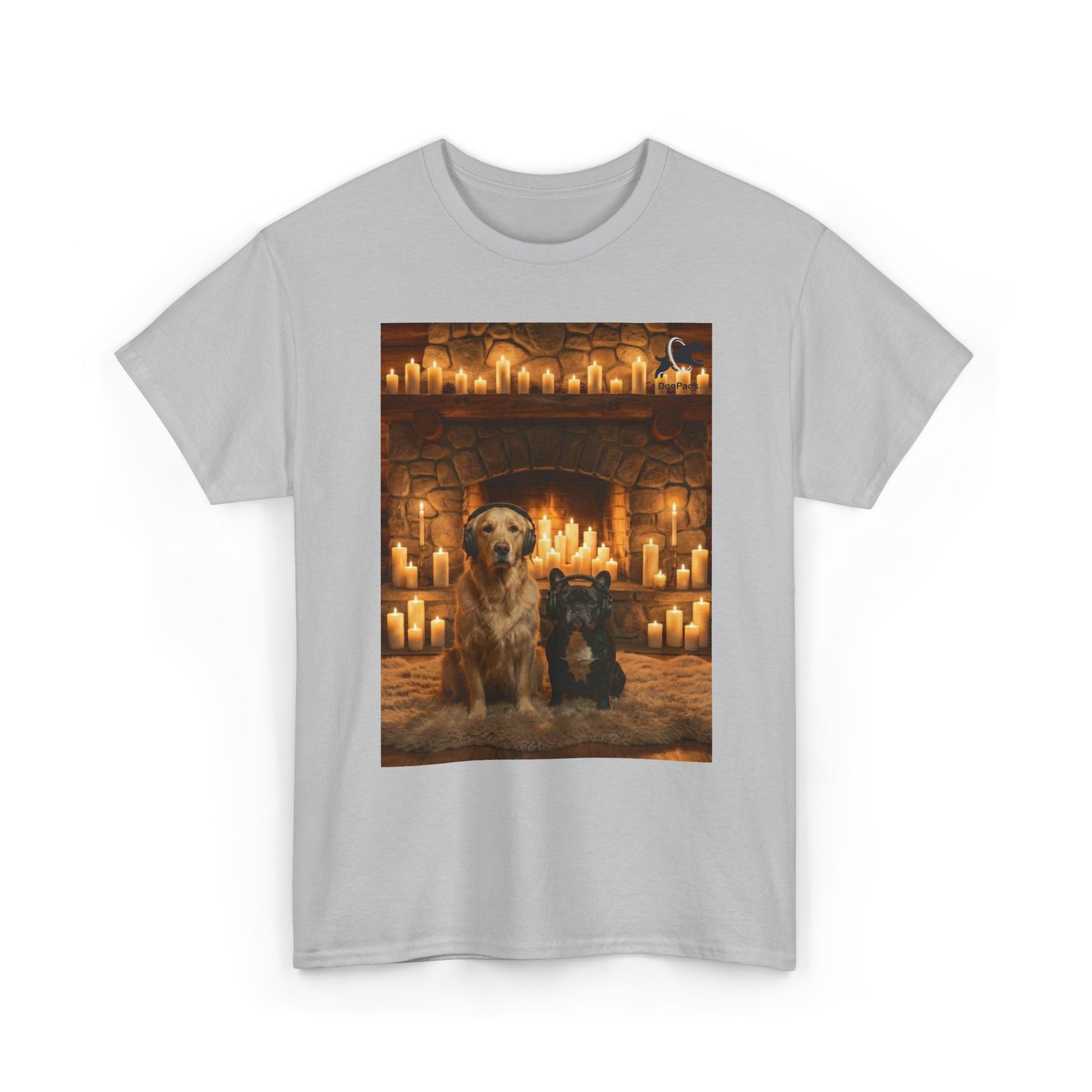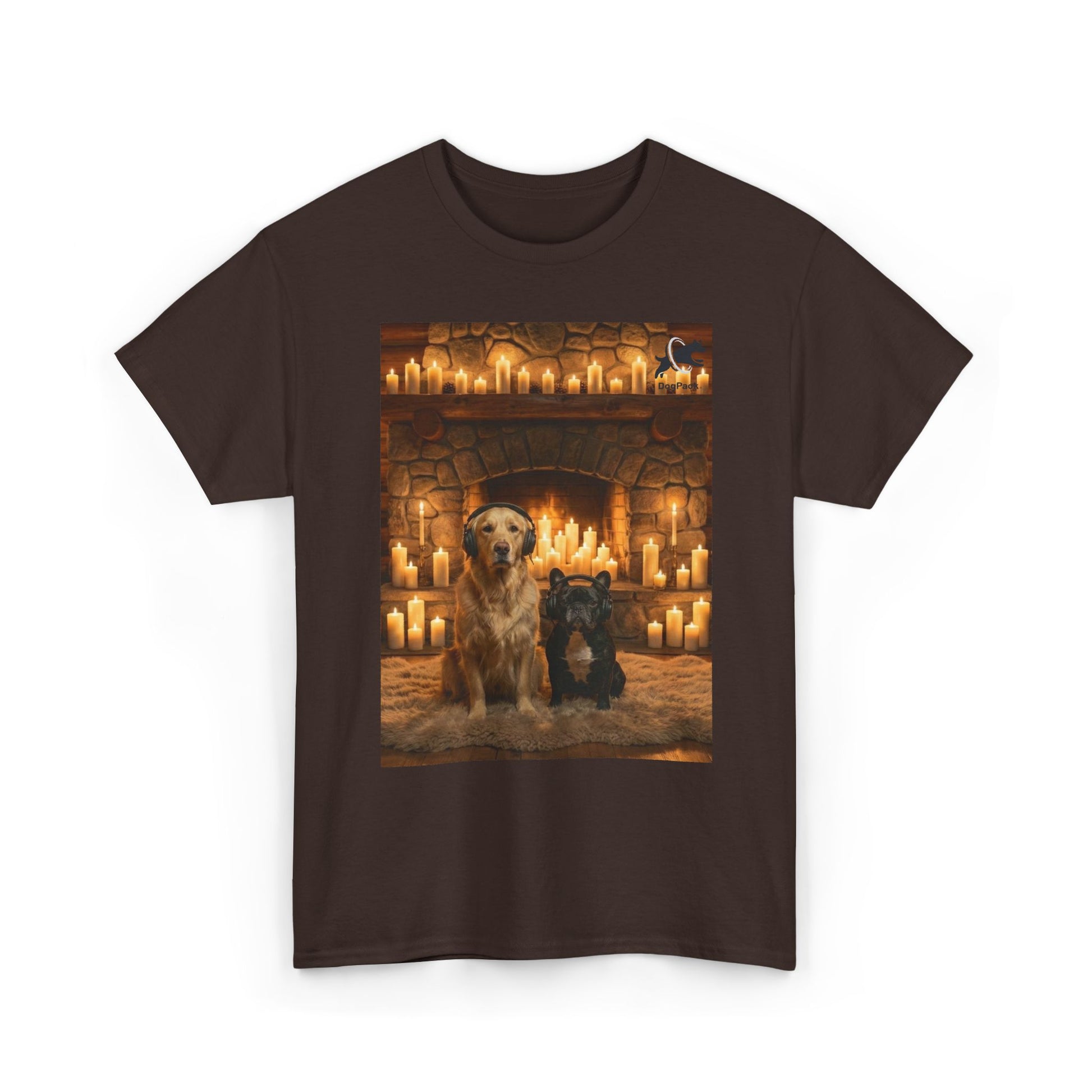 This tee captures the duo sitting together in front of a candle-lit fireplace, surrounded by warm light and a peaceful, cozy atmosphere. It feels like a calm winter evening, where everything slows down and the only thing that matters is comfort, friendship, and being present. Goldie brings the gentle warmth, while Frenchie adds that grounded, watchful charm that makes the scene feel complete.