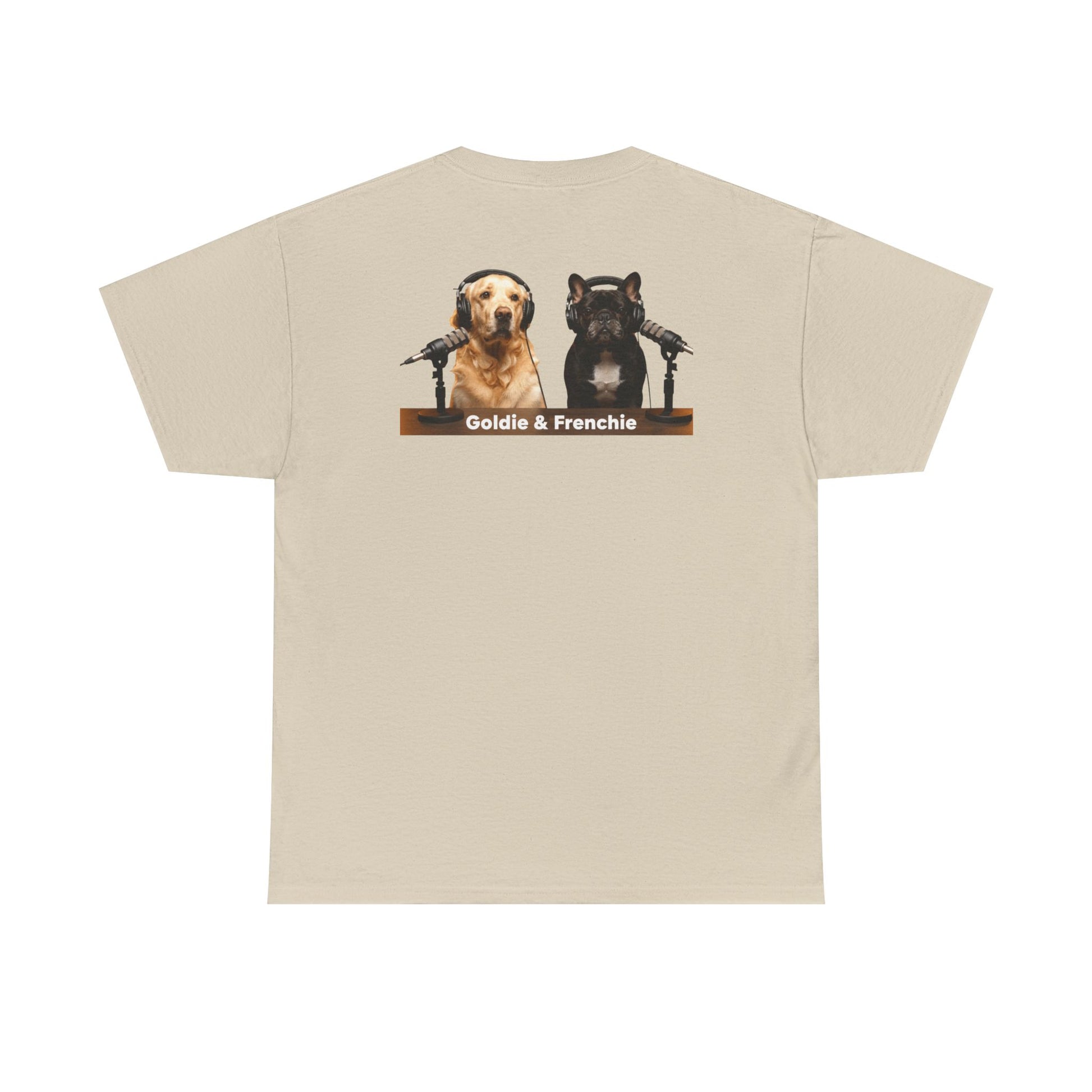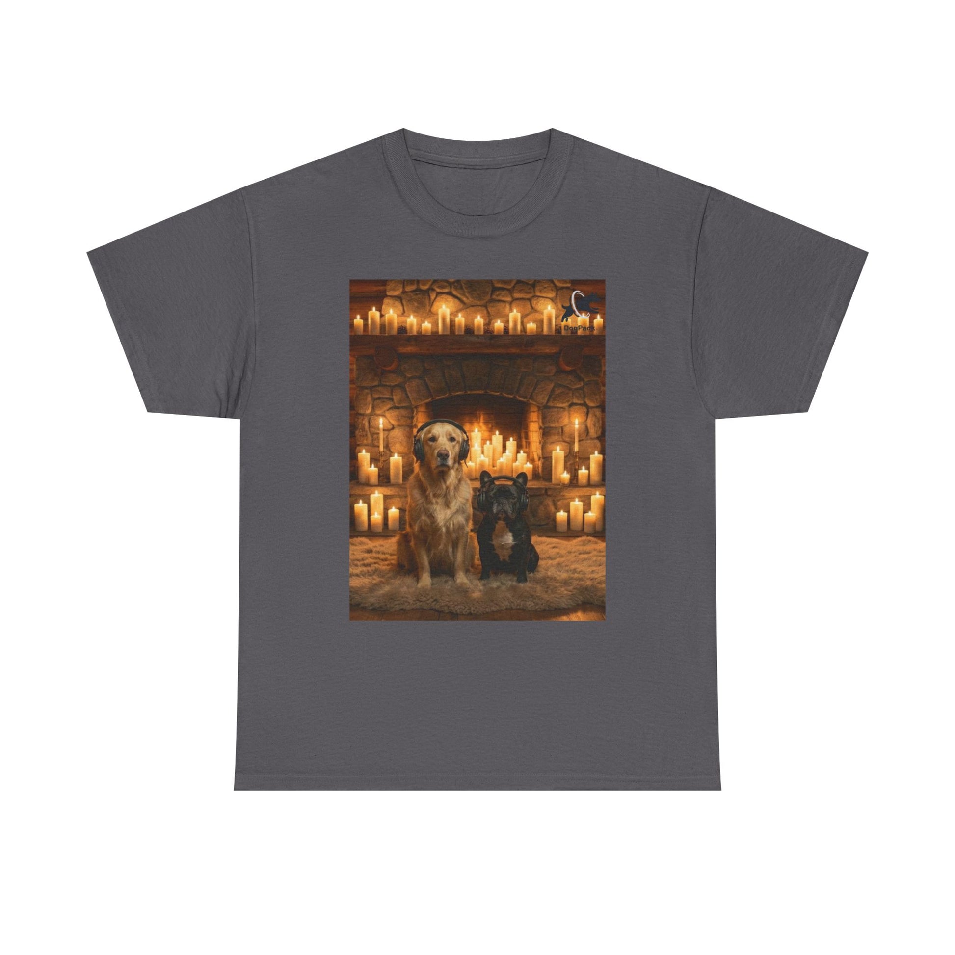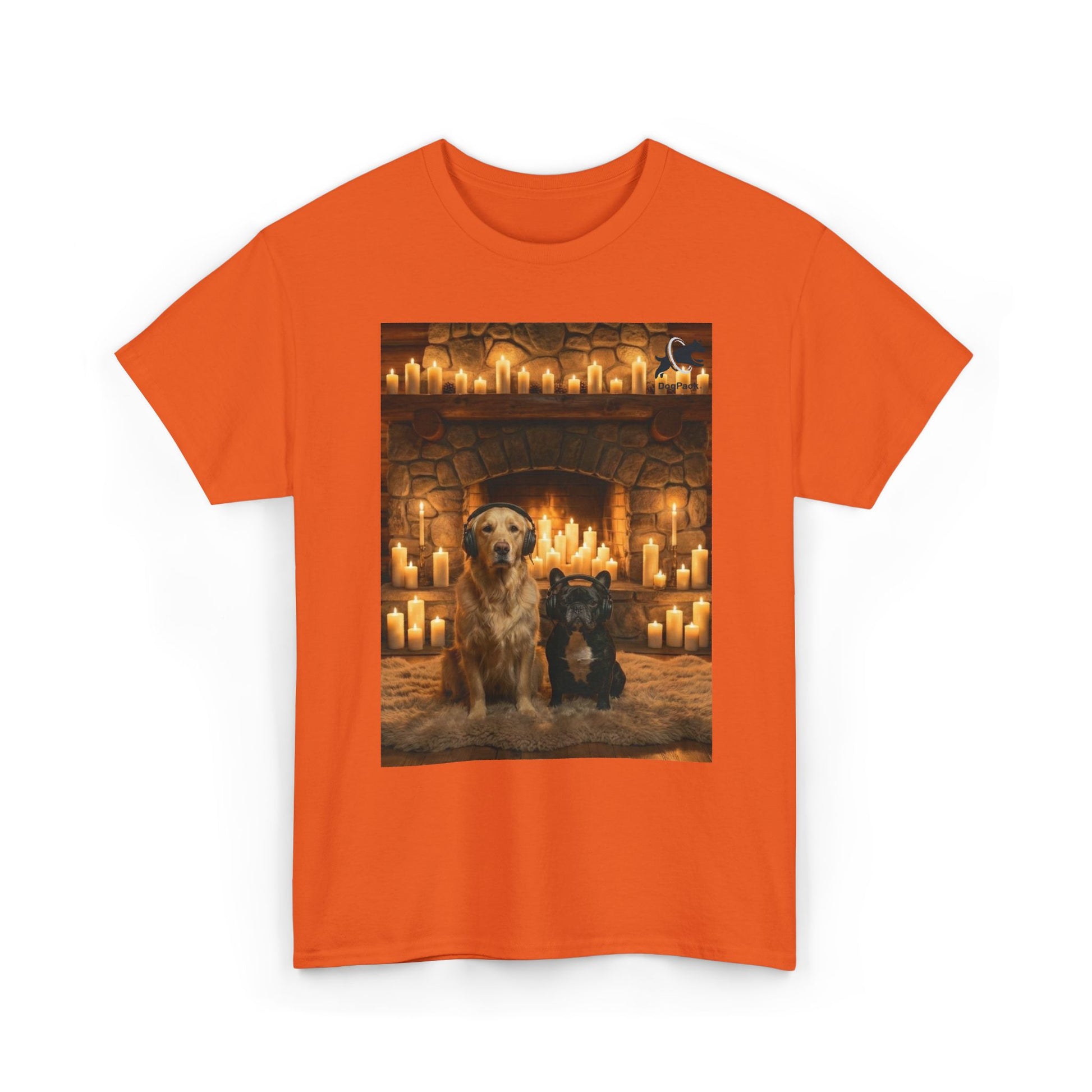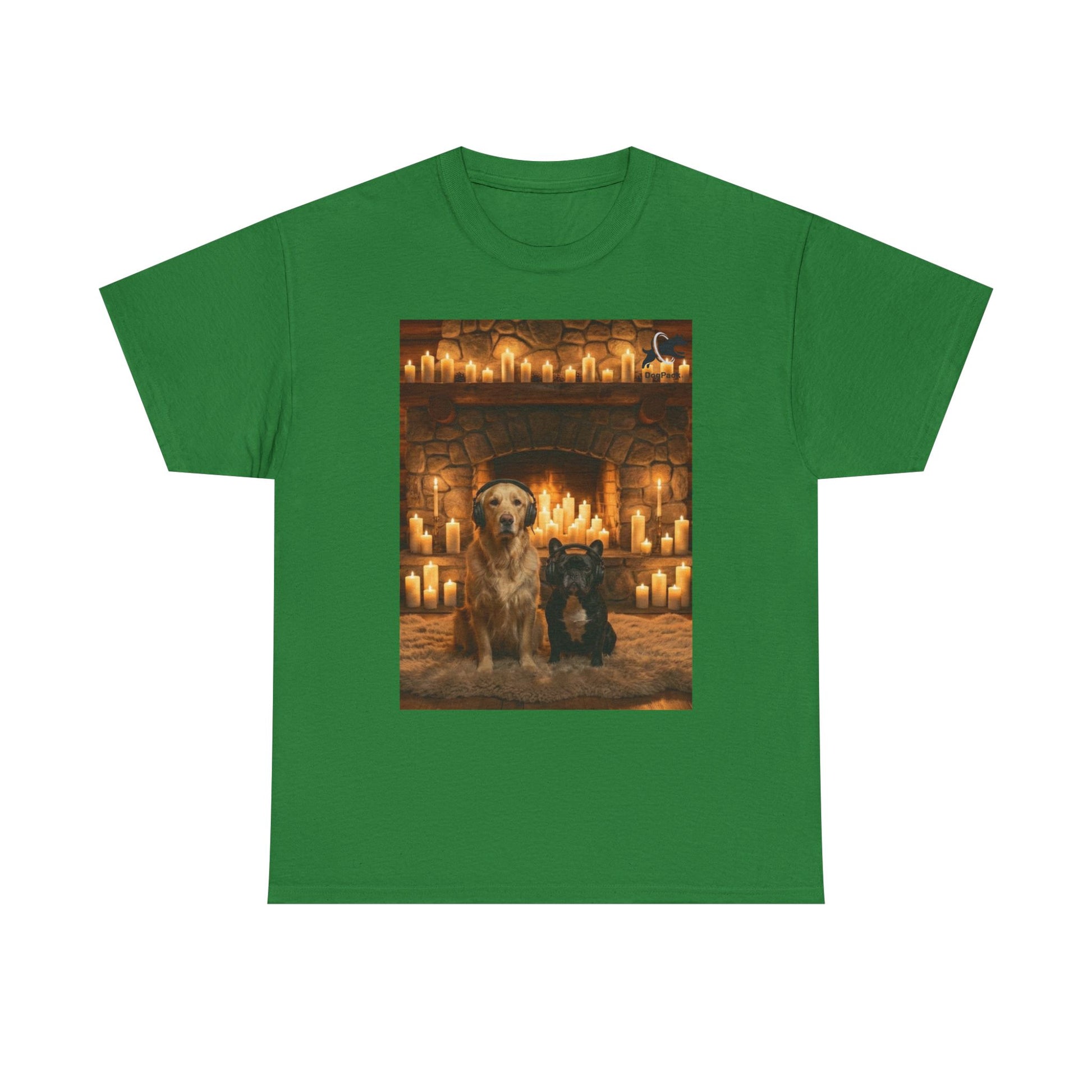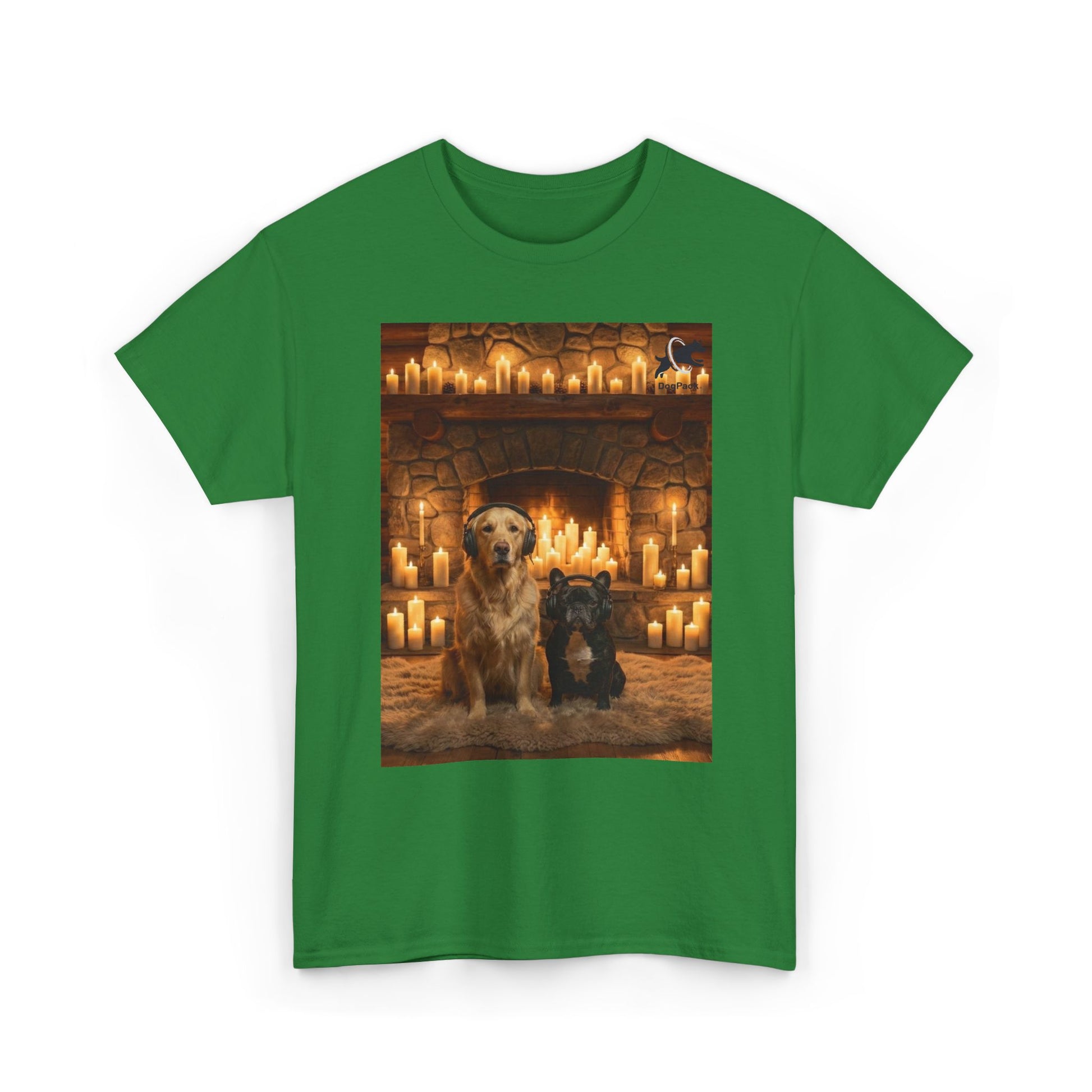 This tee captures the duo sitting together in front of a candle-lit fireplace, surrounded by warm light and a peaceful, cozy atmosphere. It feels like a calm winter evening, where everything slows down and the only thing that matters is comfort, friendship, and being present. Goldie brings the gentle warmth, while Frenchie adds that grounded, watchful charm that makes the scene feel complete.