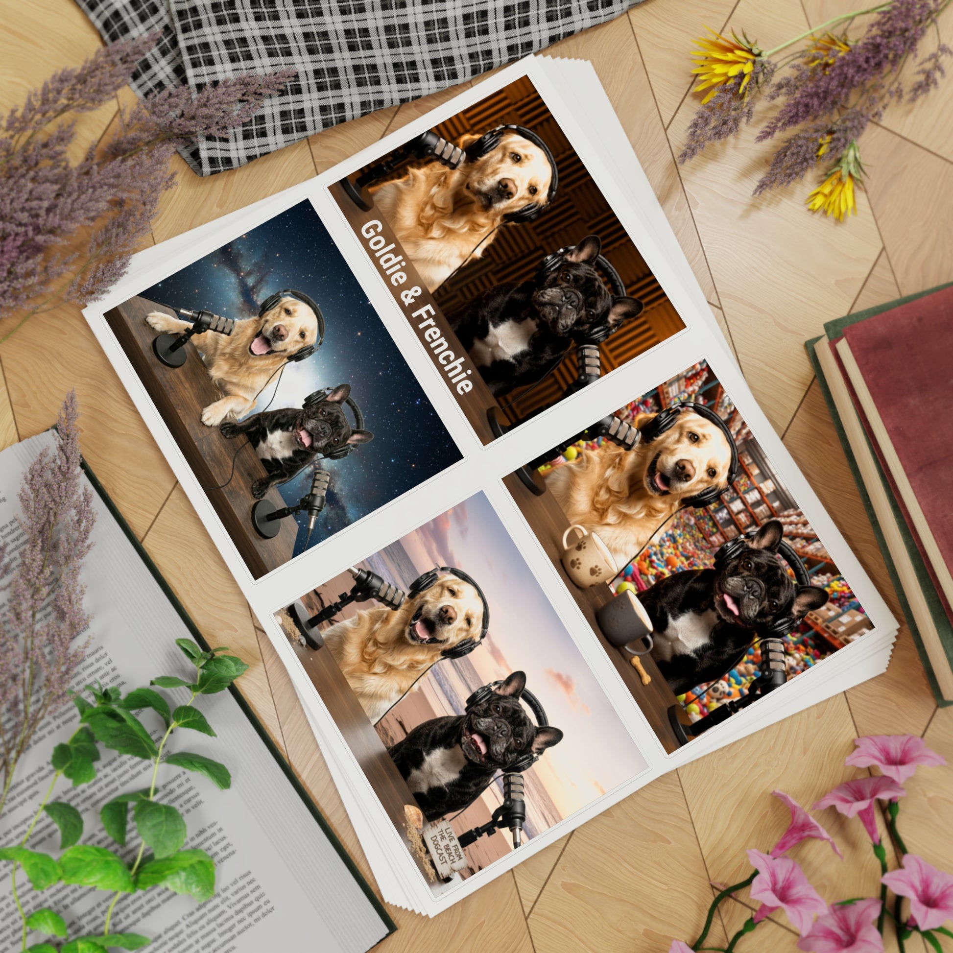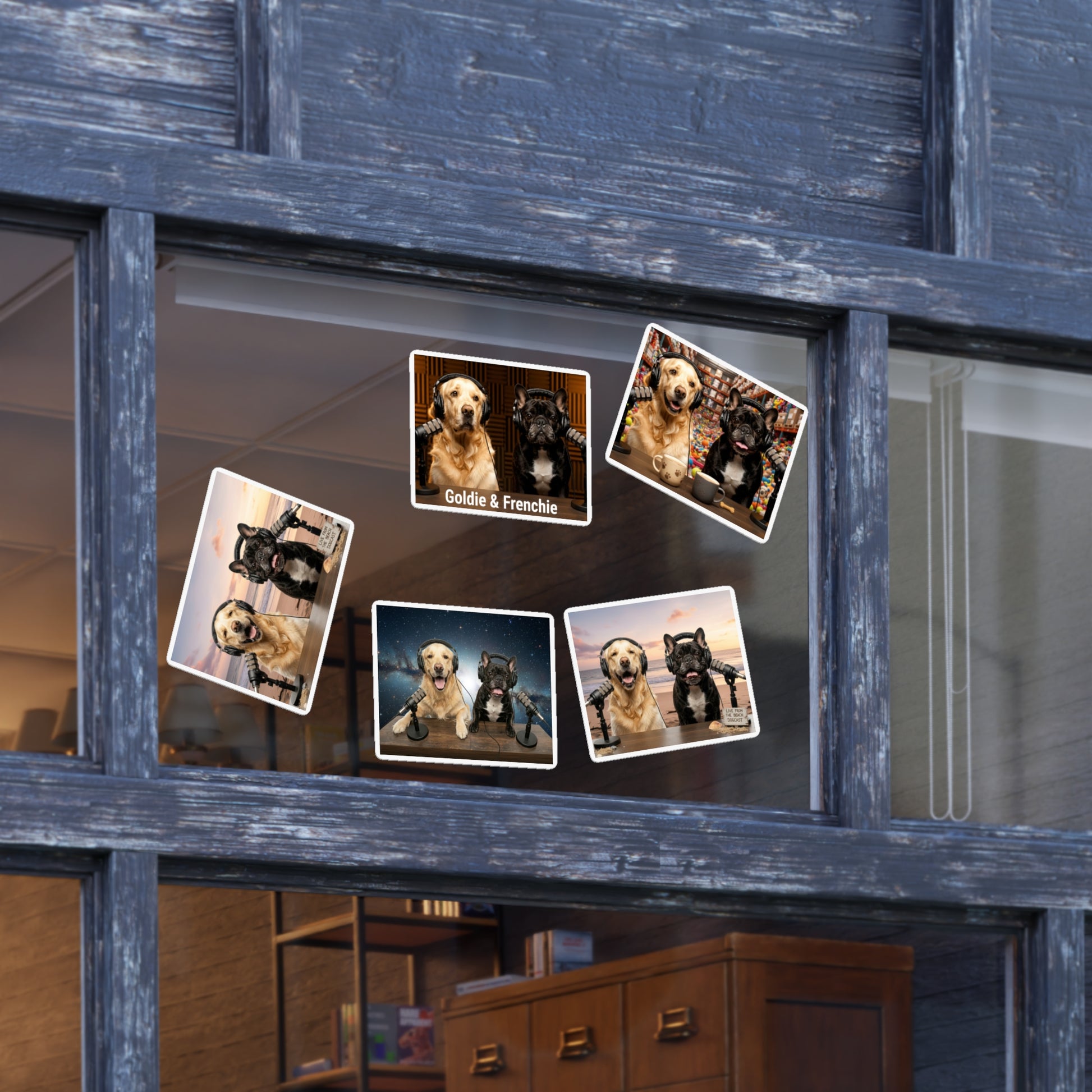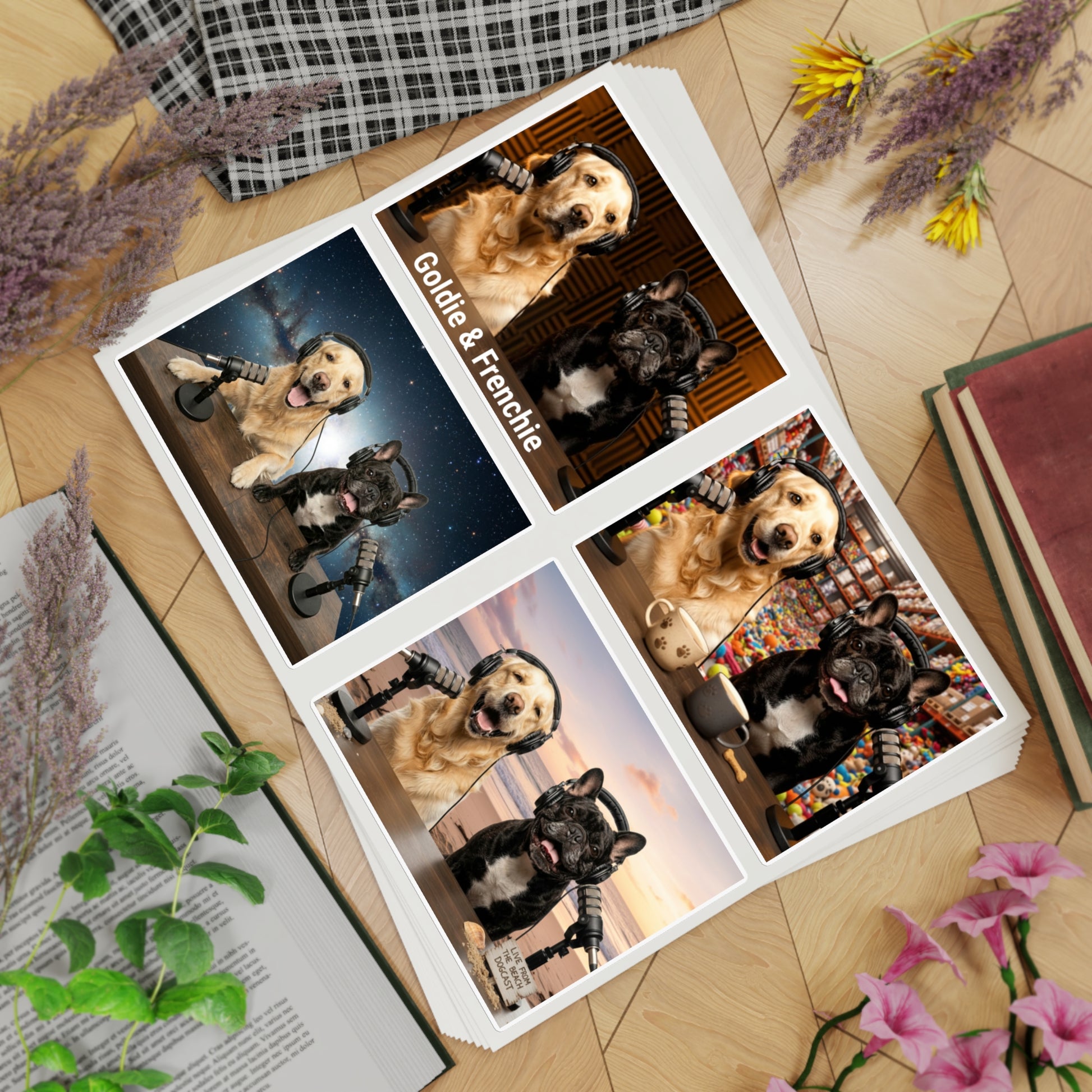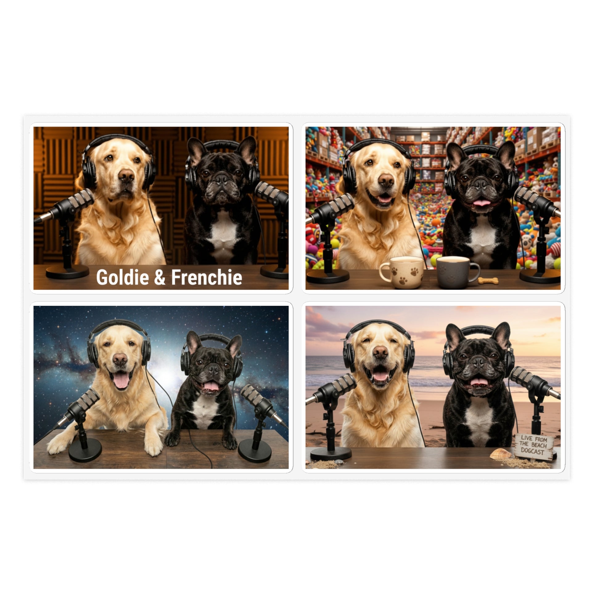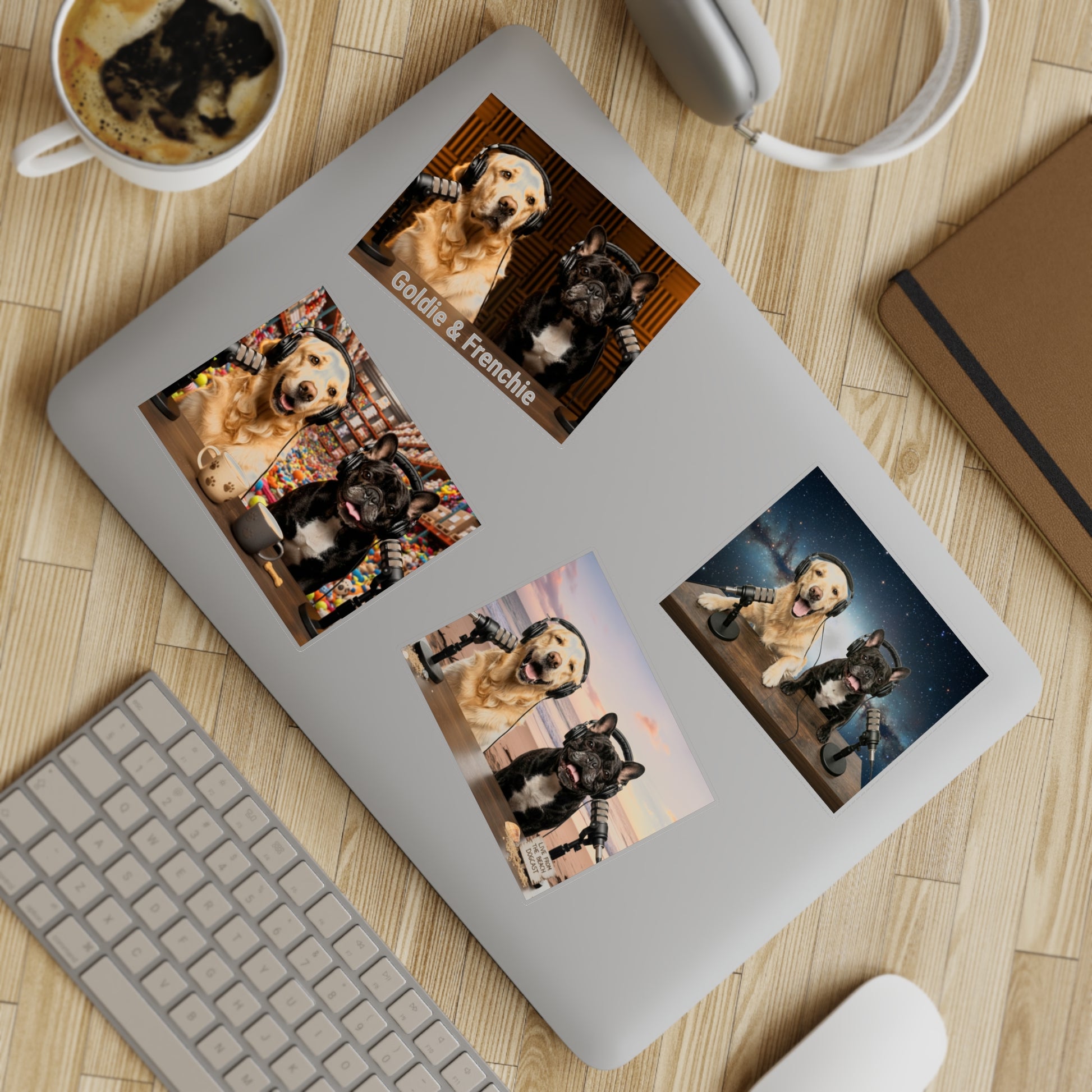 Add a pop of personality to your everyday essentials with these bright, playful sticker sheets. Each sheet includes four rectangular designs featuring your favorite two dogs, Goldie & Frenchie behind a podcast setup, captured in expressive, fun scenes that feel lively and full of character.