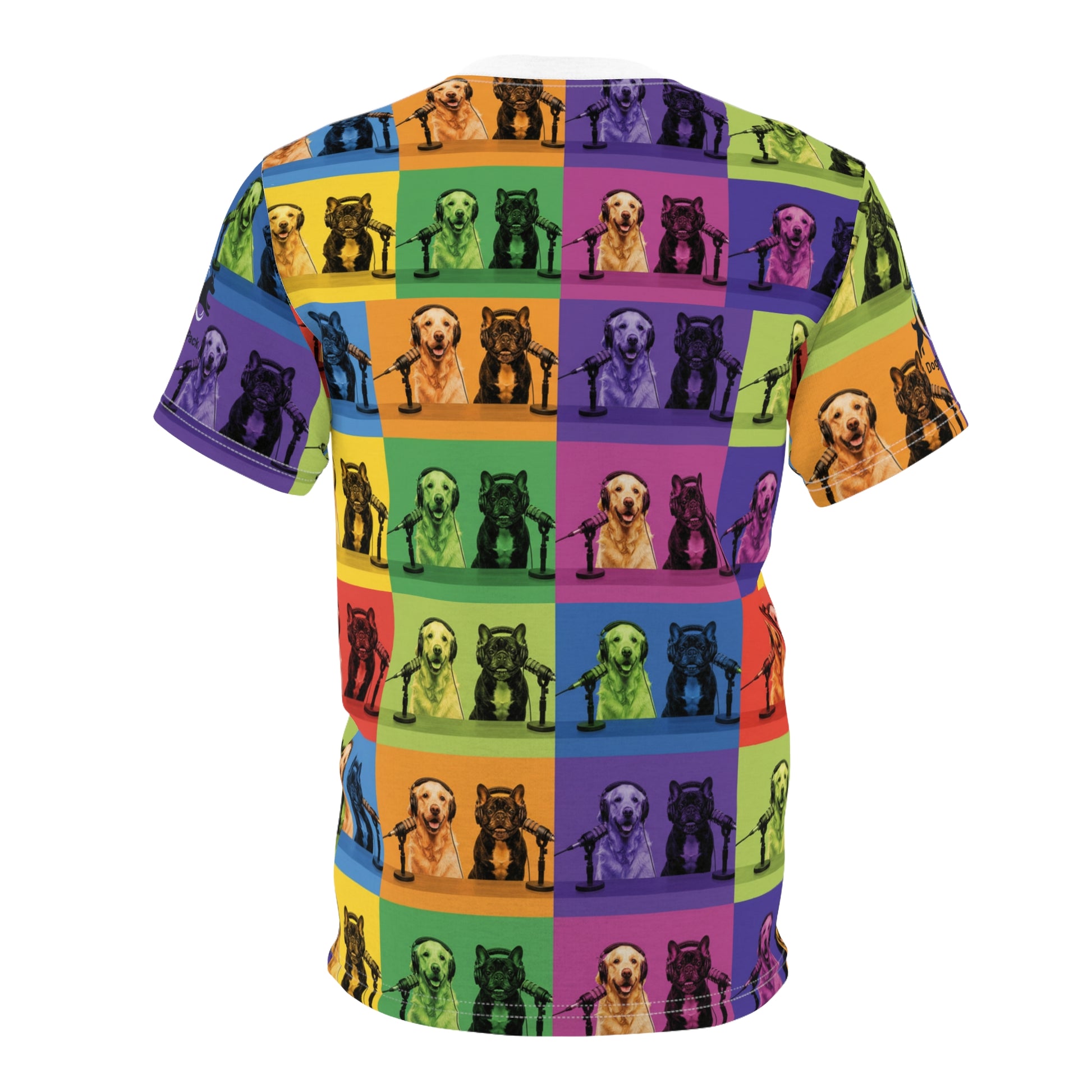 This all-over print tee celebrates Goldie & Frenchie in a bold, Warhol-inspired pop-art style. Repeating panels of the duo behind the mic burst with color and character, turning a classic podcast moment into wearable art. The rainbow grid feels playful, iconic, and instantly recognizable — made for fans who love expressive design and don’t shy away from standing out. Lightweight polyester keeps the colors vivid and crisp while staying comfortable through everyday wear. From casual outings to weekend hangs, this tee brings personality, humor, and a little creative energy to any look. Thoughtful details like a tagless collar, reinforced shoulders, and a smooth ribbed neckline make it easy to wear, wash, and repeat.