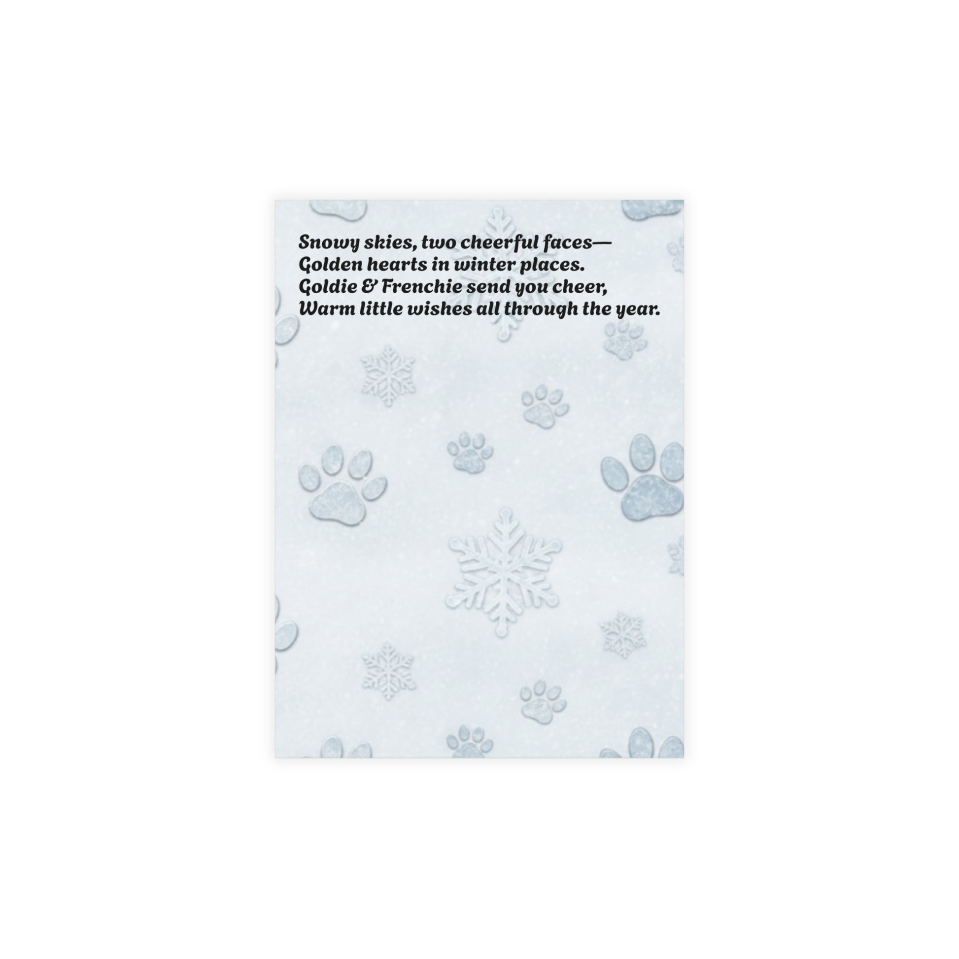 Share a little warmth, cheer, and Goldie & Frenchie magic this season. These custom postcards turn your holiday message into a moment — from the snowy paw-print backdrop and cozy winter poem on the reverse side to the joyful, headphone-wearing duo on the front wishing everyone a “Happy Holidays!” Their friendly faces and bright colors make each card feel like a smile you can mail.